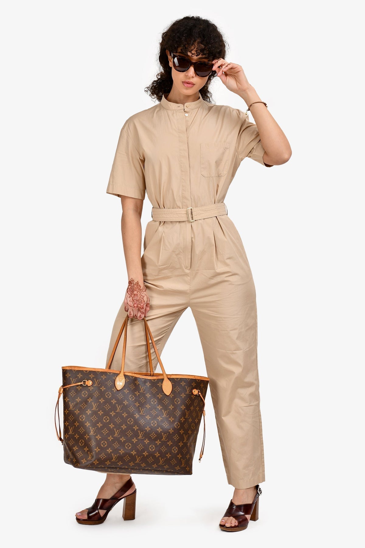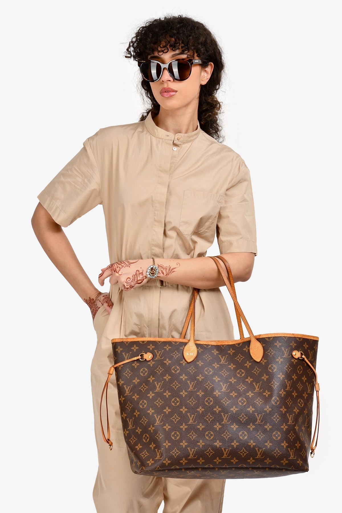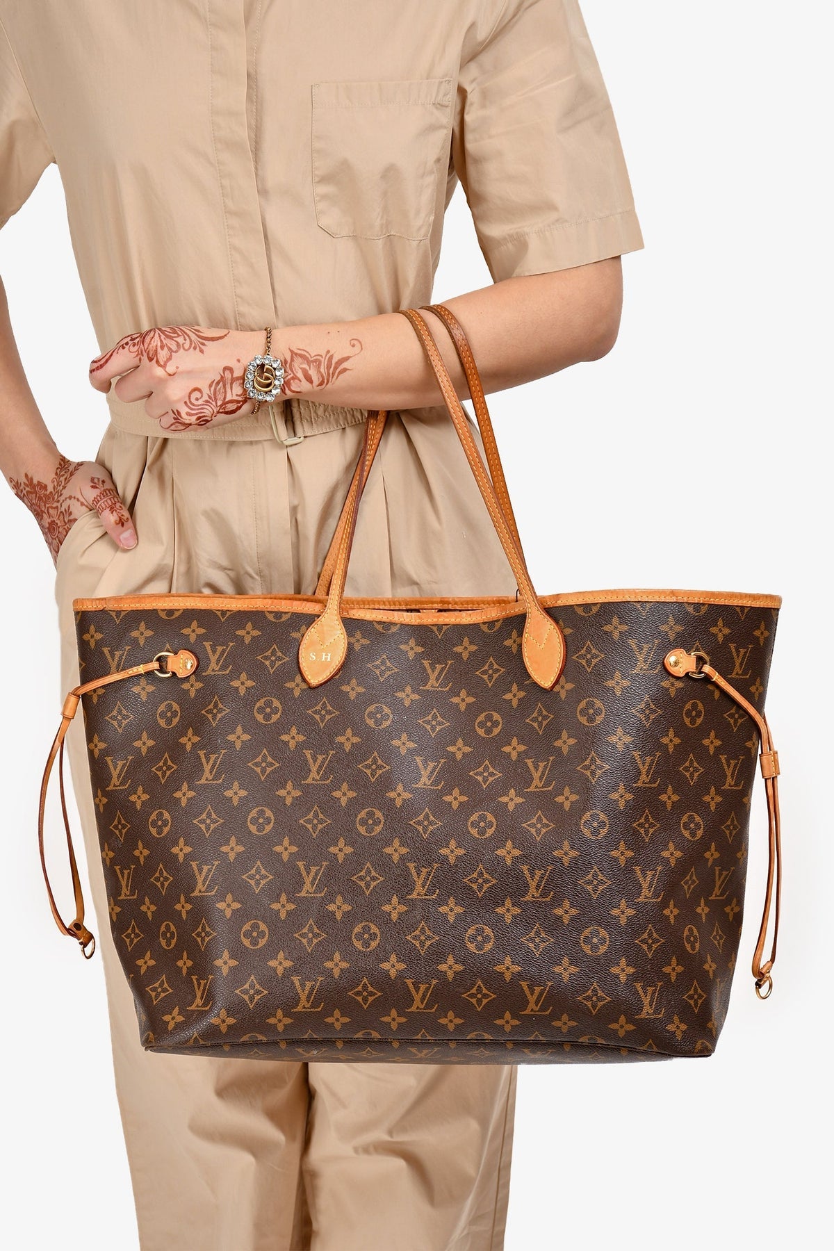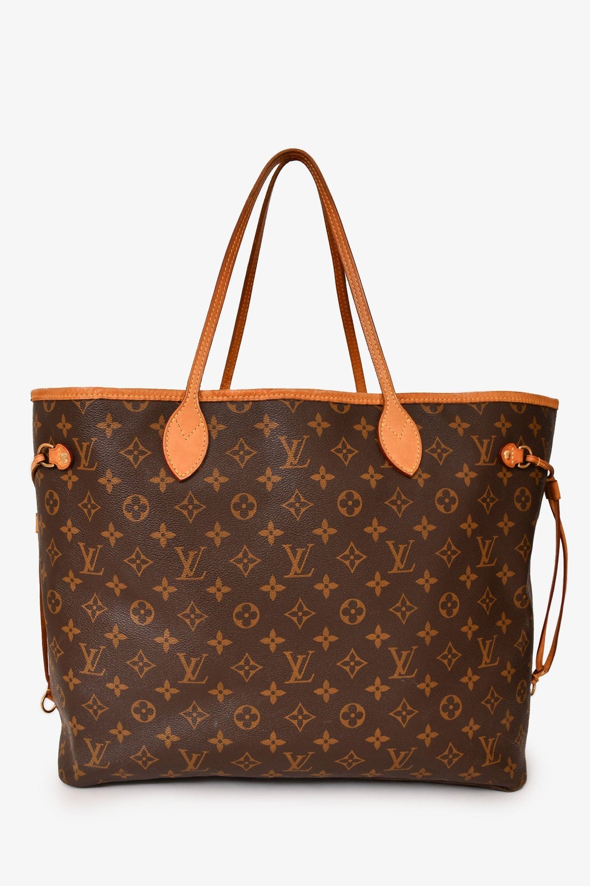 Louis Vuitton 2014 Monogram Neverfull GM Tote with Initials. Top lobster clasp closure. Single interior zip pocket. Beige textile interior lining. Gold-toned hardware. Tonal stitching.
