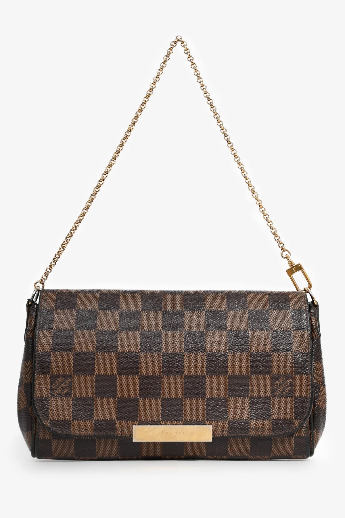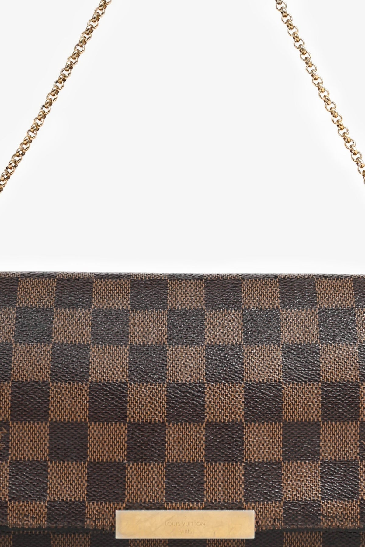 Louis Vuitton 2014 Damier Ebene Favourite MM Chain Shoulder Bag. Gold-tone hardware. Fold-over flap with a magnetic closure. Chain-link shoulder strap. Lined interior with a slip pocket. Tonal stitching.