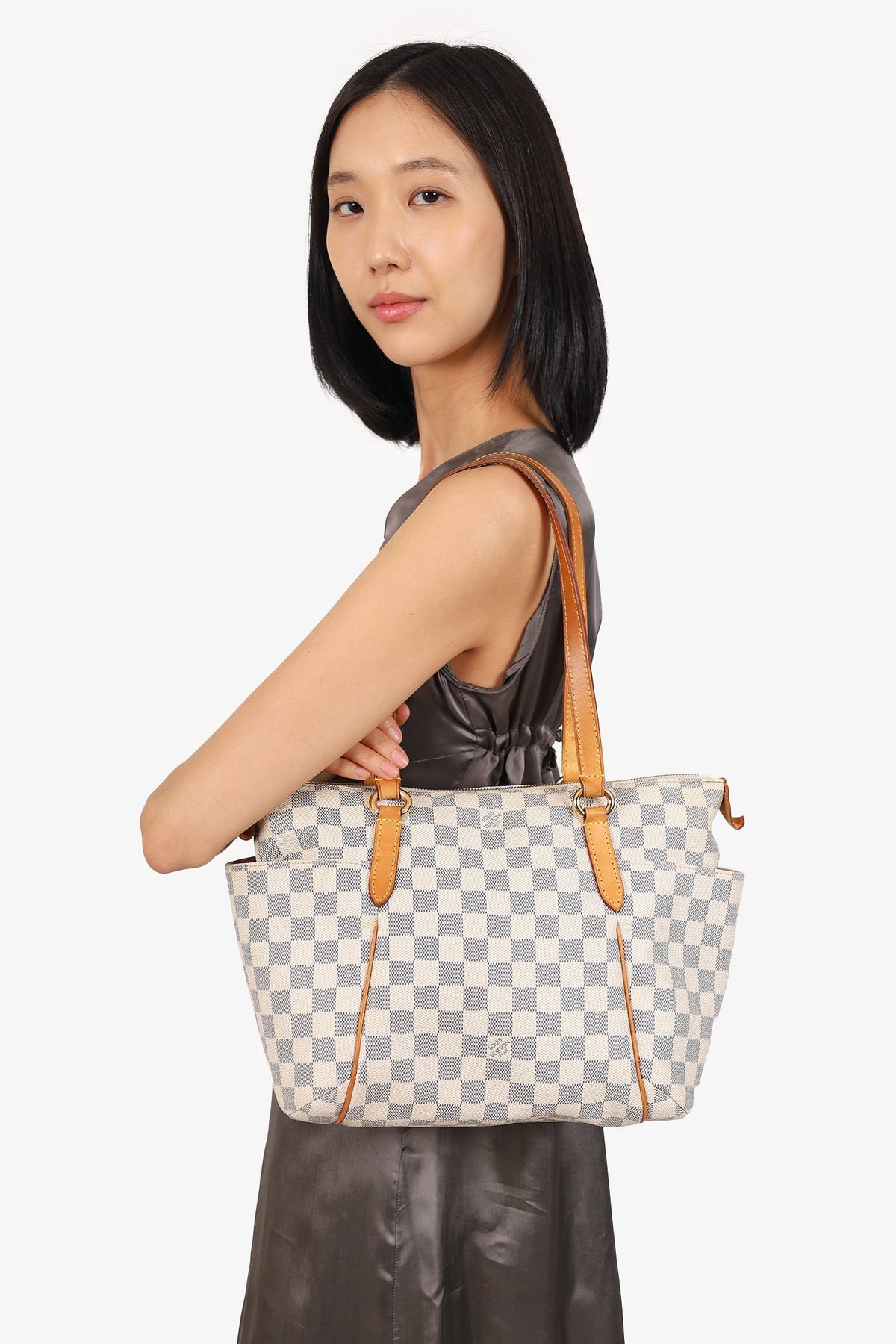 Condition: This item is in good New condition with some minor signs of use on pouch and tote interior. Some subtle marks on bottom of bag. Scratches to hardware.