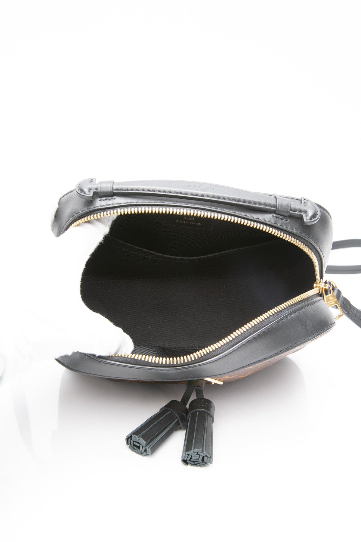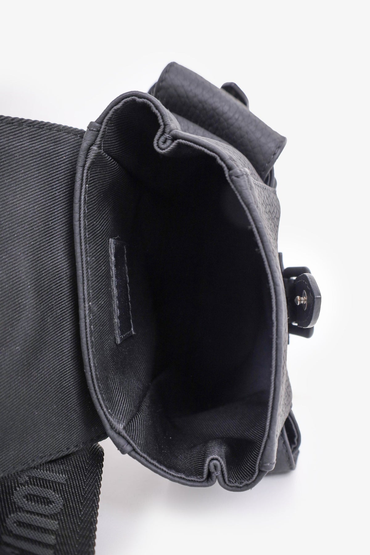 Louis Vuitton Black Monogram Shadow Calfskin Discovery Bumbag PM. Double-ended front zip closure. Open interior with cotton lining. 1 exterior rear zip pocket. Adjustable strap with buckle closure. Tonal stitching. Dark-metal tone hardware.