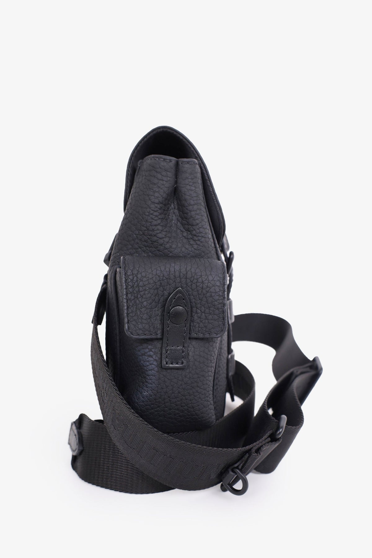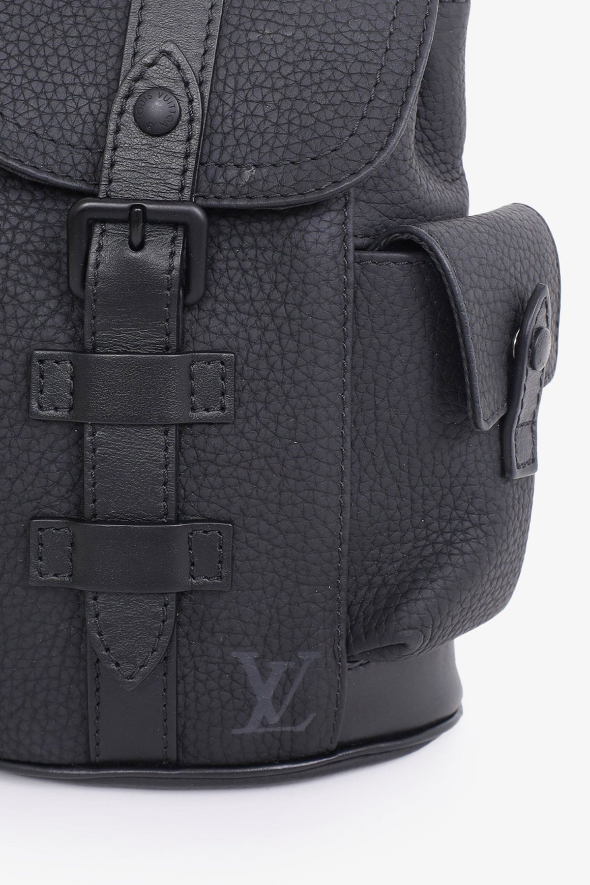 Louis Vuitton Black Taurillon Christopher XS Backpack. Two exterior pockets. Embossed logo detailing on front. Adjustable strap. Black-tone hardware. Tonal stitching.