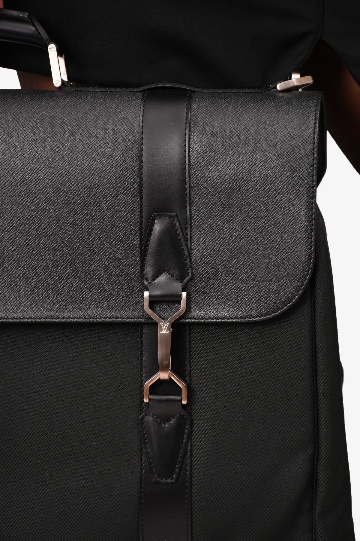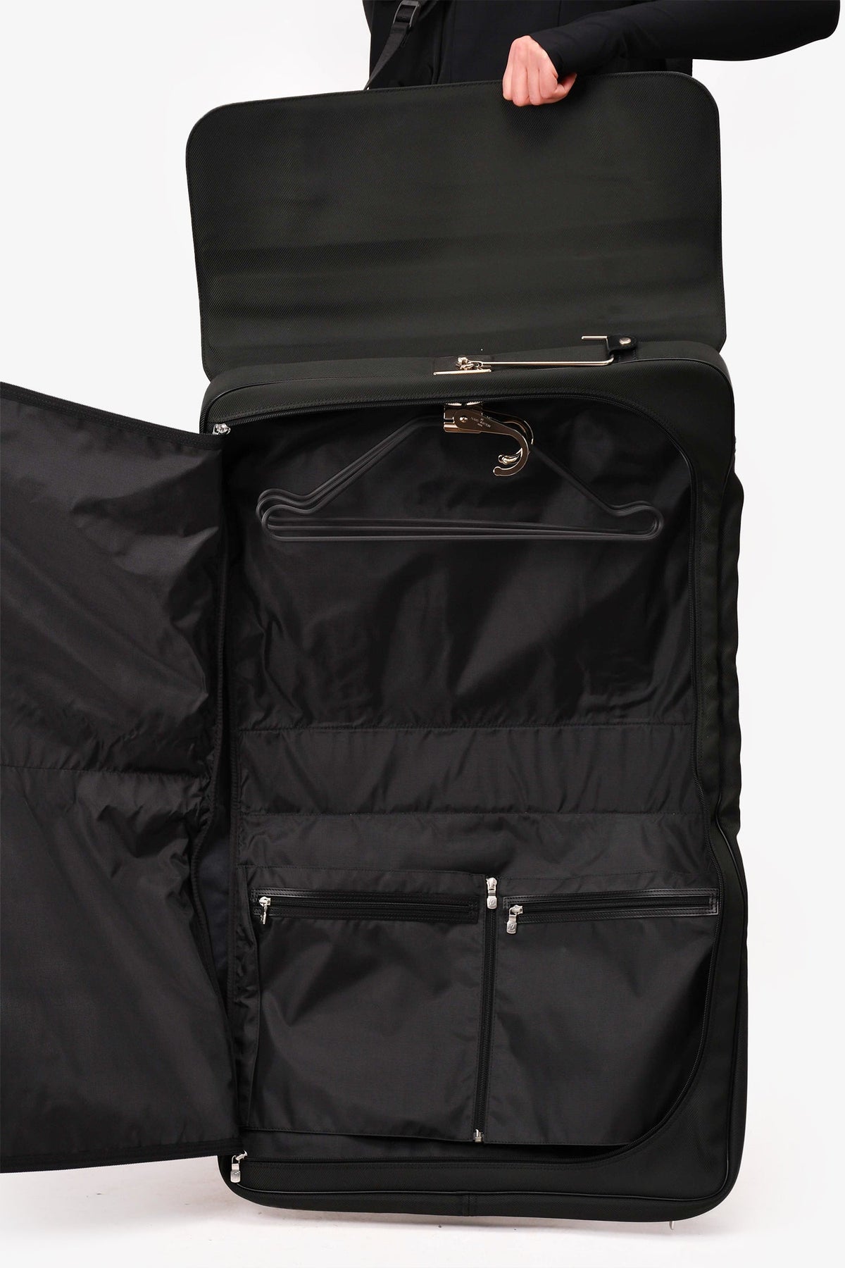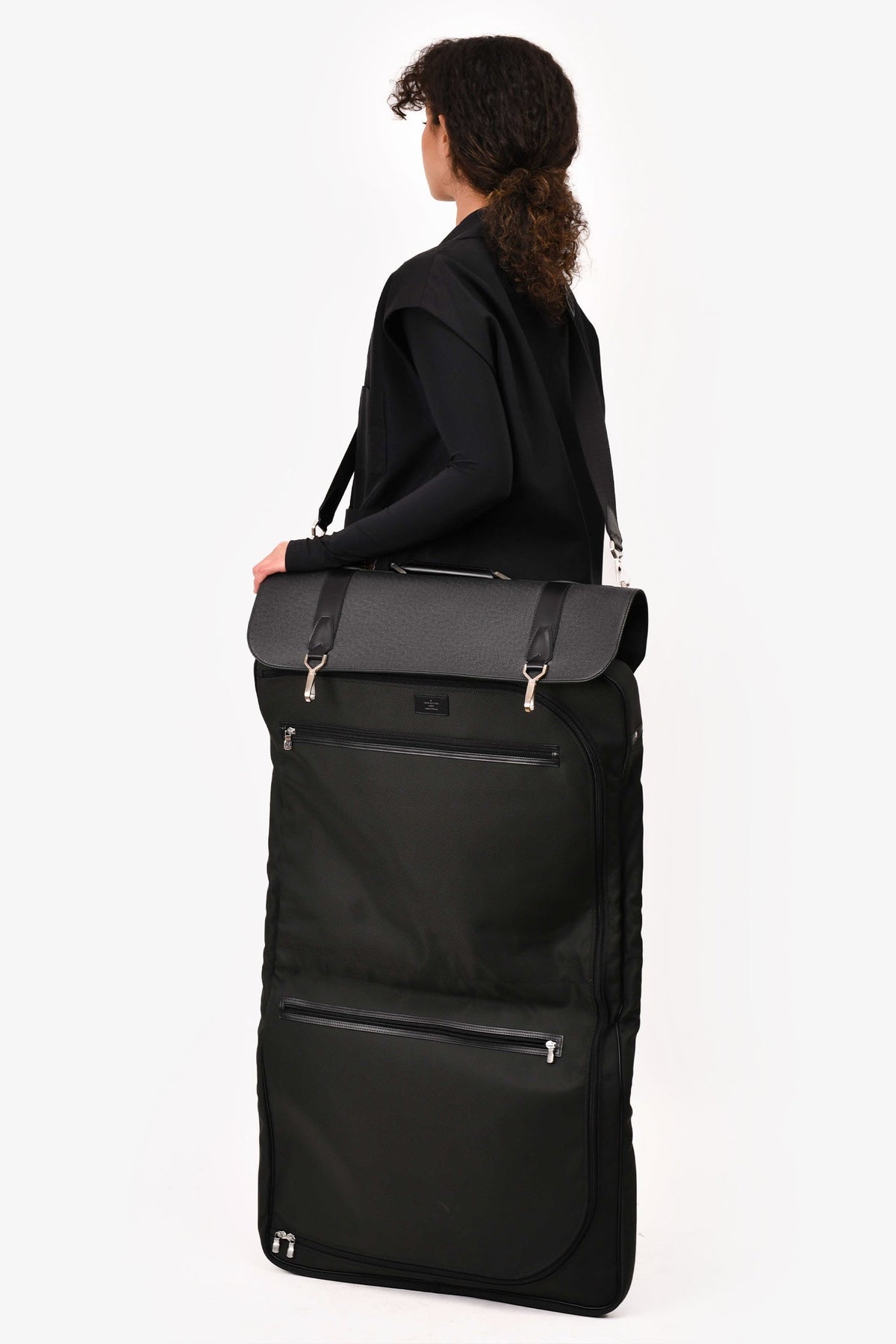 Regular price $1,810.00 Sale price $480.00 Save $1,330.00Louis Vuitton Black Taiga Leather/Nylon Folding Garment Bag. Silver-tone hardware. Leather trimming. 4 exterior zipped compartments. Fold-over flap with a clasp closures. Nylon exterior throughout. Webbed strap. Rolled leather handle.