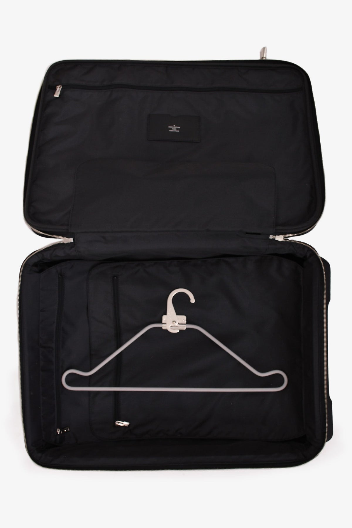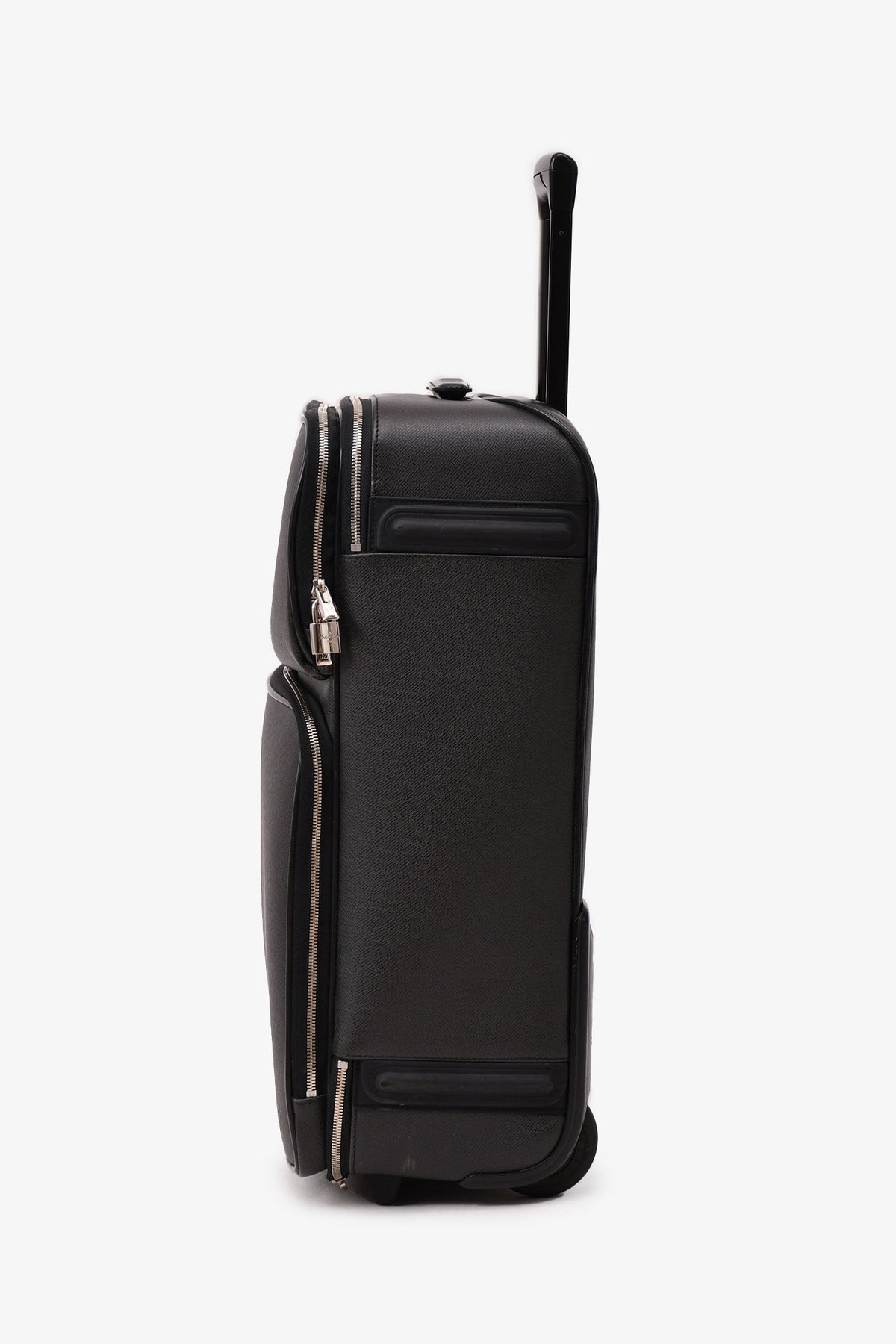 Regular price $1,860.00 Sale price $470.00 Save $1,390.00Louis Vuitton Black Taiga Leather Pegase 55 Suitcase With Garment Bag + Cosmetic Pouch. Cosmetic pouch with top zipper closure. Hangers in garment bag. Silver-tone hardware. Flat Handle. Dual Exterior Pockets. Nylon Lining & Three Interior Pockets with Card Slots. Zip Closure at Side. Includes Luggage Tag. Tonal stitching.