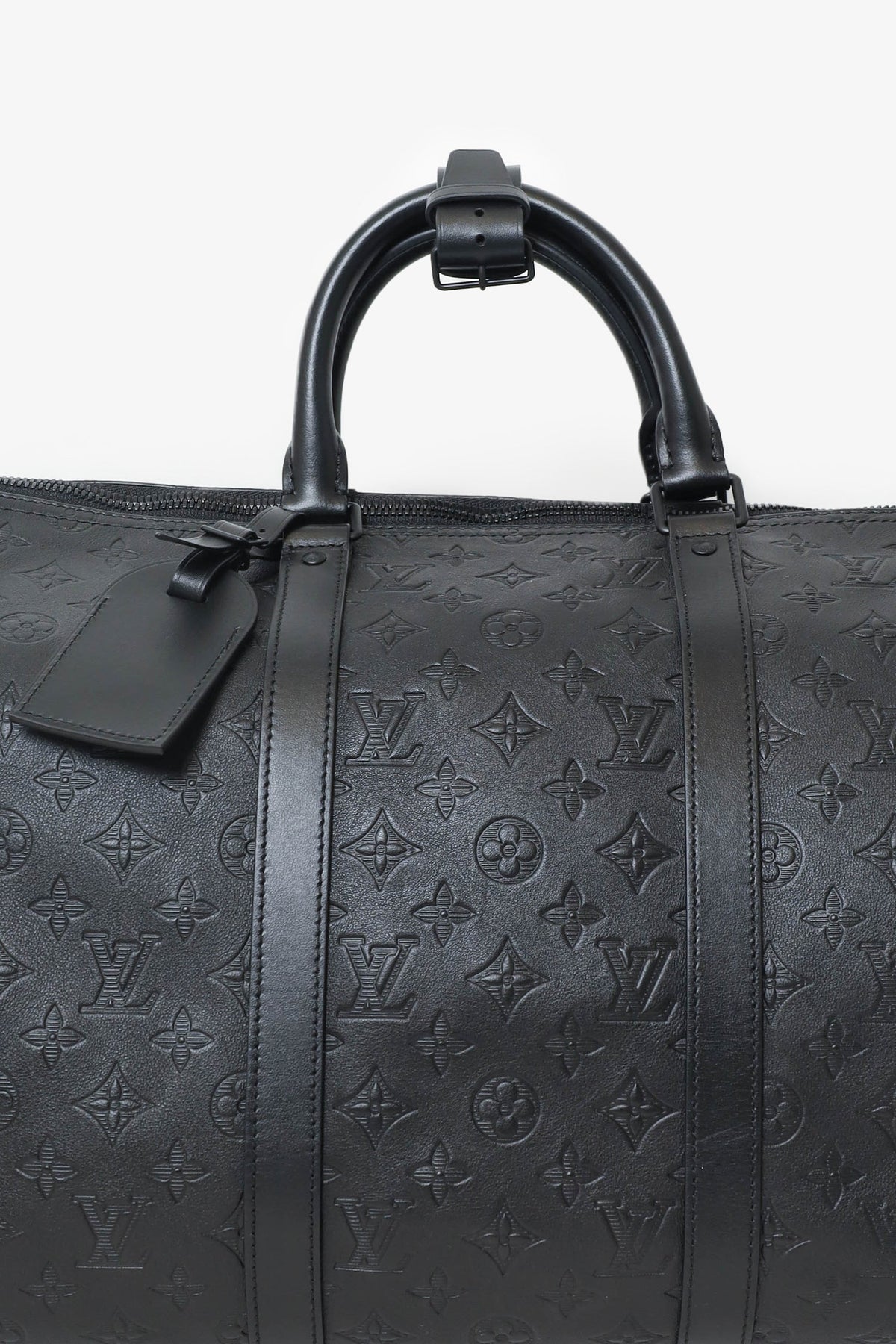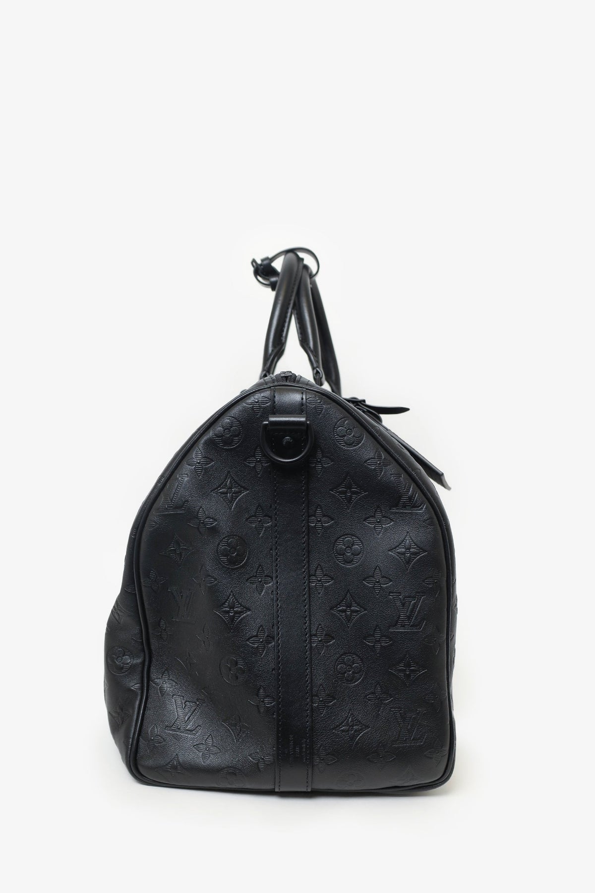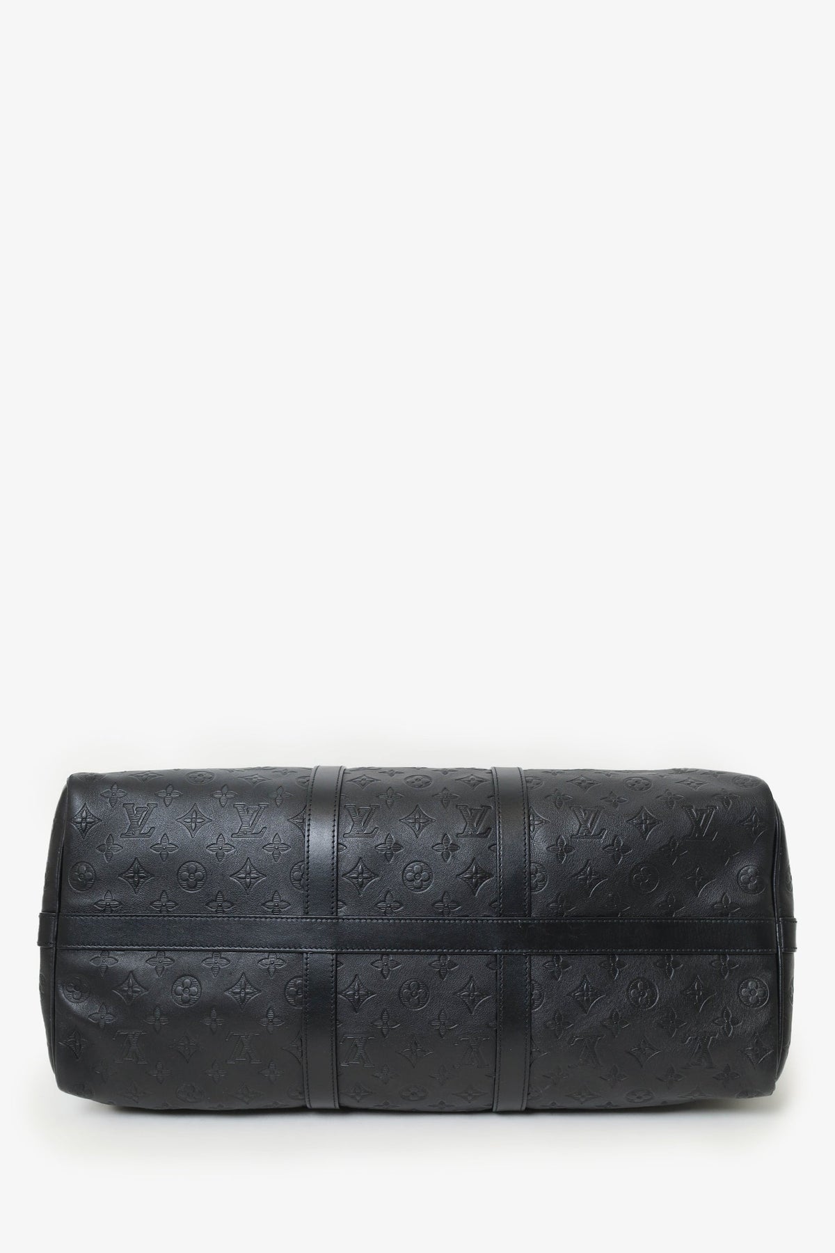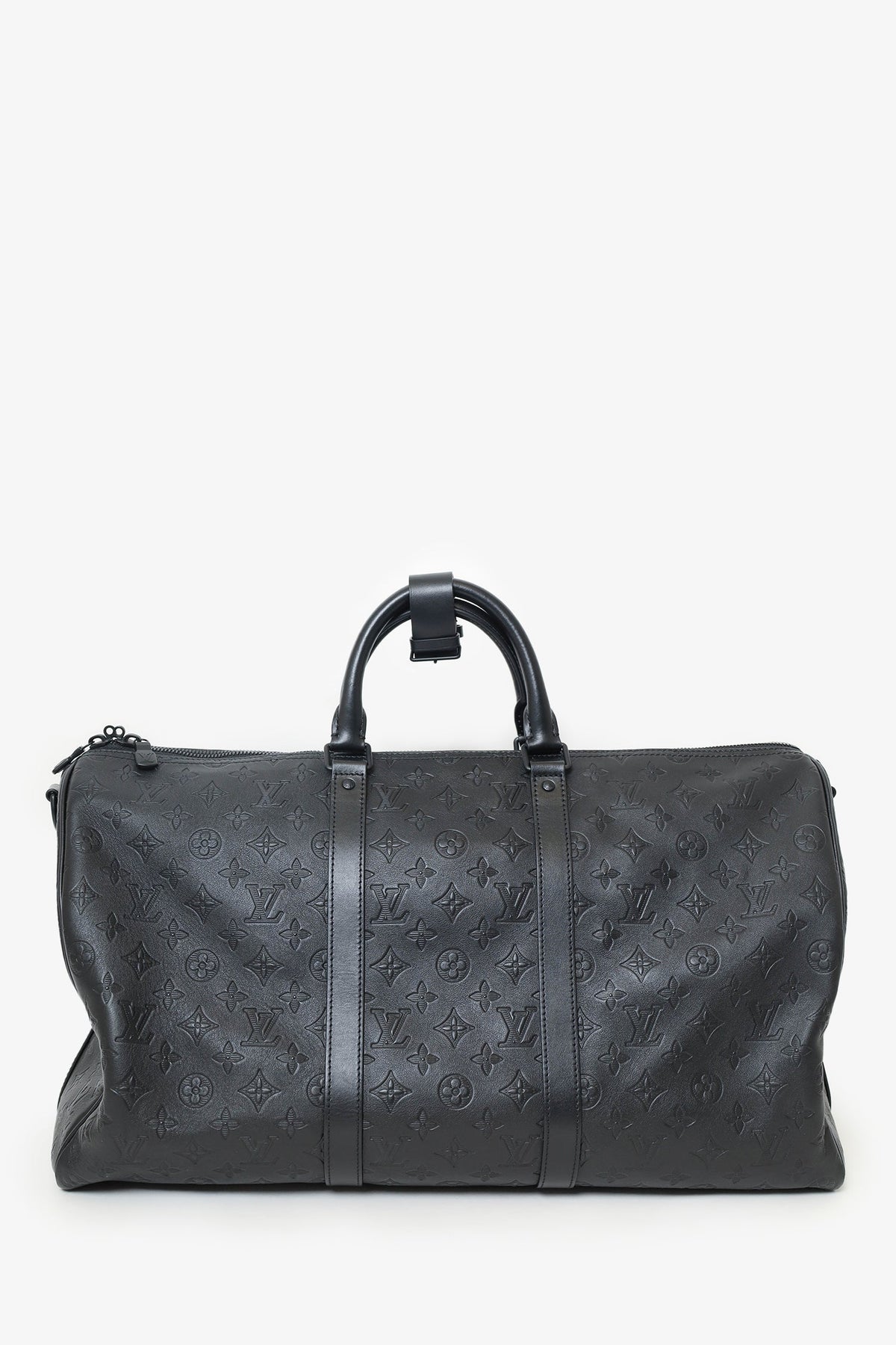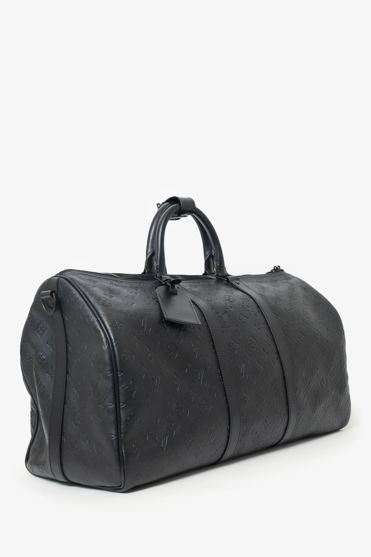 Louis Vuitton Black Monogram Shadow Leather Keepall Bandouliere 50 with Strap. Top zip closure. Interior wall pocket with zip closure. Top handle. Adjustable removable strap. Tonal stitching.