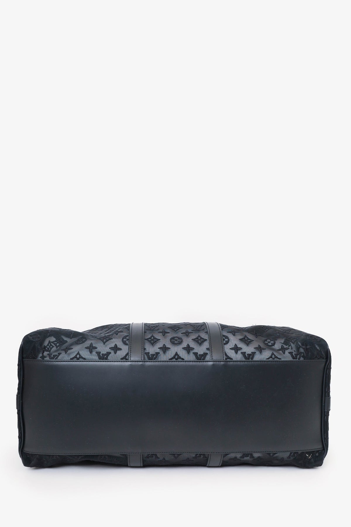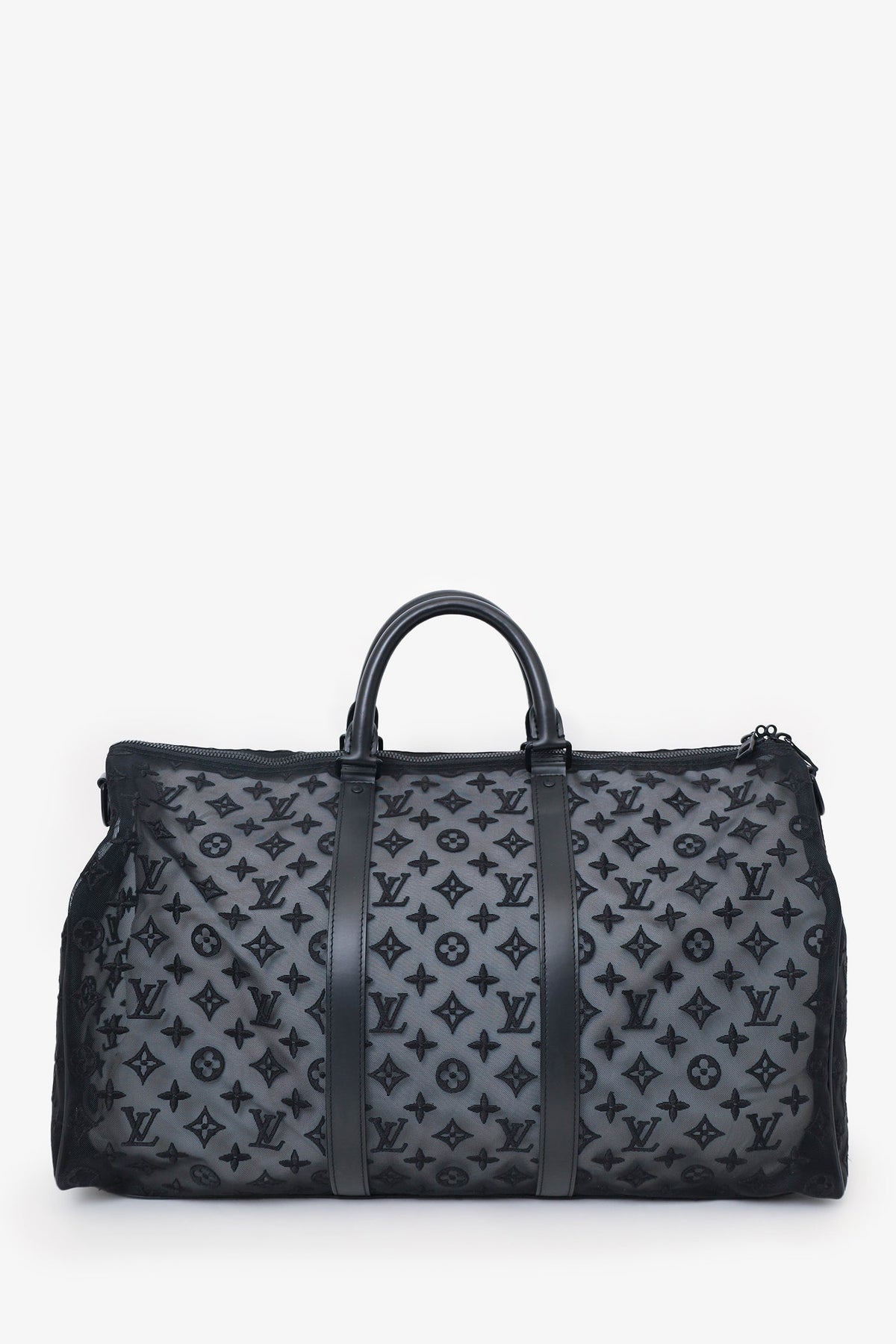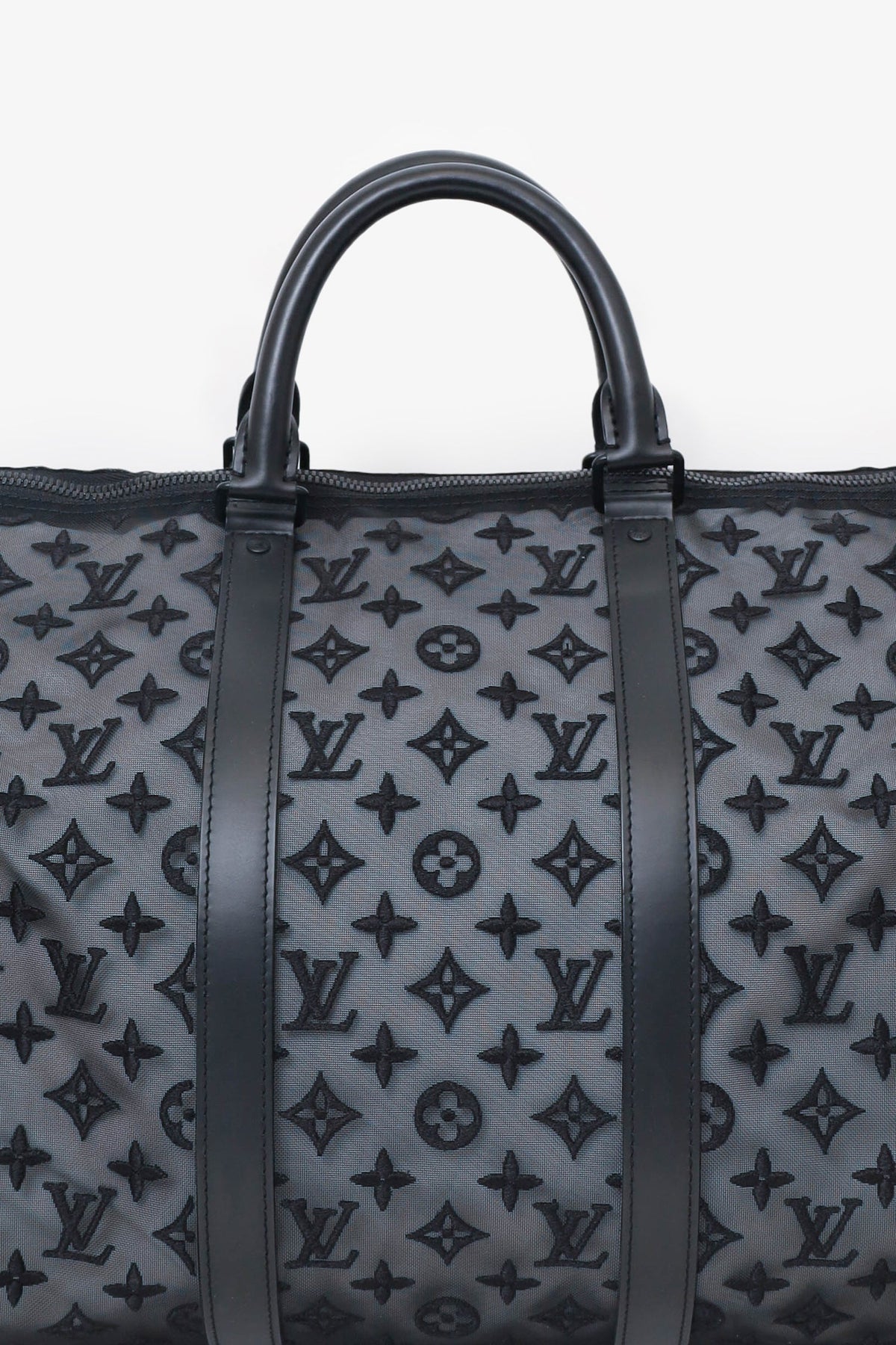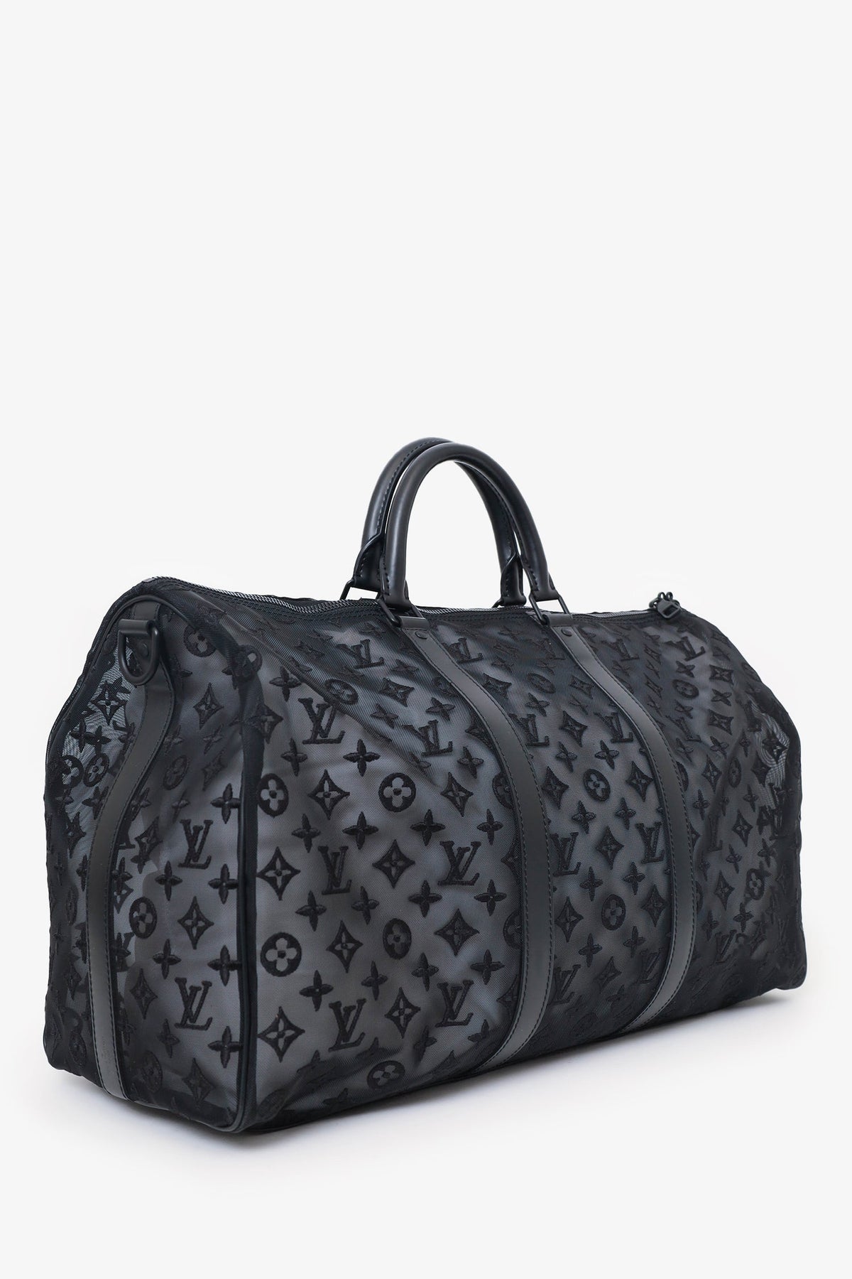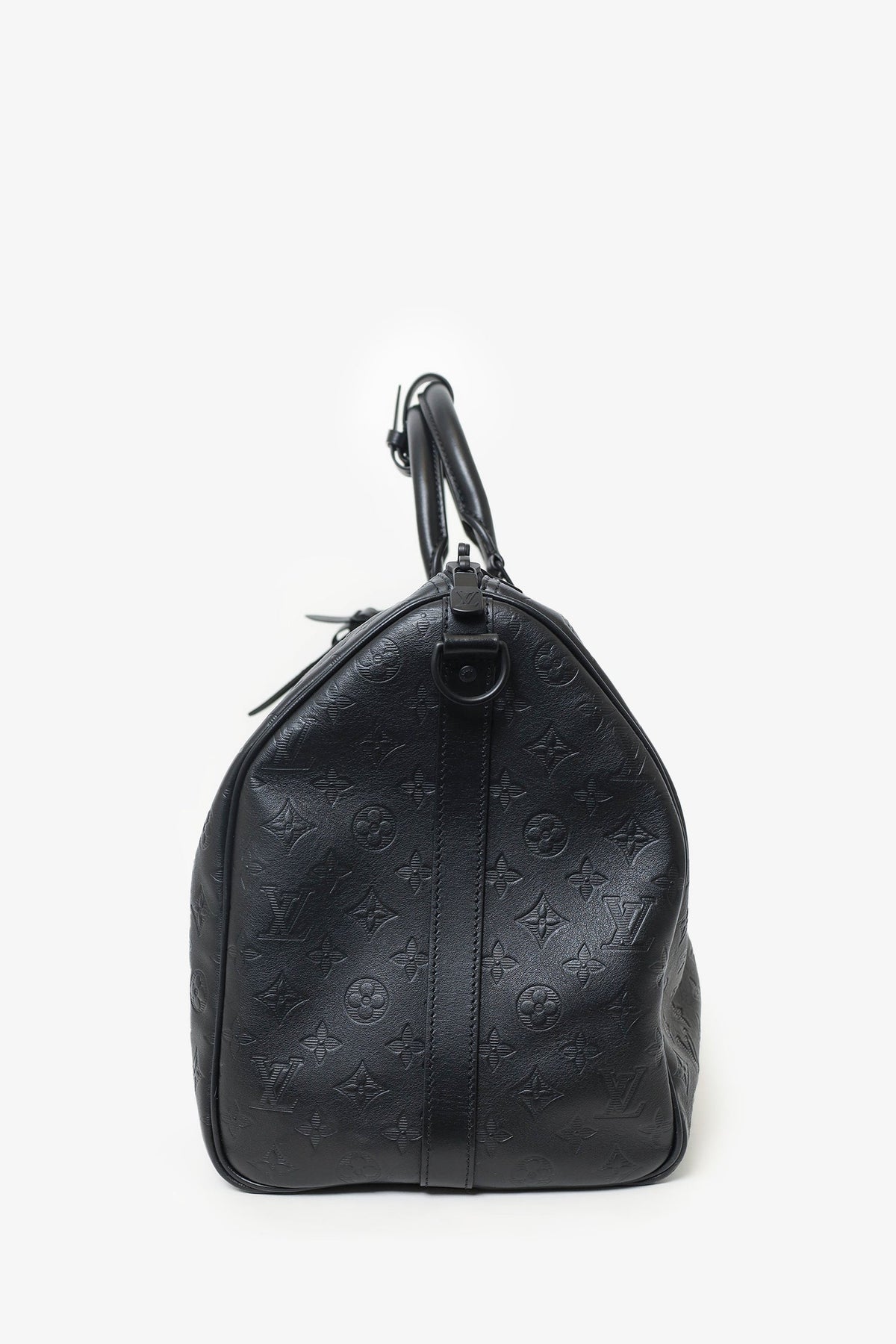 Louis Vuitton Black Monogram Shadow Leather Keepall Bandouliere 50 with Strap. Top zip closure. Interior wall pocket with zip closure. Top handle. Adjustable removable strap. Tonal stitching.