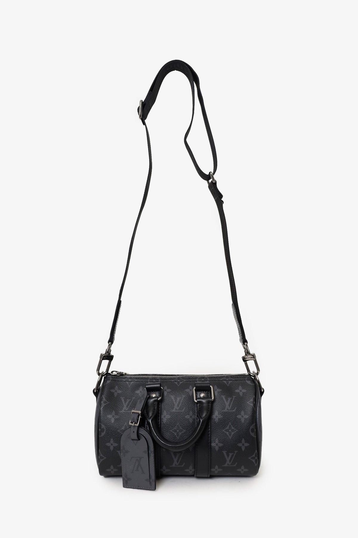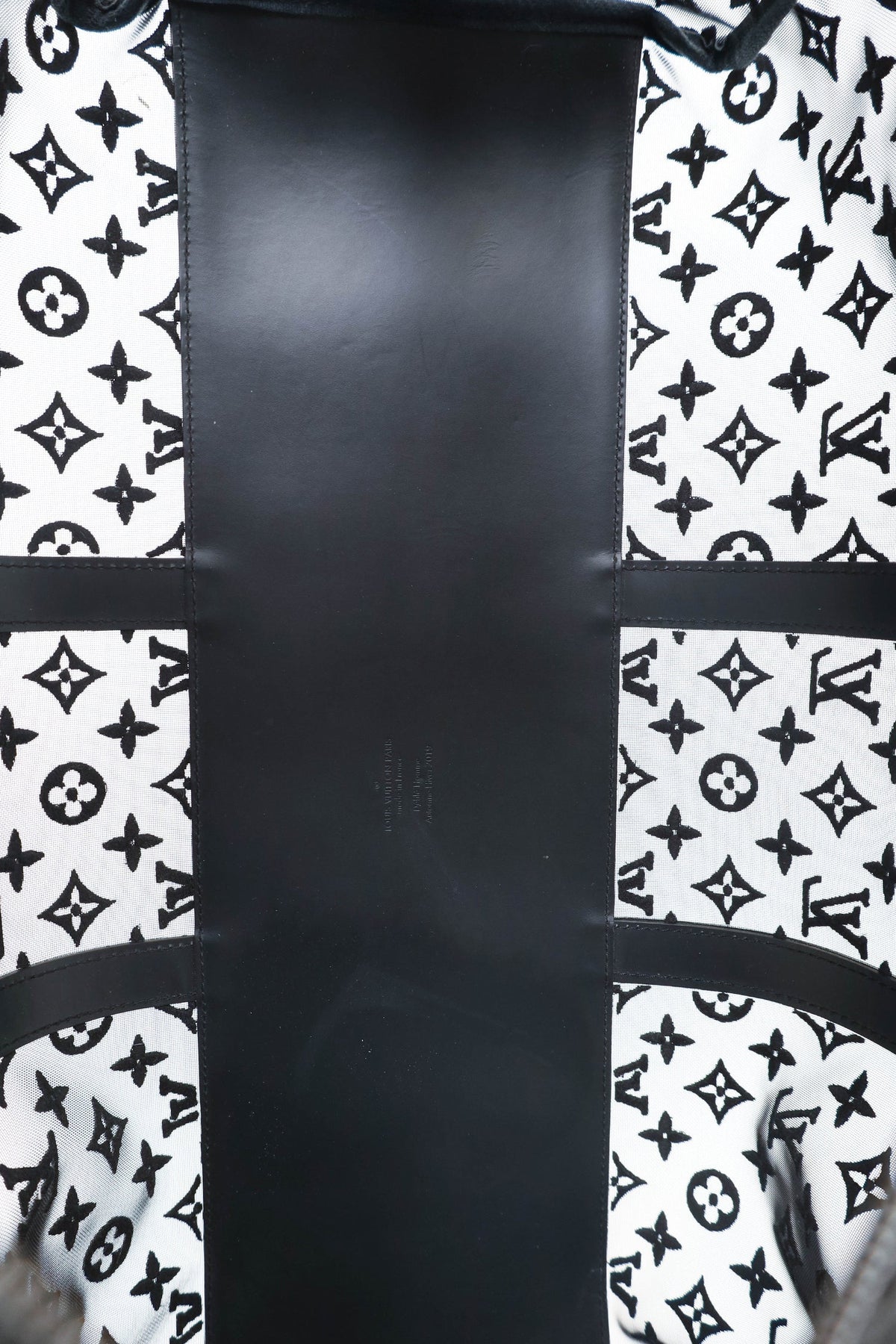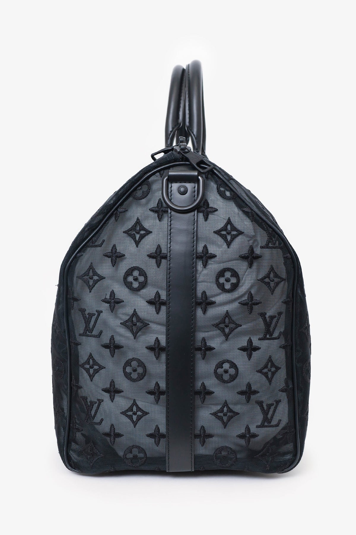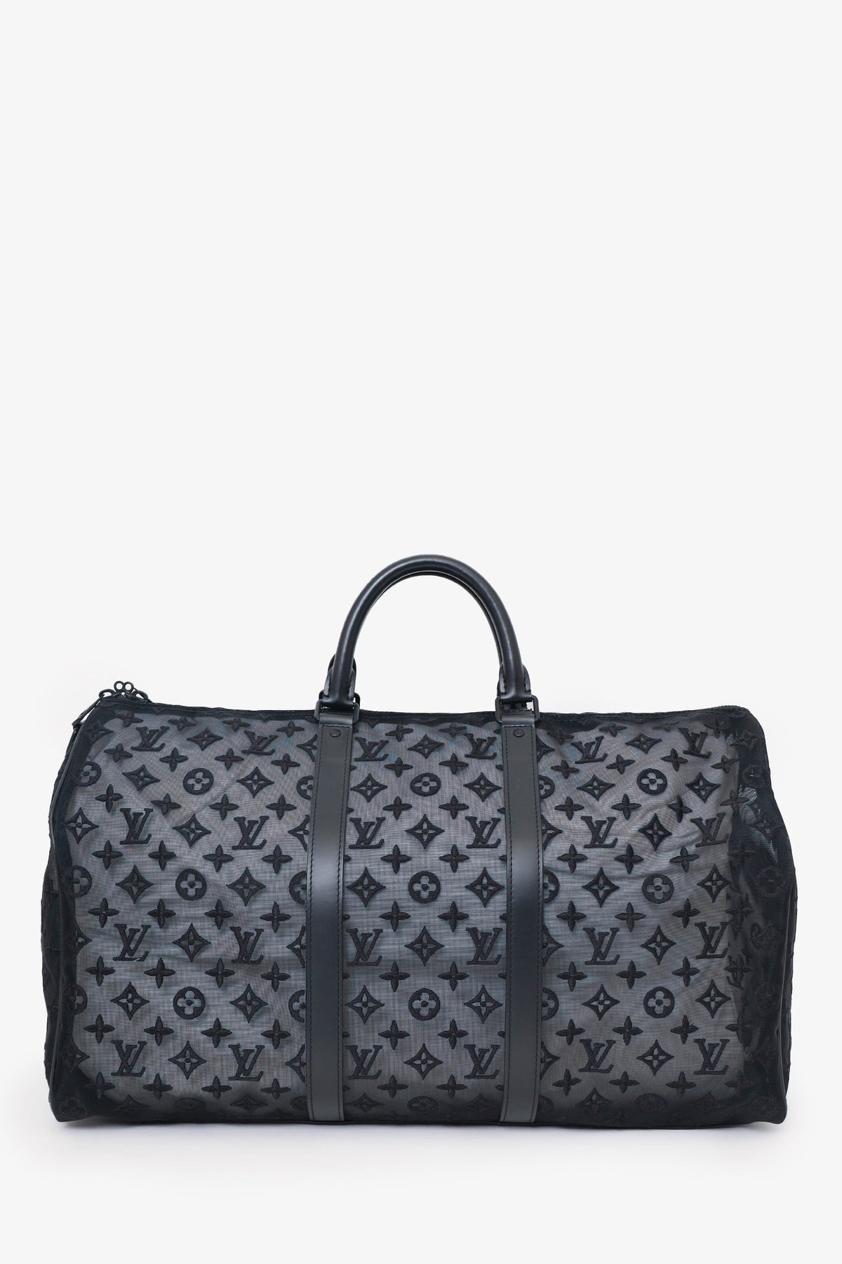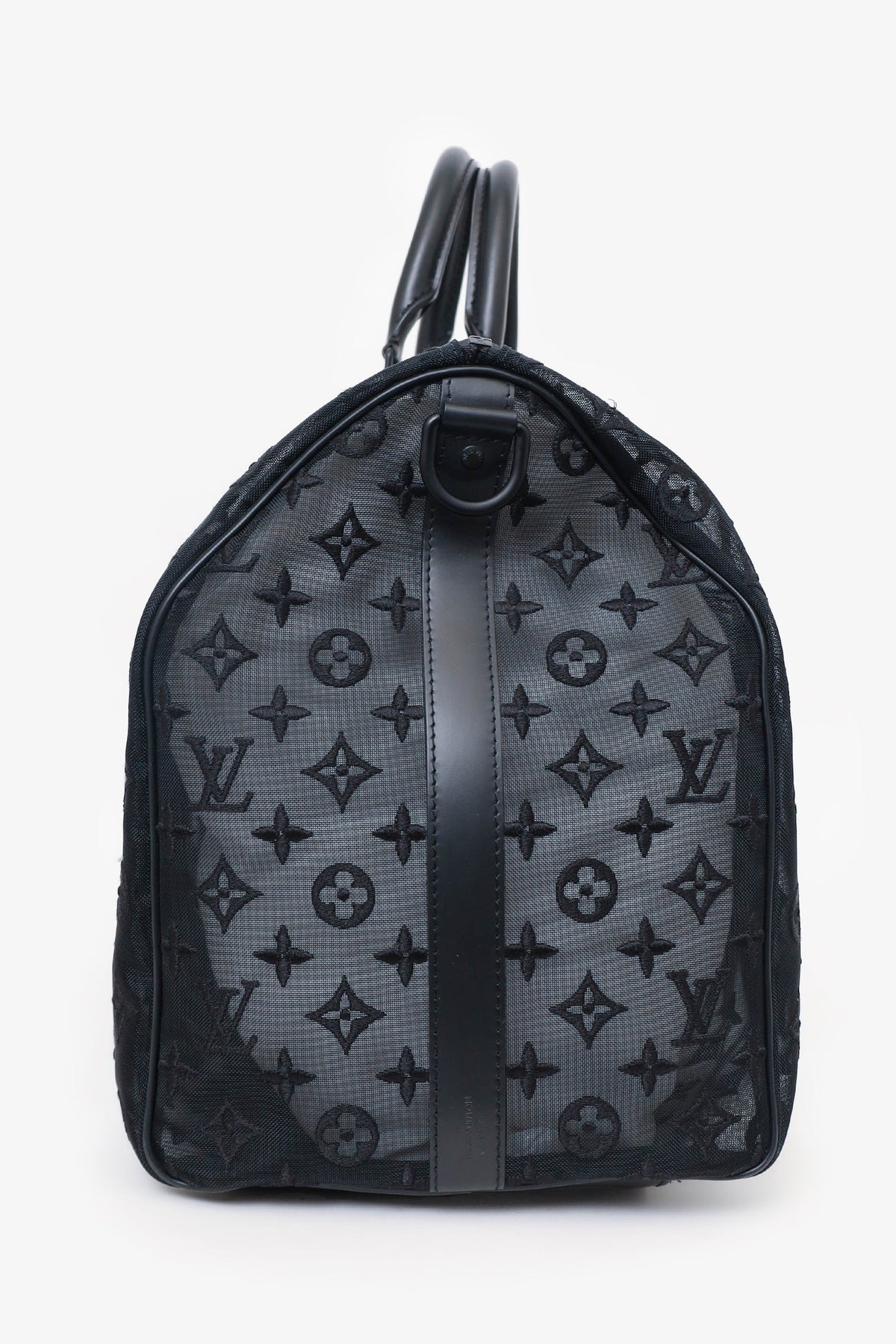 Louis Vuitton Black Monogram Shadow Leather Keepall Bandouliere 50 with Strap. Top zip closure. Interior wall pocket with zip closure. Top handle. Adjustable removable strap. Tonal stitching.
