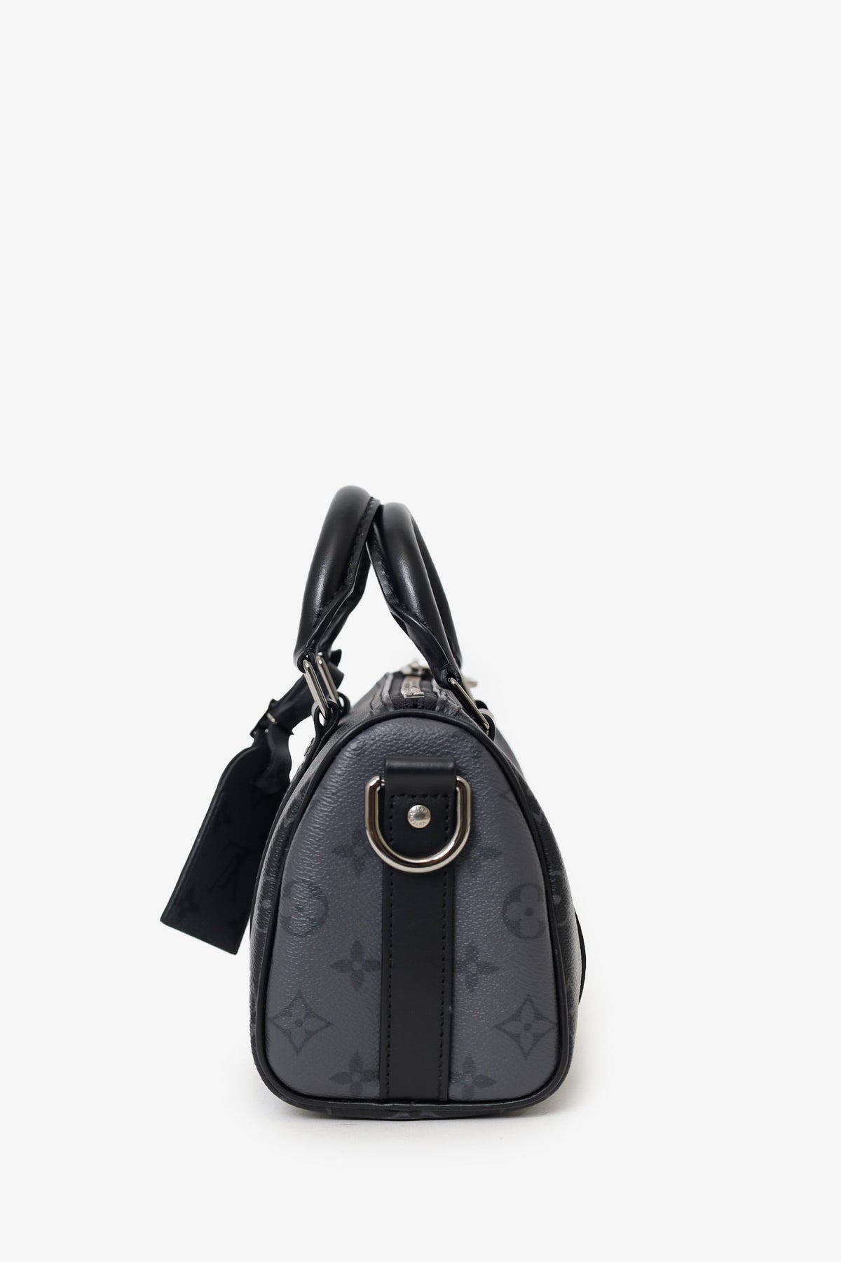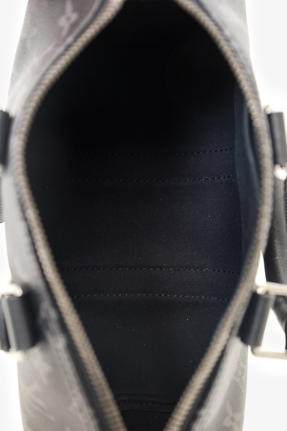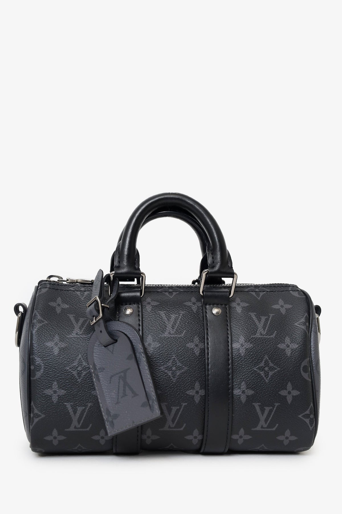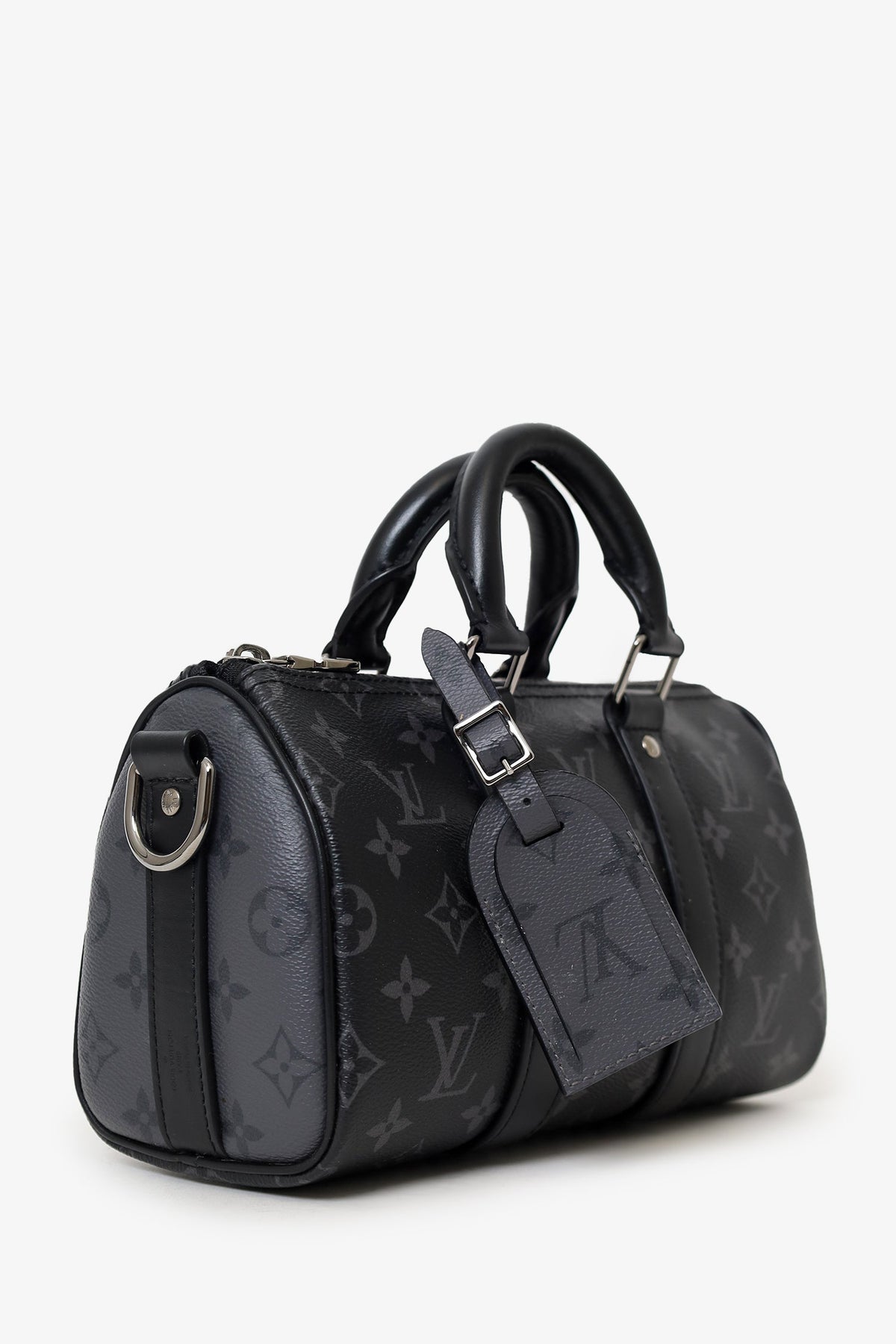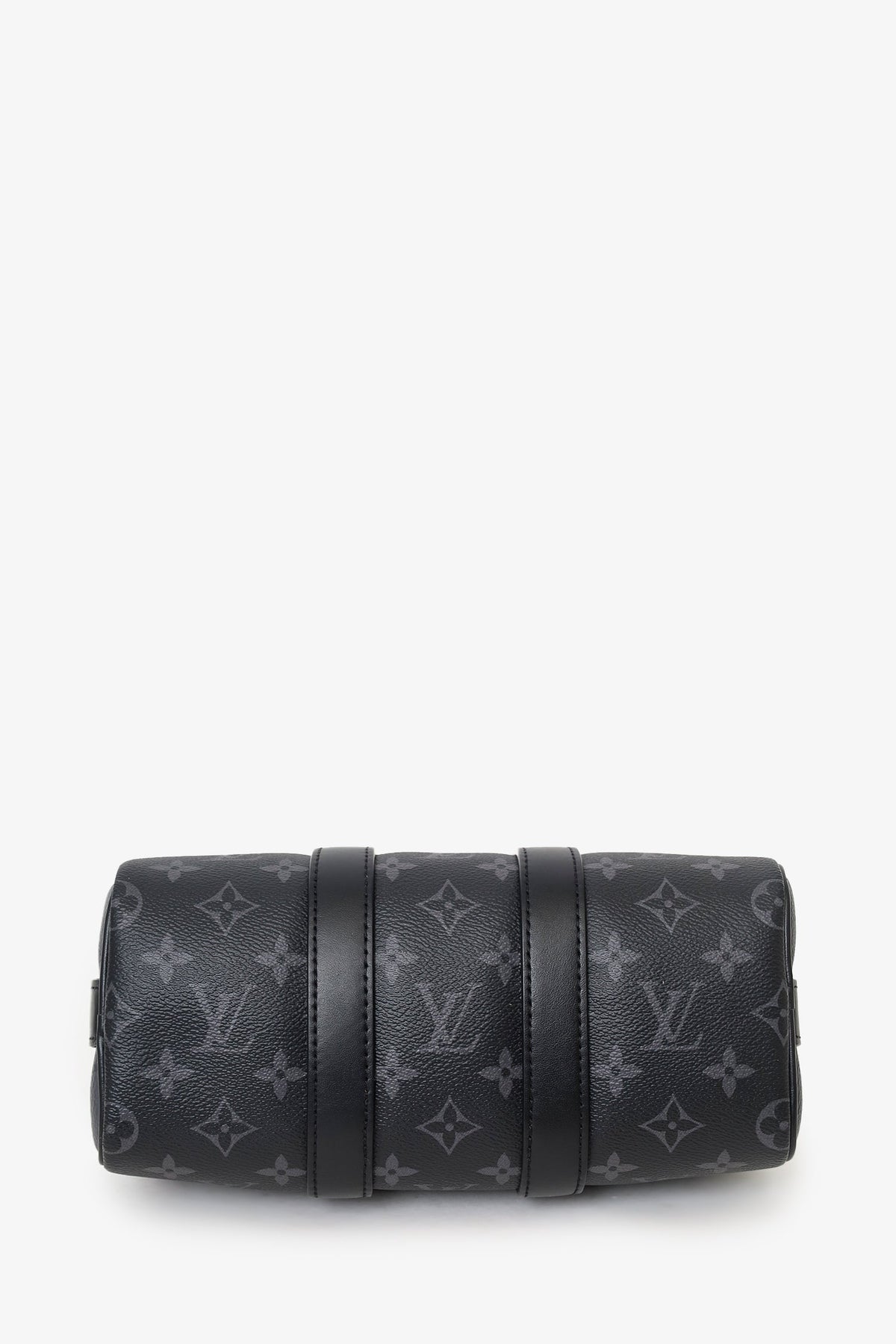 Louis Vuitton Black Monogram Shadow Leather Keepall Bandouliere 50 with Strap. Top zip closure. Interior wall pocket with zip closure. Top handle. Adjustable removable strap. Tonal stitching.
