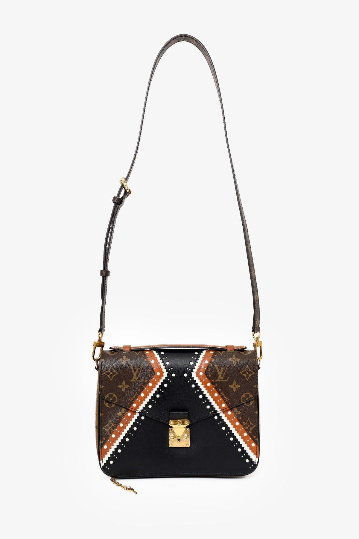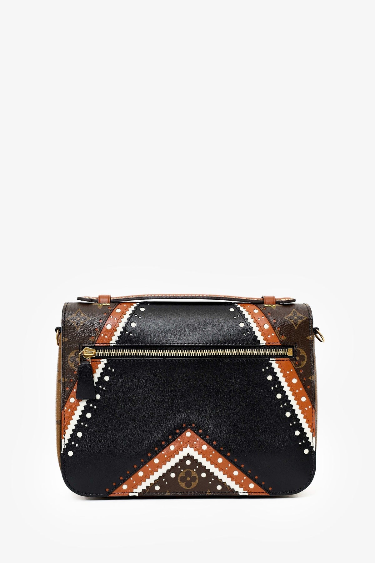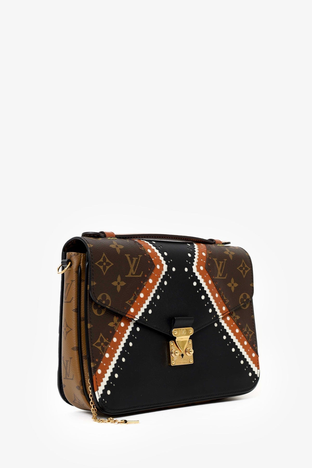 Regular price $1,910.00 Sale price $480.00 Save $1,430.00Louis Vuitton Black/Brown Leather Monogram Pochette Metis Brogue Bag with Strap. Push lock closure. 2 interior compartments. Rear exterior zip pocket. Top handle. Removable adjustable crossbody strap. Gold-tone hardware. Tonal stitching.