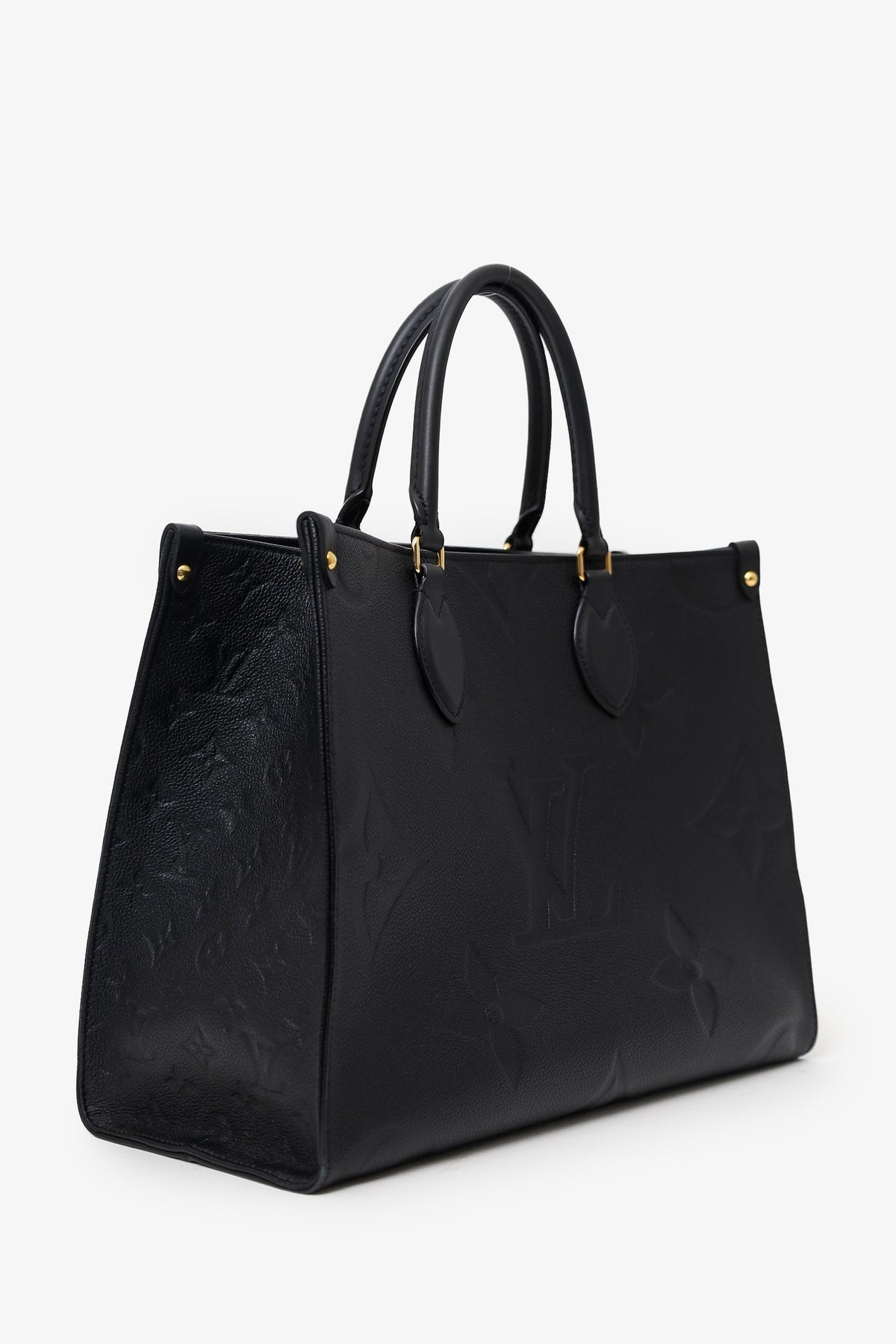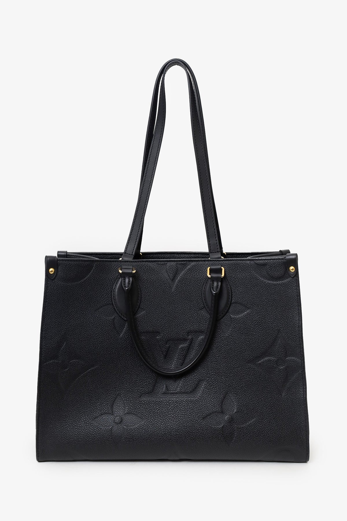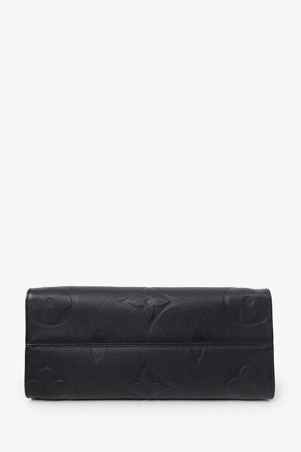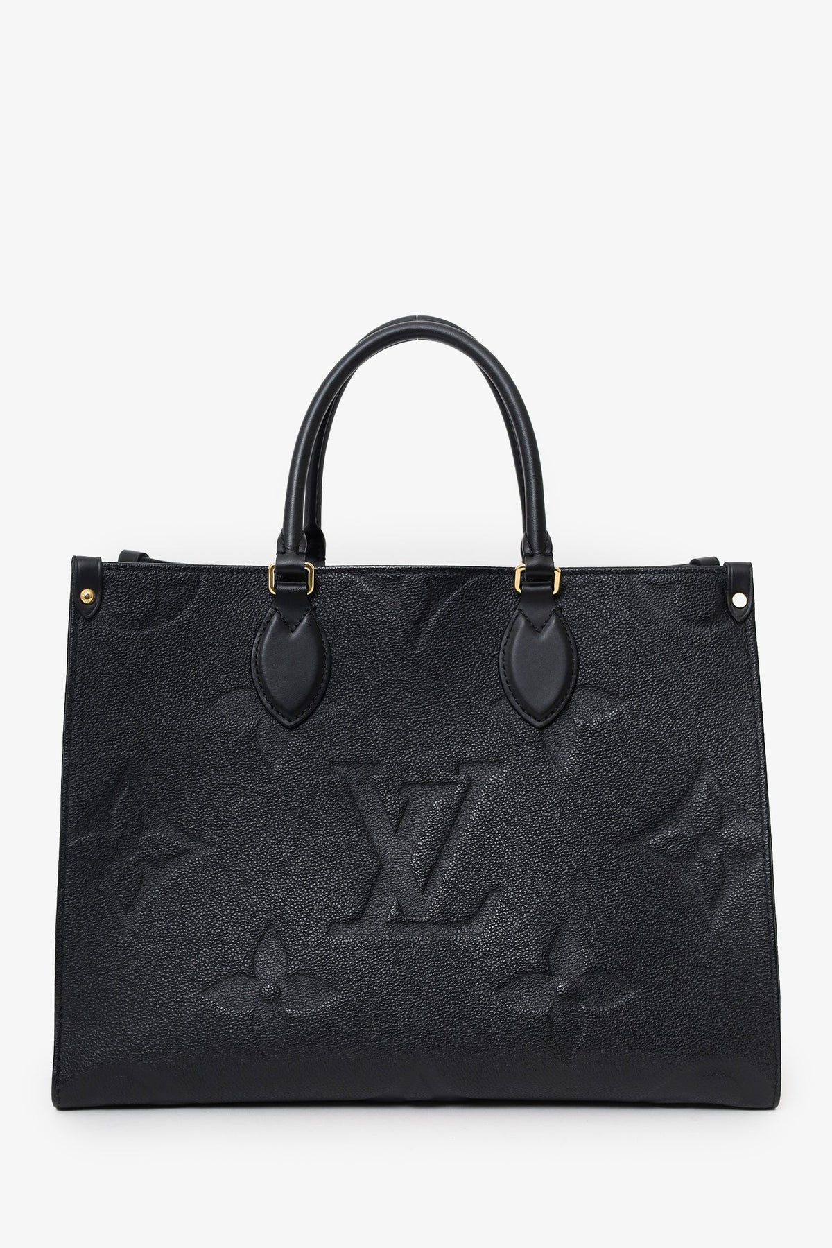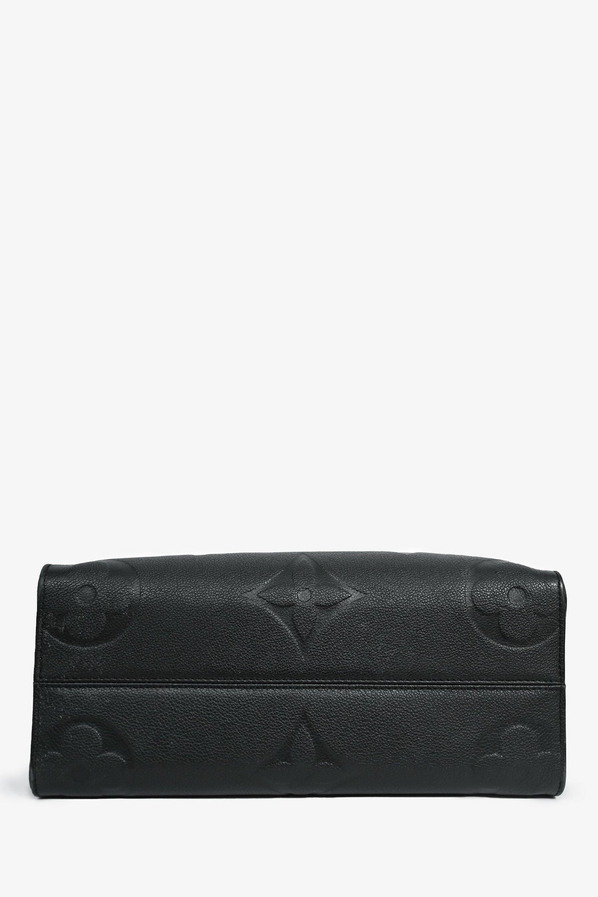 Louis Vuitton Black/Beige Giant Empreinte Onthego MM Tote. Dual rolled leather top handles and dual shoulder straps. Deep red microfibre lining. Features a zippered pocket and two slip pockets. Detachable compartment with two slip pockets on each wall, one side slip pocket. Gold-tone hardware. Tonal stitching.