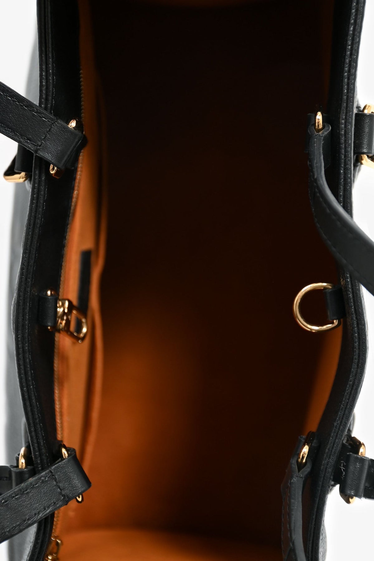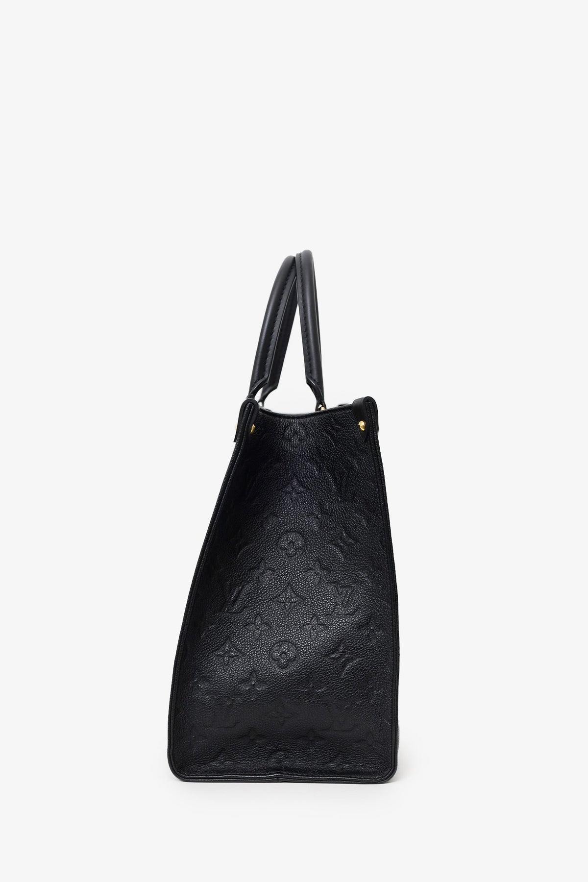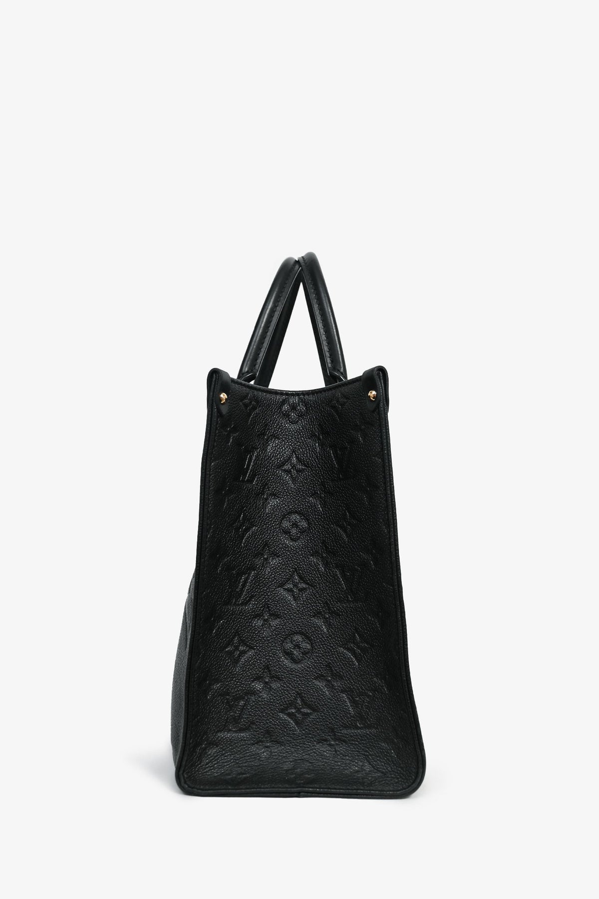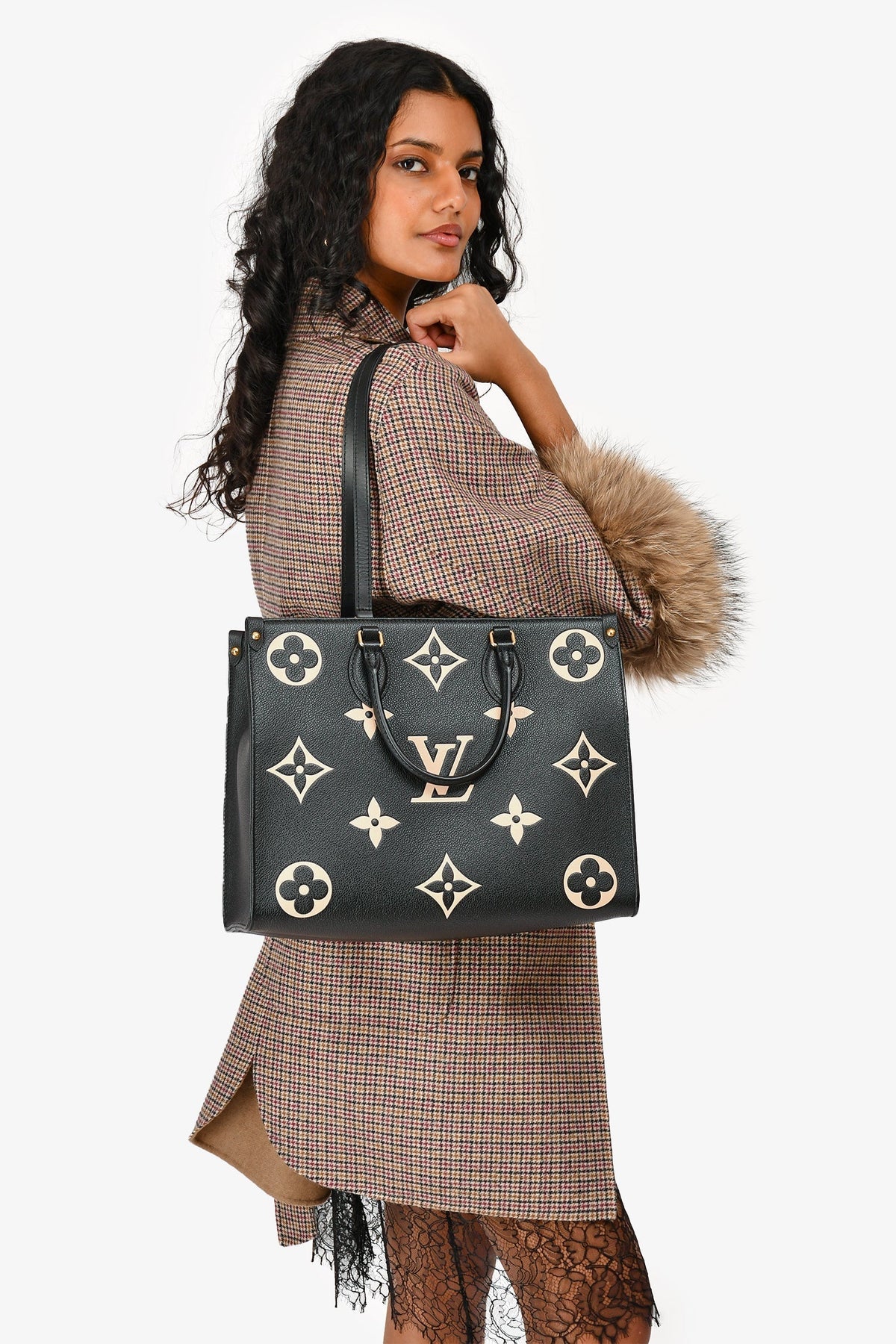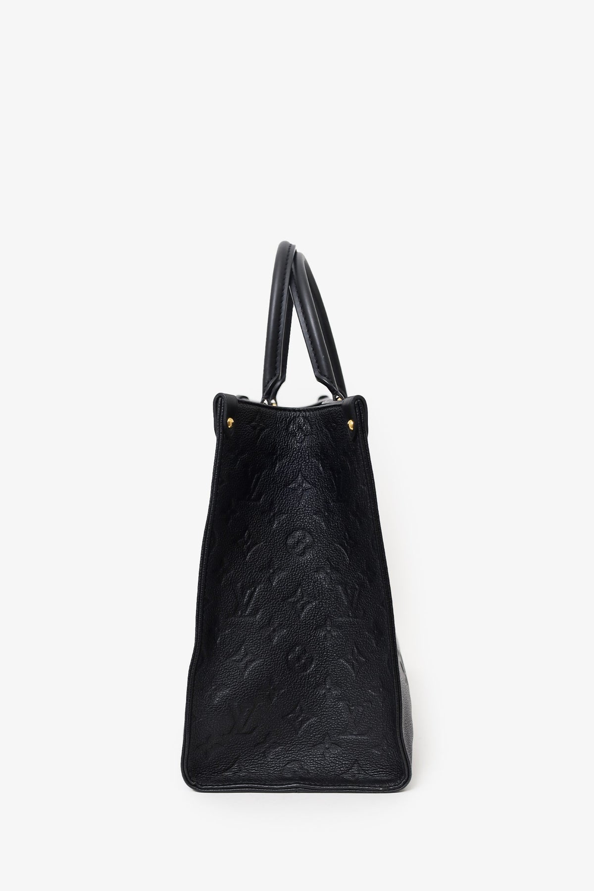 Louis Vuitton Black/Beige Giant Empreinte Onthego MM Tote. Dual rolled leather top handles and dual shoulder straps. Deep red microfibre lining. Features a zippered pocket and two slip pockets. Detachable compartment with two slip pockets on each wall, one side slip pocket. Gold-tone hardware. Tonal stitching.