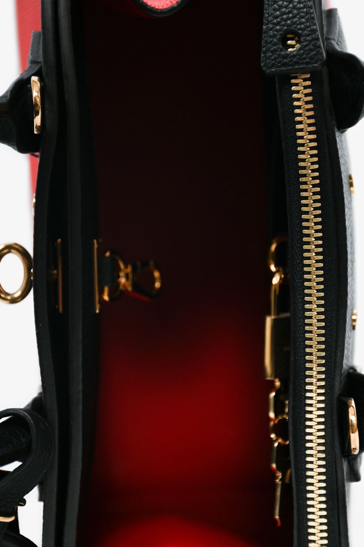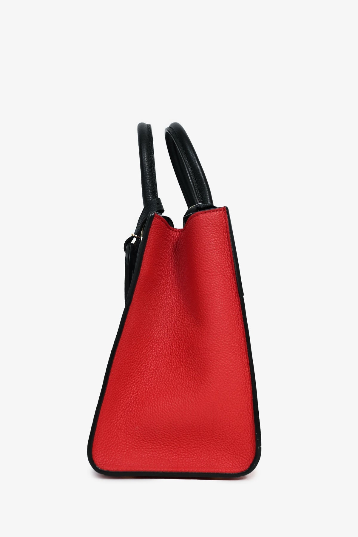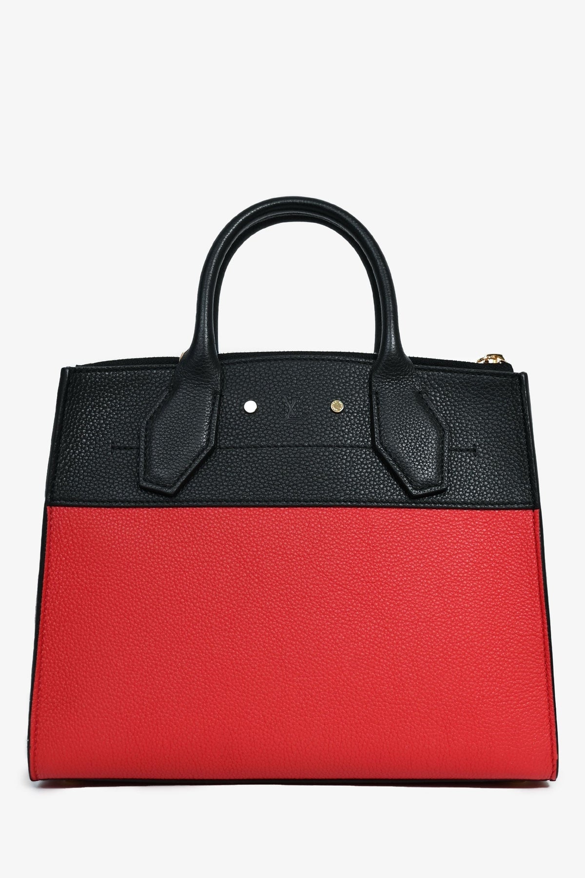 Louis Vuitton Black/Red Leather City Steamer Top Handle. Dual rolled handles. 3 compartments; 1 zip, 1 with latch closure, and 1 with turn-lock closure. Single interior with wall slip pocket. Detachable luggage tag. Protective metal bottom. Removable strap. Gold-tone hardware. Signature LV lock and 2 keys. Tonal stitching.