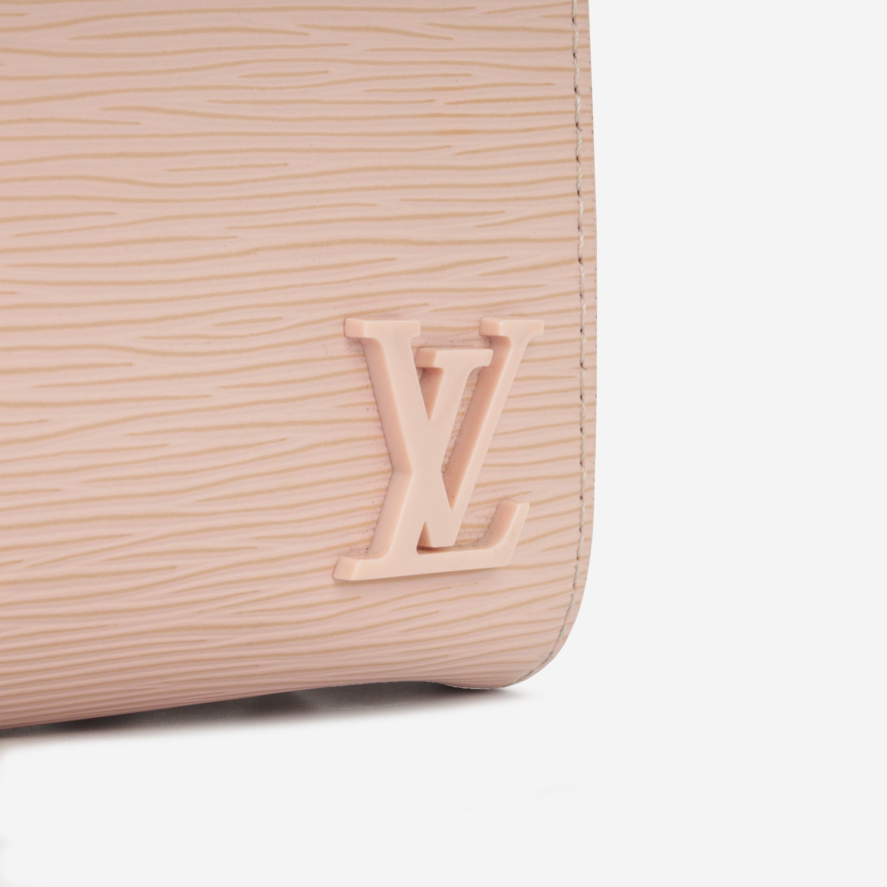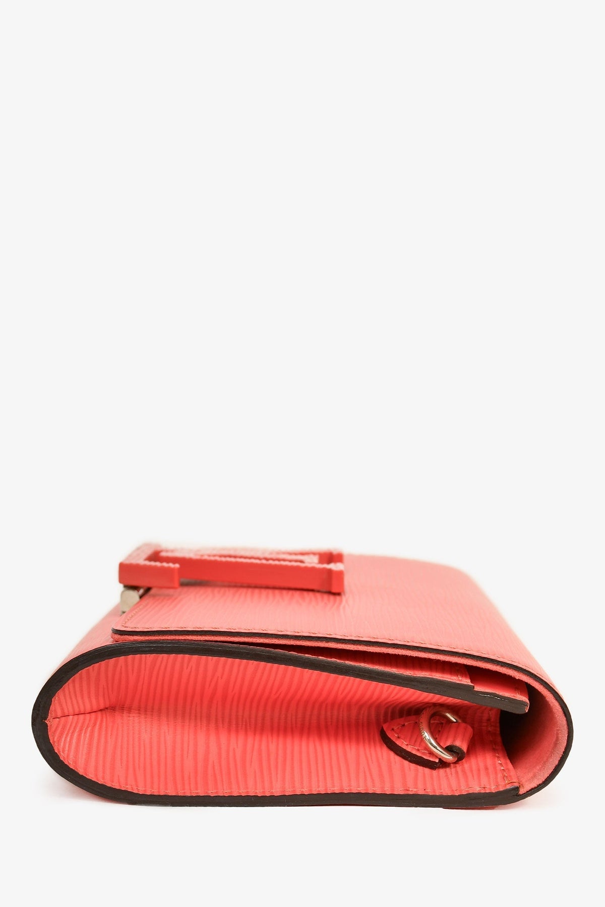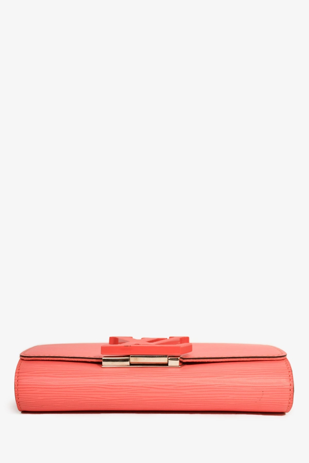 Regular price $1,860.00 Sale price $480.00 Save $1,380.00Louis Vuitton Coral Epi Leather 'Louise' Wallet on Chain. Front fold-over flap with flip-lock closure. Front exterior slip pocket. Single interior compartment with two card slots and a zipper pocket. Detachable strap. Suede lining. Silver-tone hardware. Tonal stitching.
