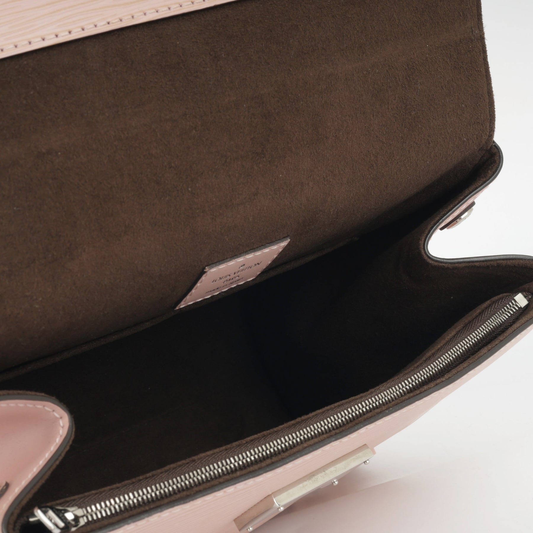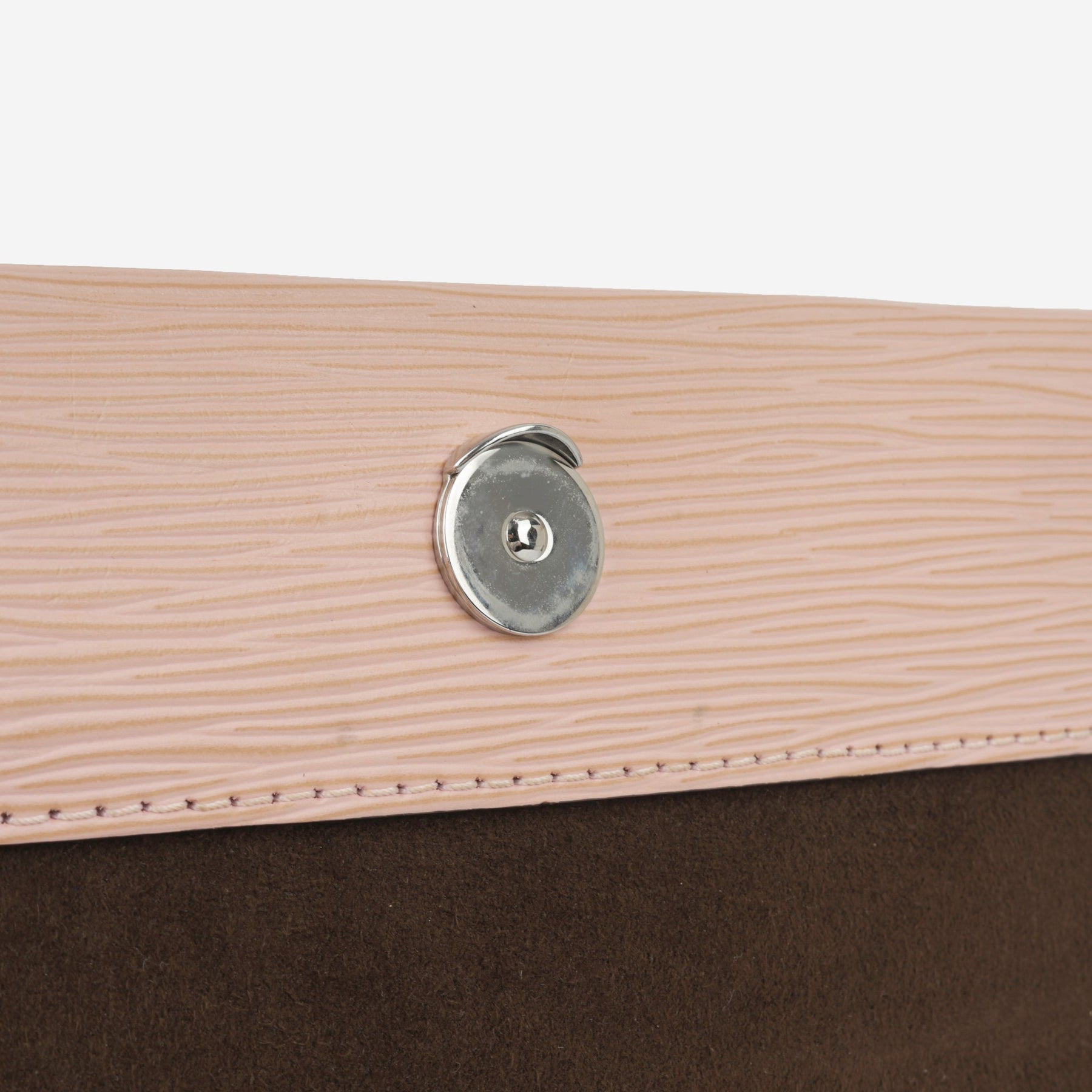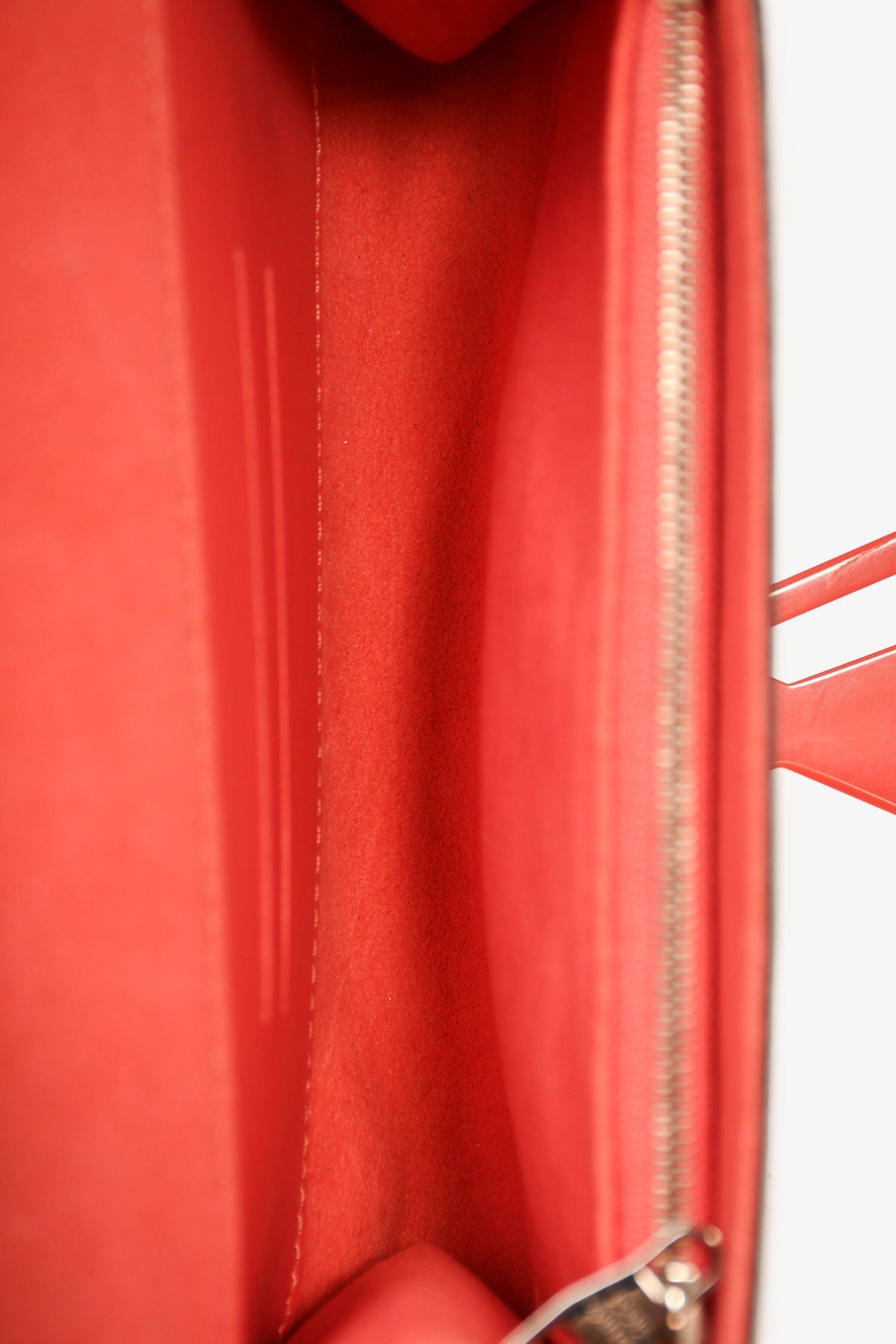 Regular price $1,860.00 Sale price $480.00 Save $1,380.00Louis Vuitton Coral Epi Leather 'Louise' Wallet on Chain. Front fold-over flap with flip-lock closure. Front exterior slip pocket. Single interior compartment with two card slots and a zipper pocket. Detachable strap. Suede lining. Silver-tone hardware. Tonal stitching.