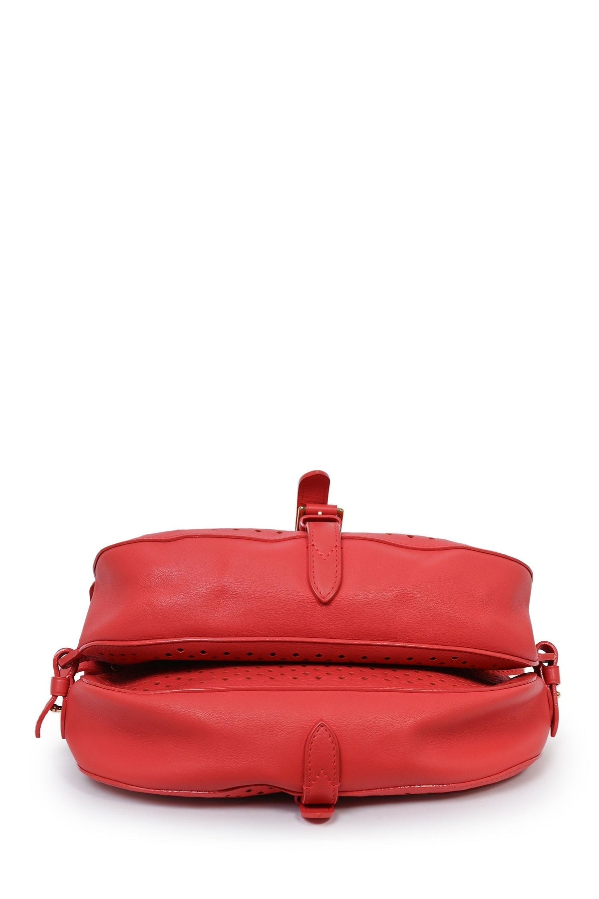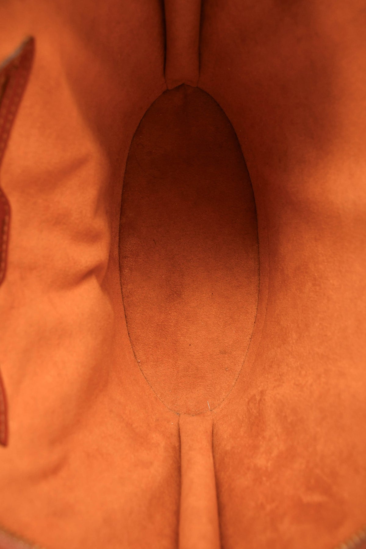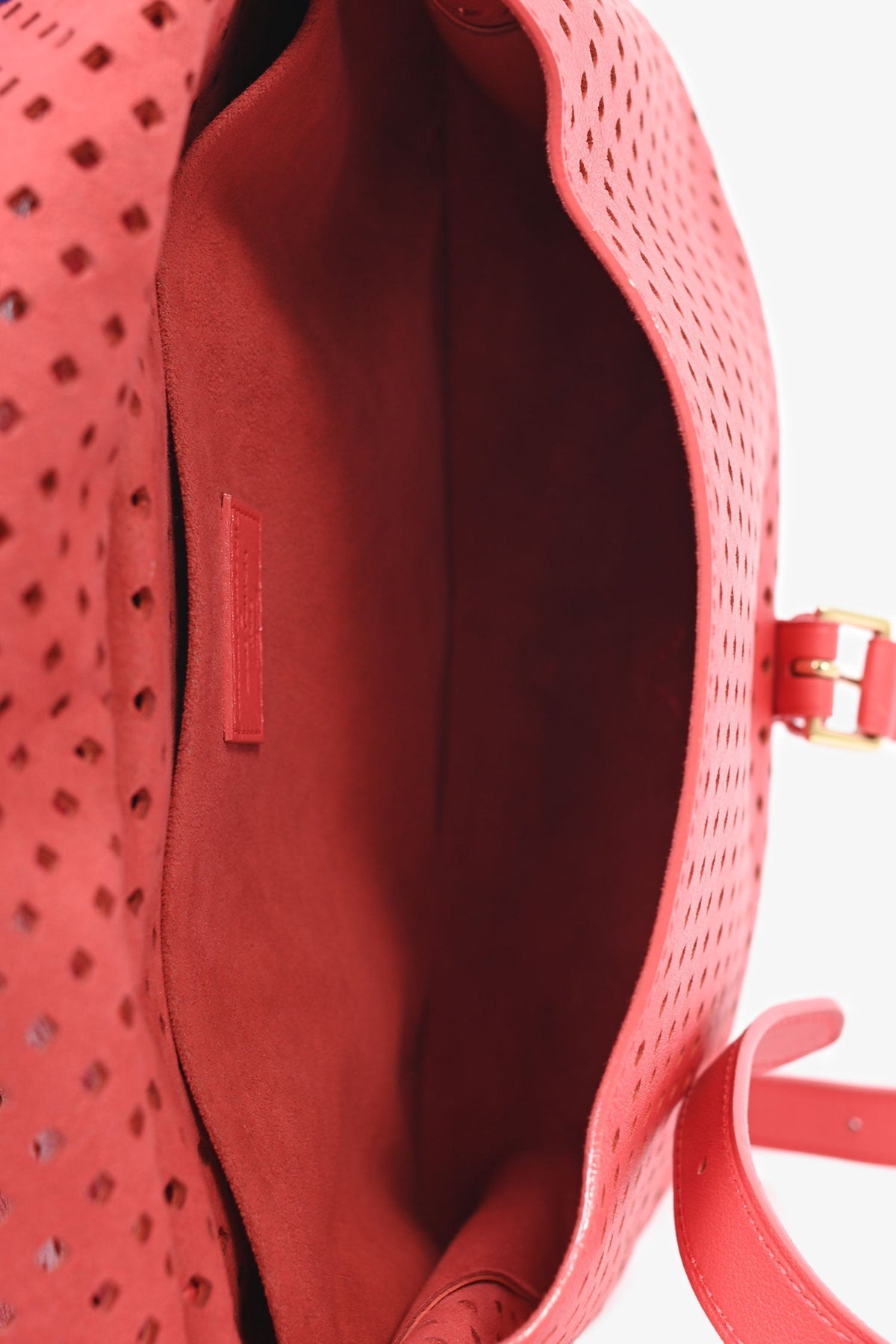 Louis Vuitton Coral Coppola Flore Perforated Saumur Messenger Bag. Front and rear fold-over flap with buckle closure. 2 open compartments on each side of item. One with a wall slip pocket. One with a single open compartment. Adjustable strap. Suade lining. Gold-tone hardware. Tonal stitching.