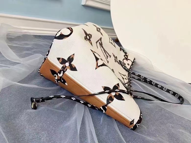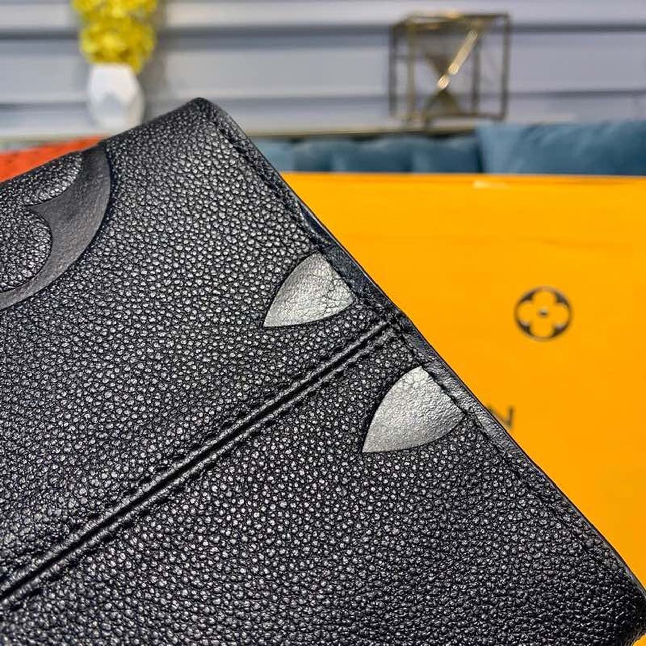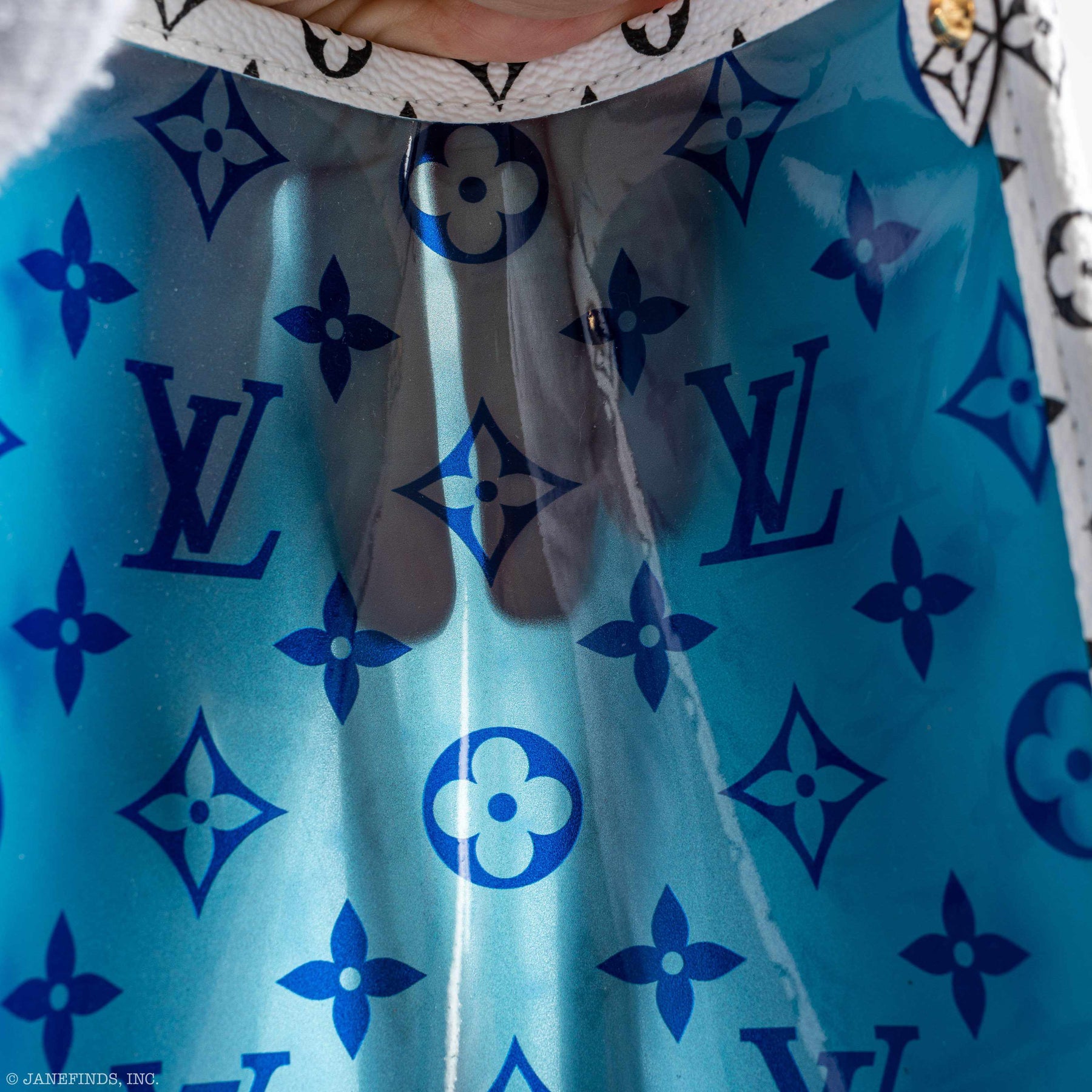 - Contrasting monogram accents in black and white, cobalt blue, and PVC