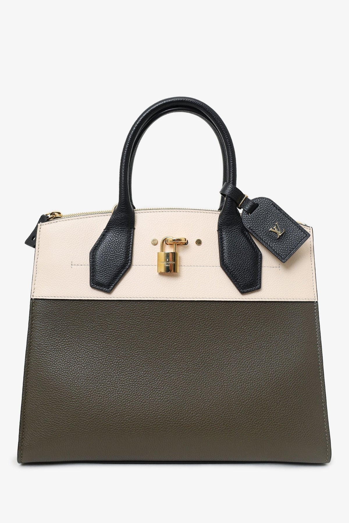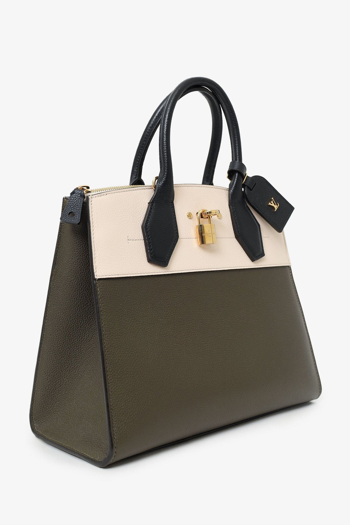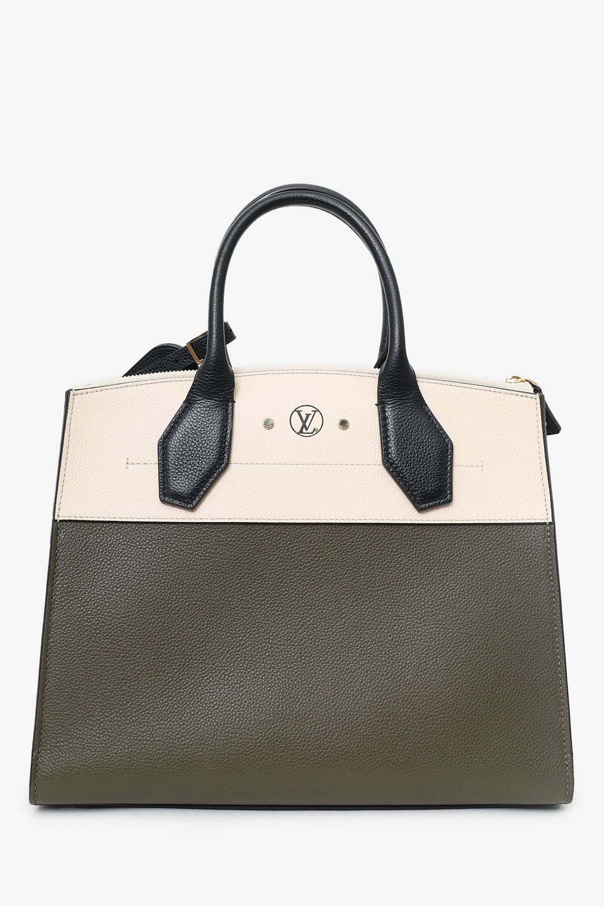 Louis Vuitton Olive/White/Black Taurillon City Steamer MM with Strap. Top twin handles 3 interior compartments; front with top zip closure, middle with top lobster-clasp closure, rear with clochette closure. Removable leather shoulder strap with lobster clasp closure. Leather-lined interior. Two interior slip pockets in middle compartment. Inclustion: a removable and adjustable leather bag tag with buckle closure, 2 sets of keys for front clochette lock. Gold-tone hardware. Tonal stitching.