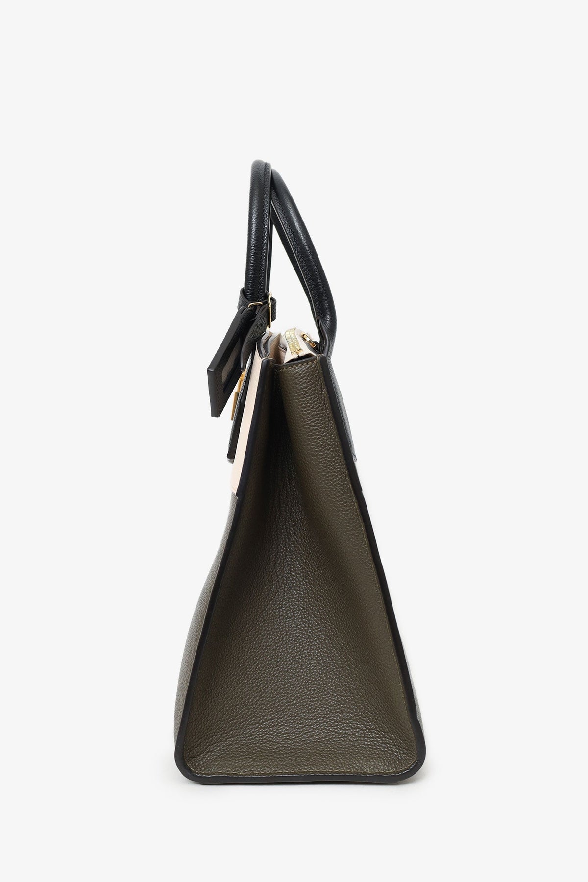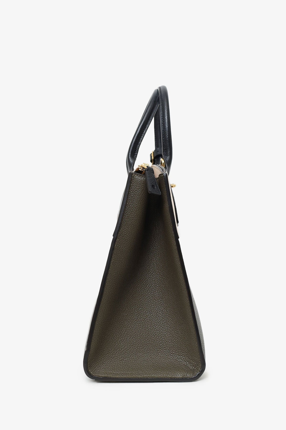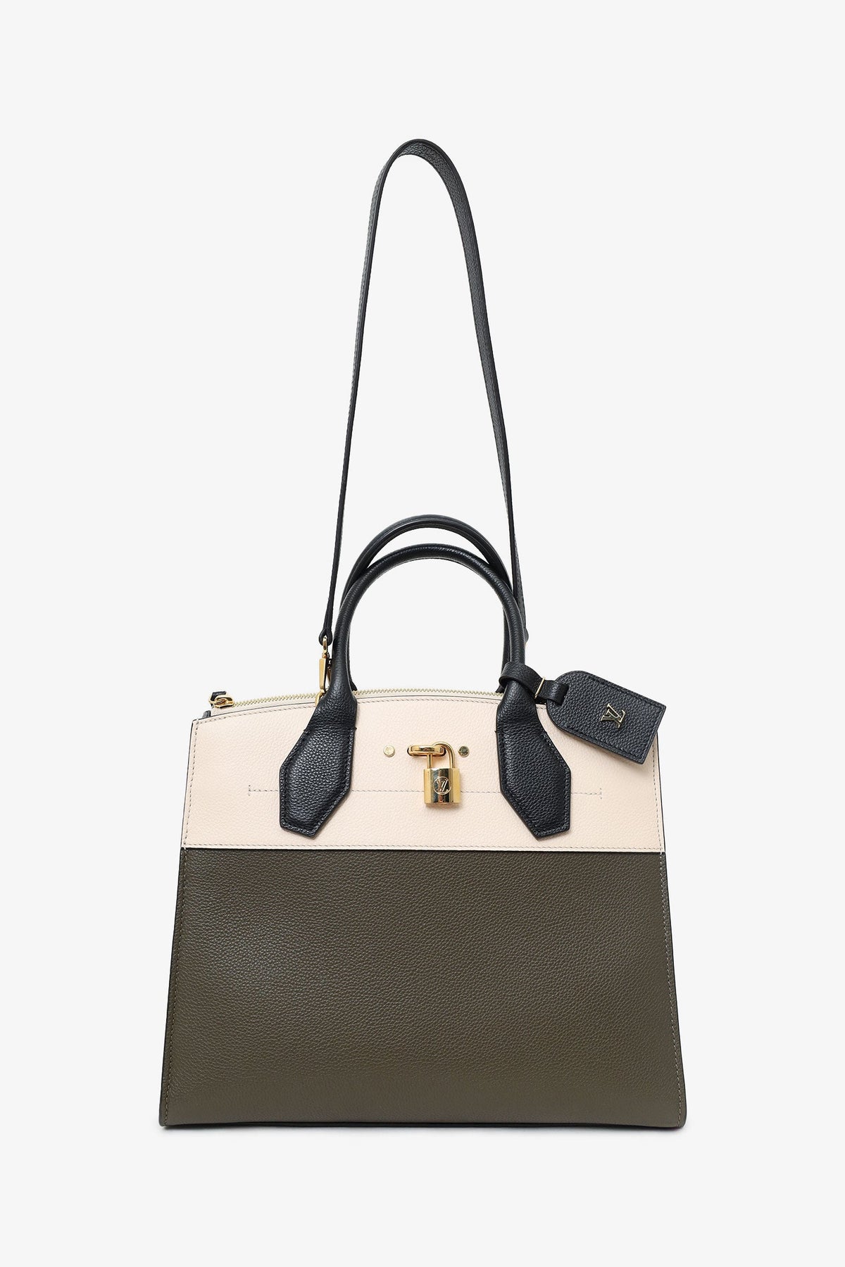 Louis Vuitton Olive/White/Black Taurillon City Steamer MM with Strap. Top twin handles 3 interior compartments; front with top zip closure, middle with top lobster-clasp closure, rear with clochette closure. Removable leather shoulder strap with lobster clasp closure. Leather-lined interior. Two interior slip pockets in middle compartment. Inclustion: a removable and adjustable leather bag tag with buckle closure, 2 sets of keys for front clochette lock. Gold-tone hardware. Tonal stitching.