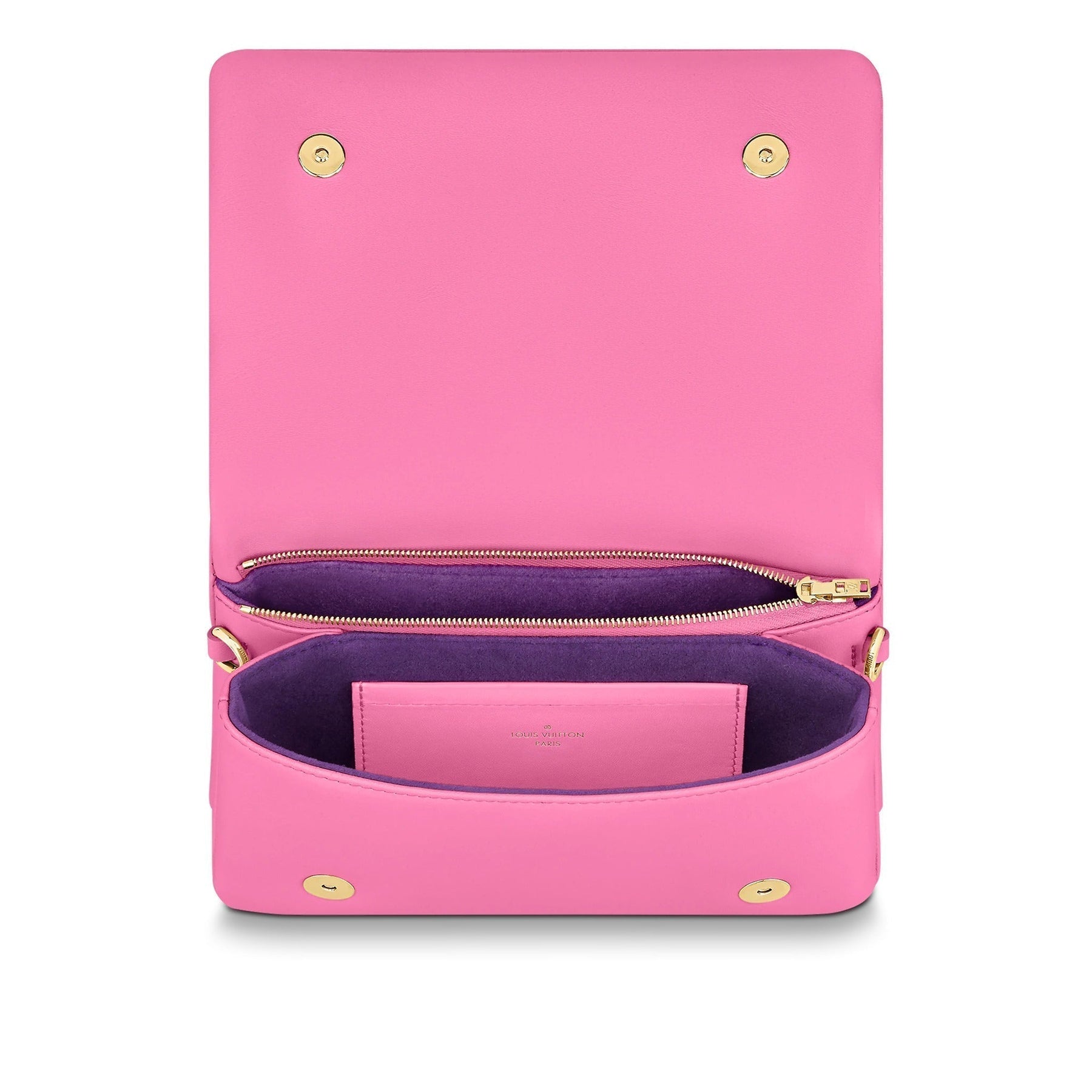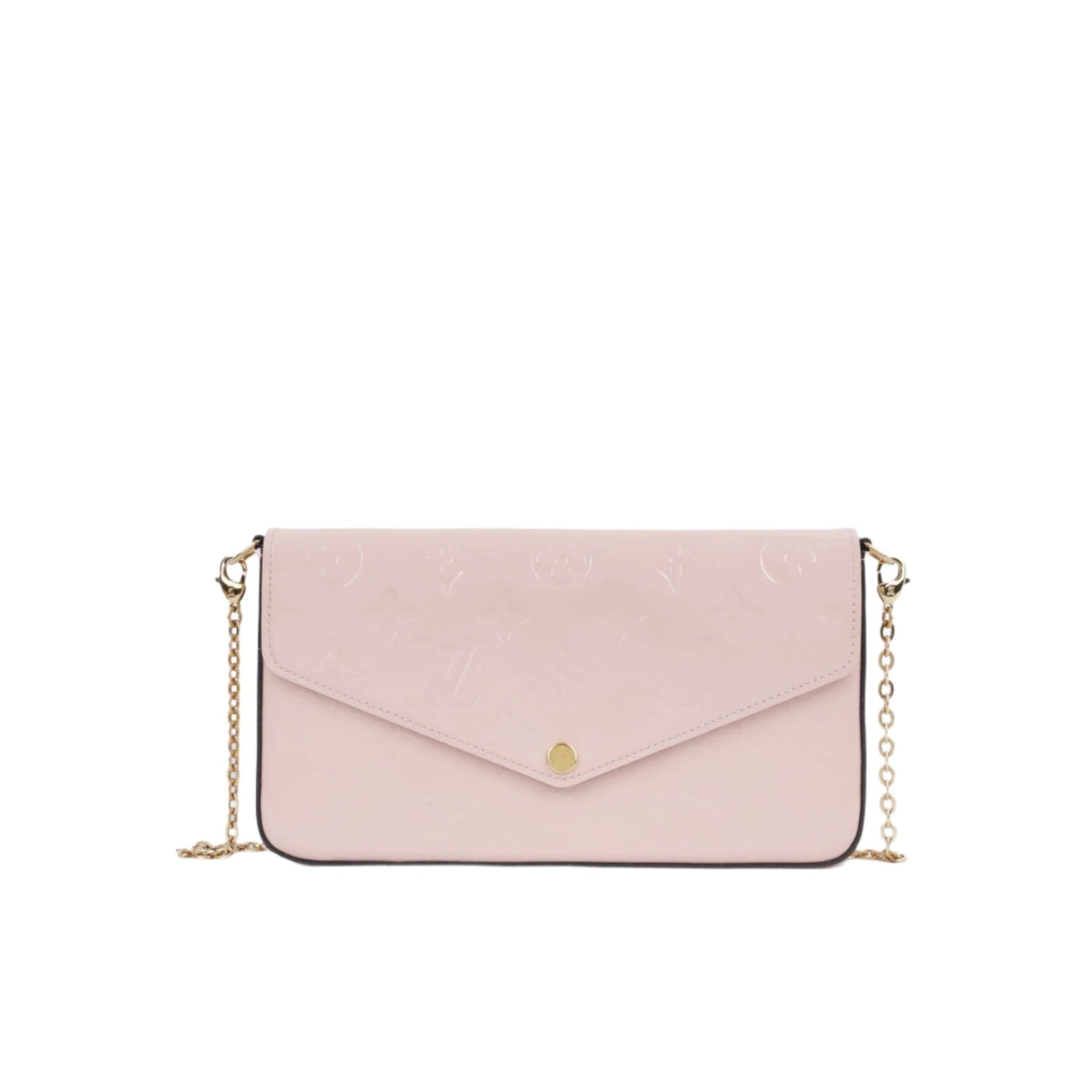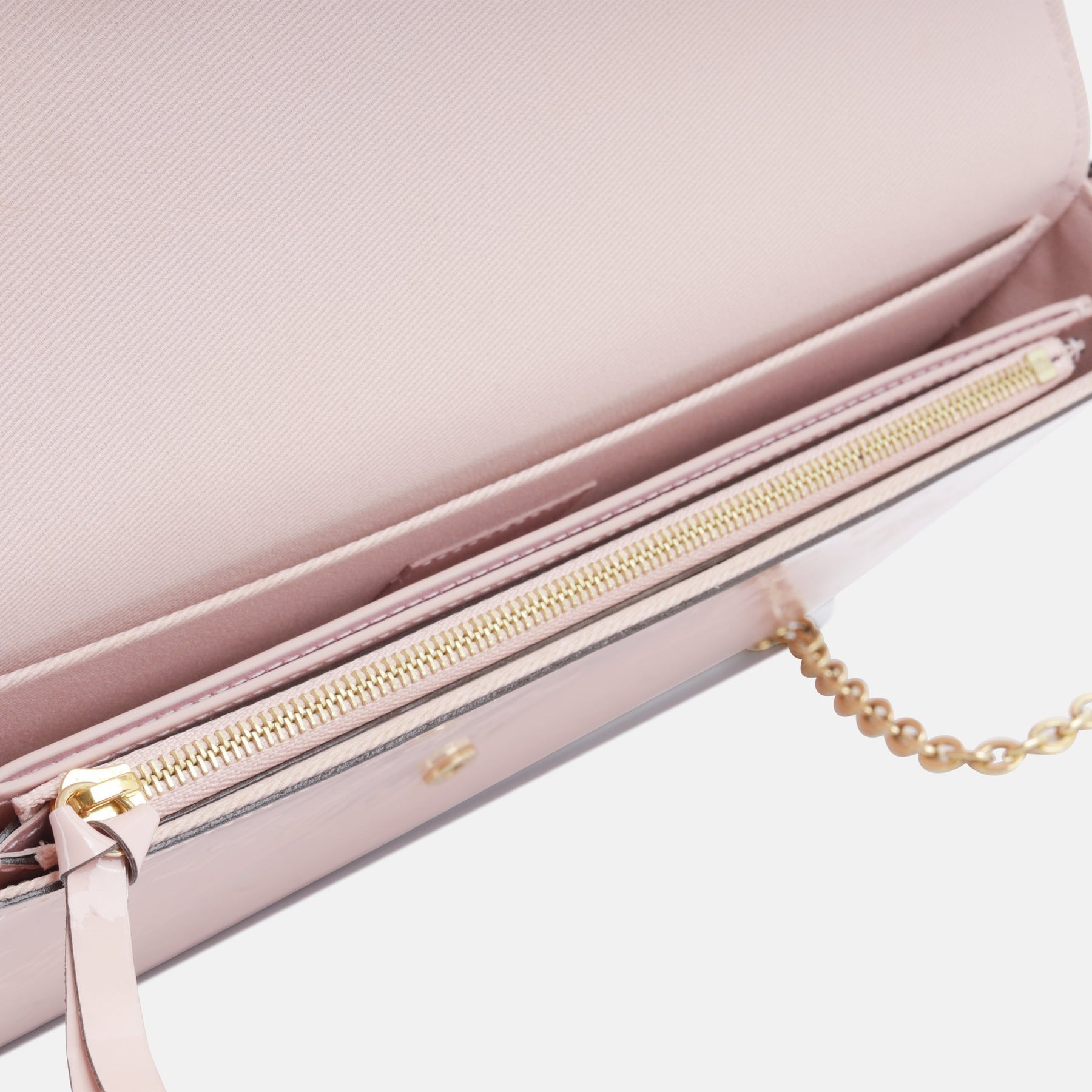 From casual to night-out, this bag would be perfect accessory. This particular piece comes in rose ballerina pink in a glossy monogram patent calf leather. It features two wallet inserts, including one with card slots to keep all of your money safe.