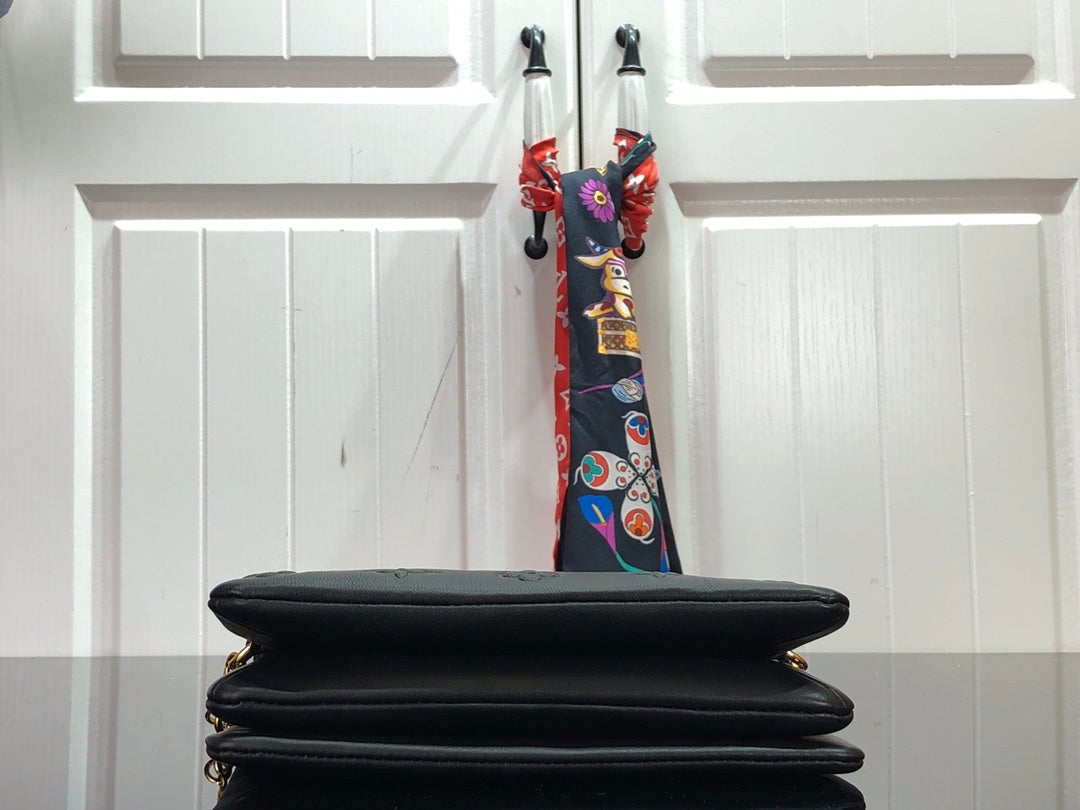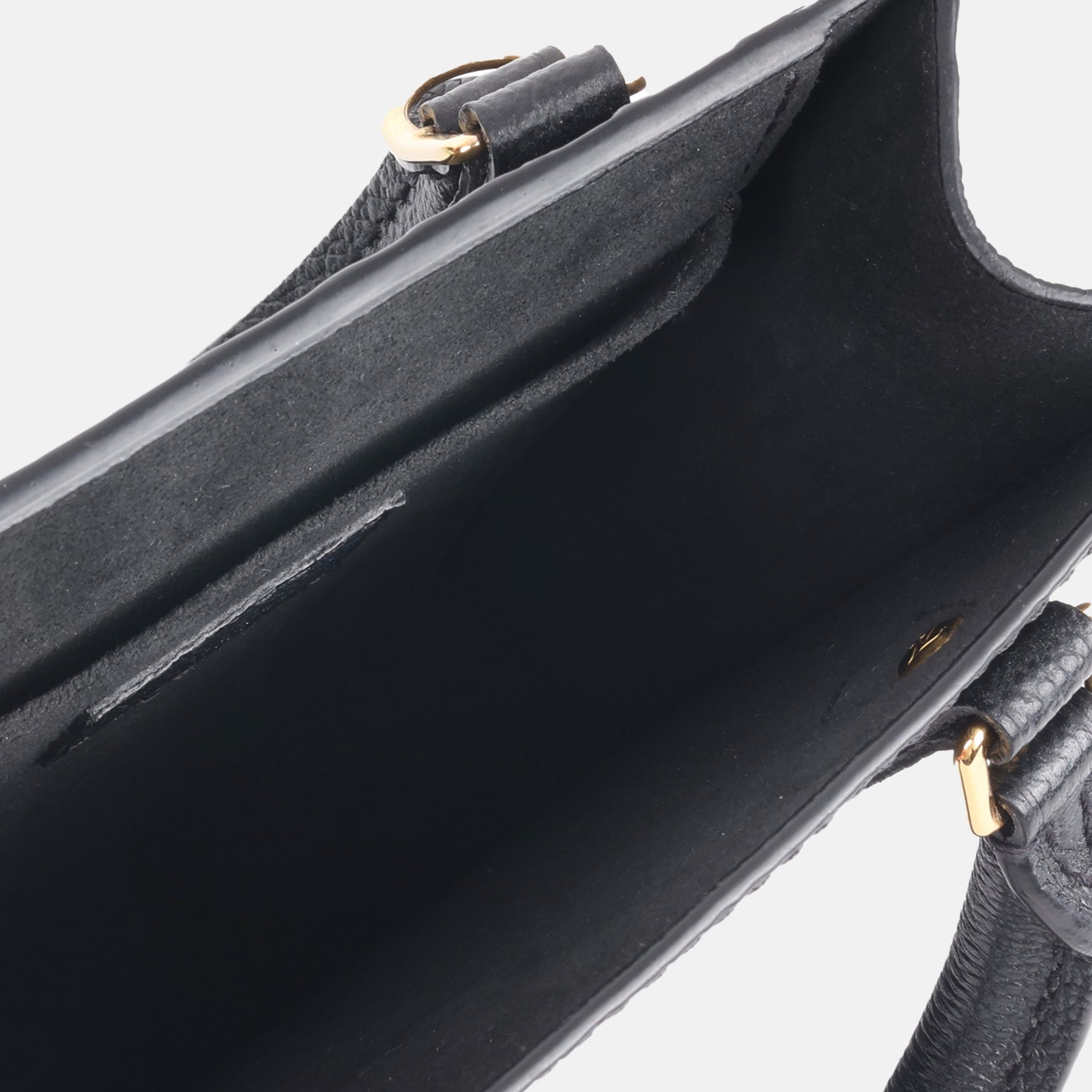 Crafted in smooth black calfskin, this sophisticated piece is the perfect companion for any evening event. Designed to hold all your essentials, it seamlessly blends functionality with timeless elegance. Wear it on its gleaming gold chain for a statement shoulder bag look, or carry it as a chic clutch for understated glamour.