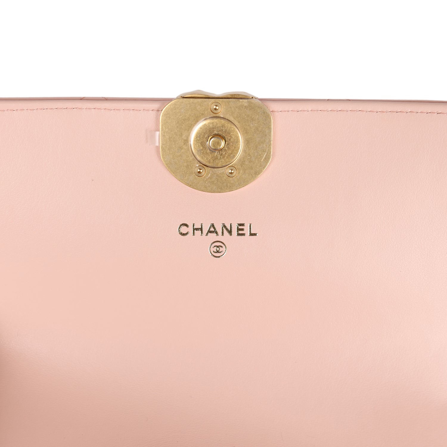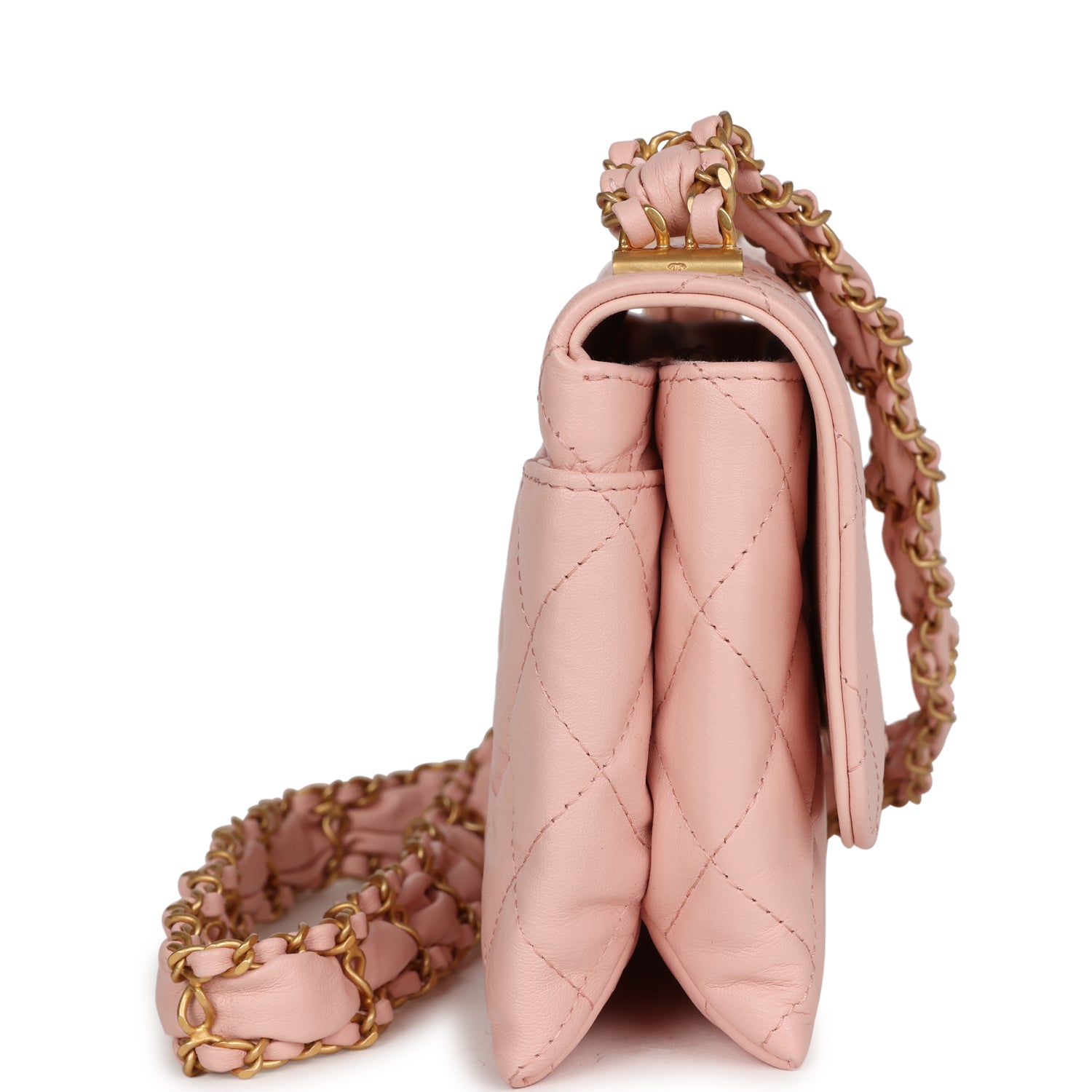 Regular price $1,960.00 Sale price $440.00 Save $1,520.00This 19 Flap Phone Holder is in Light Pink Aged Calfskin with Brushed Gold Hardware, tonal stitching, CC magnetic closure, interwoven brushed gold chainlink woven with thick aged calfskin.