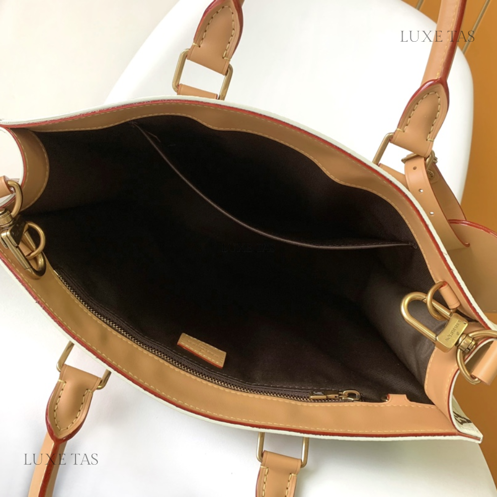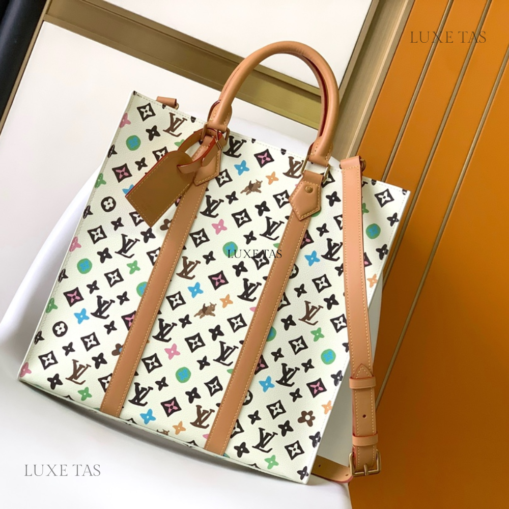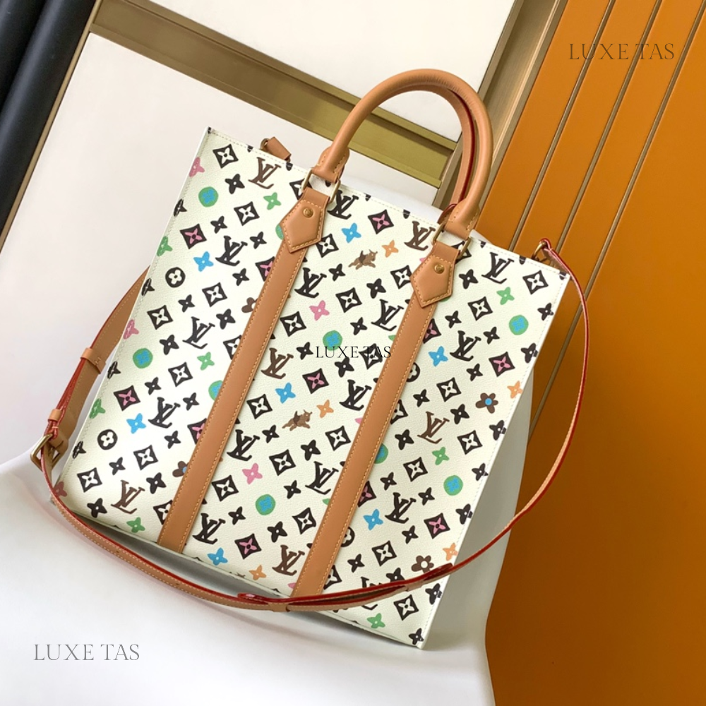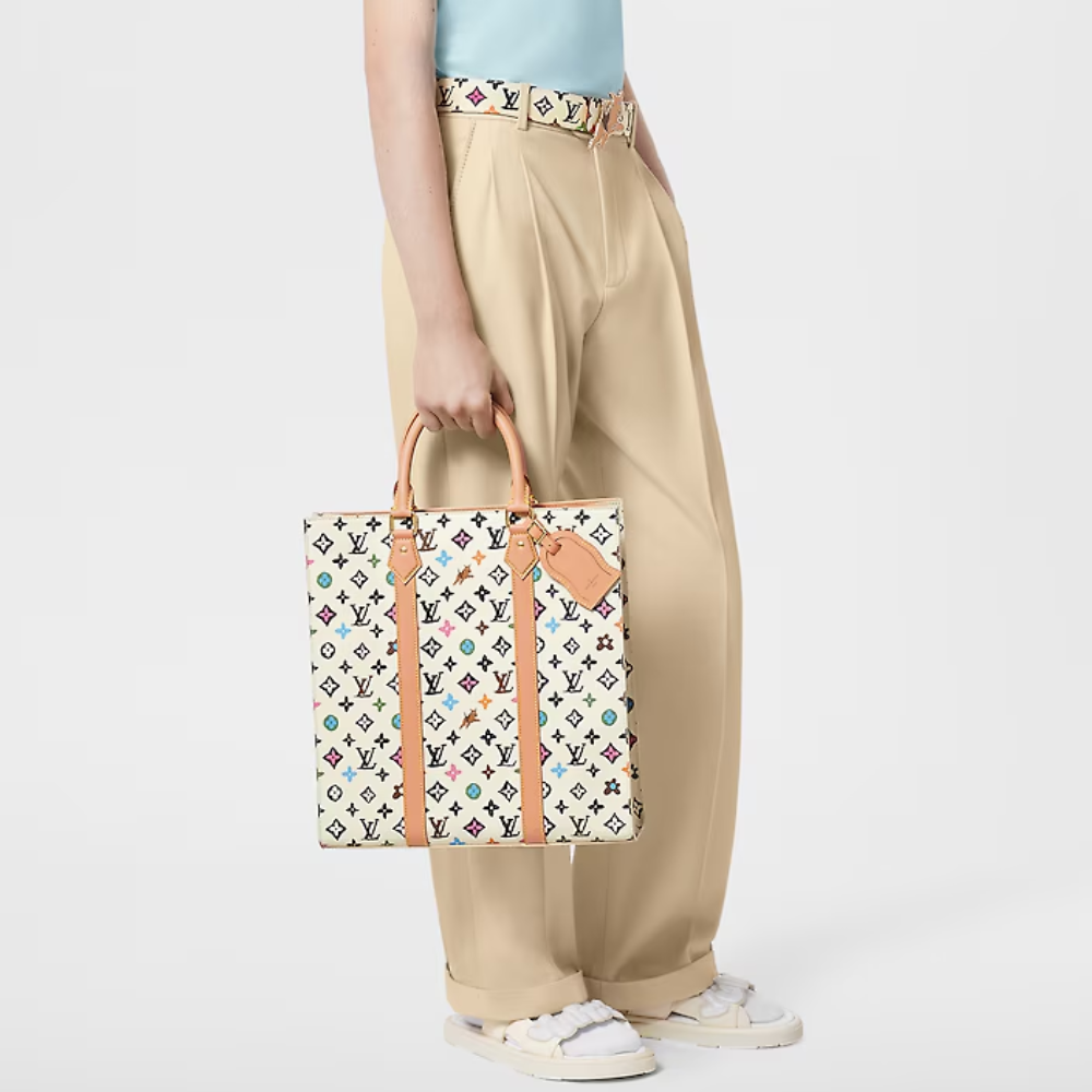 In the Sac Plat carryall, Monogram Craggy canvas adds a whimsical touch with its hand-drawn design by Tyler. This unique variation of the Monogram incorporates playful flowers and dogs into the pattern. Crafted with cowhide leather trims, including a wavy name tag, the bag features two top handles and a removable shoulder strap, providing versatile carry options.