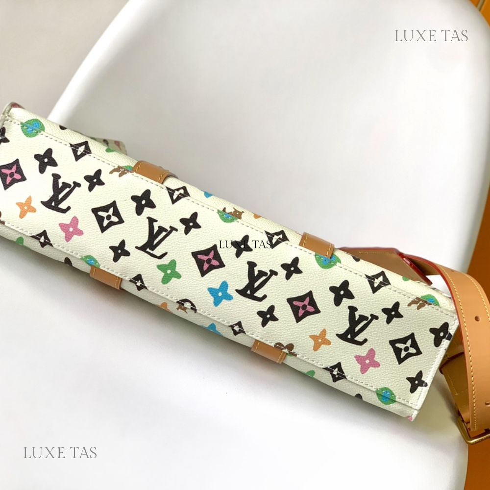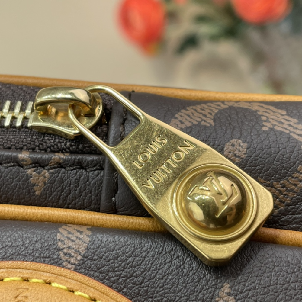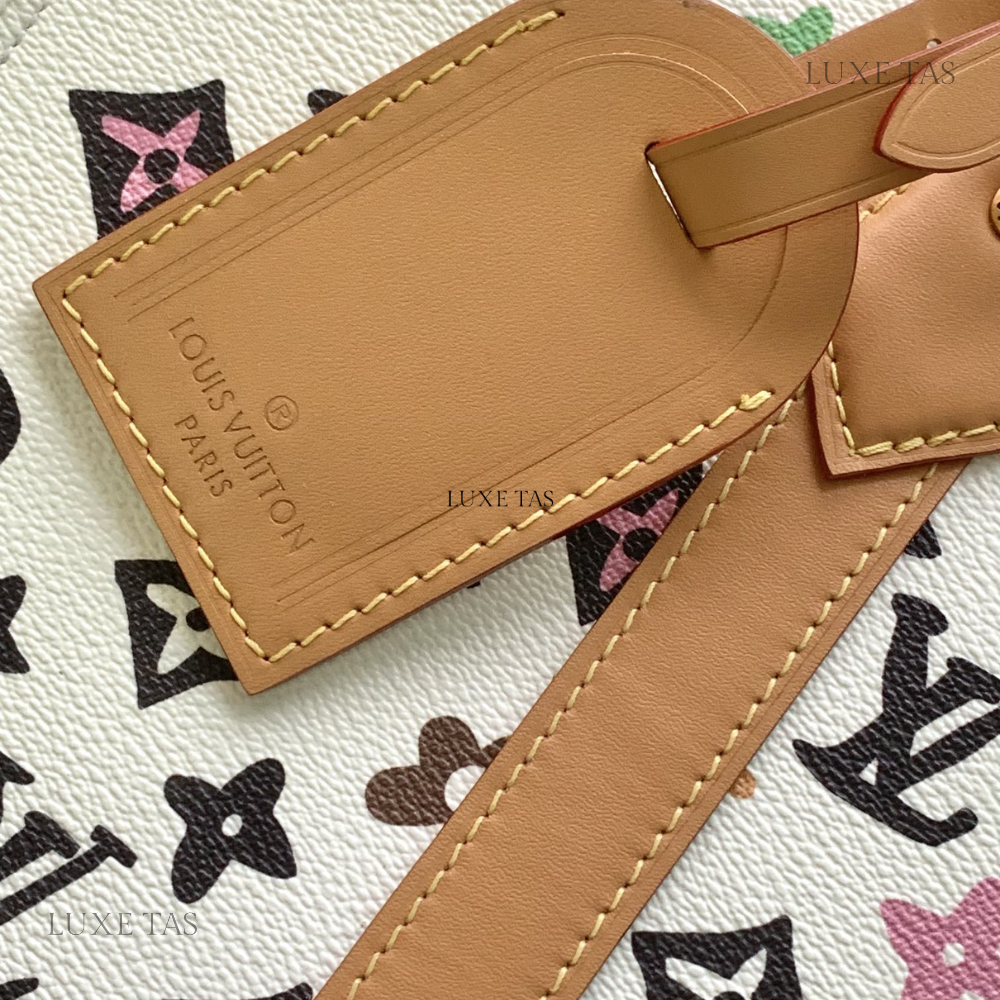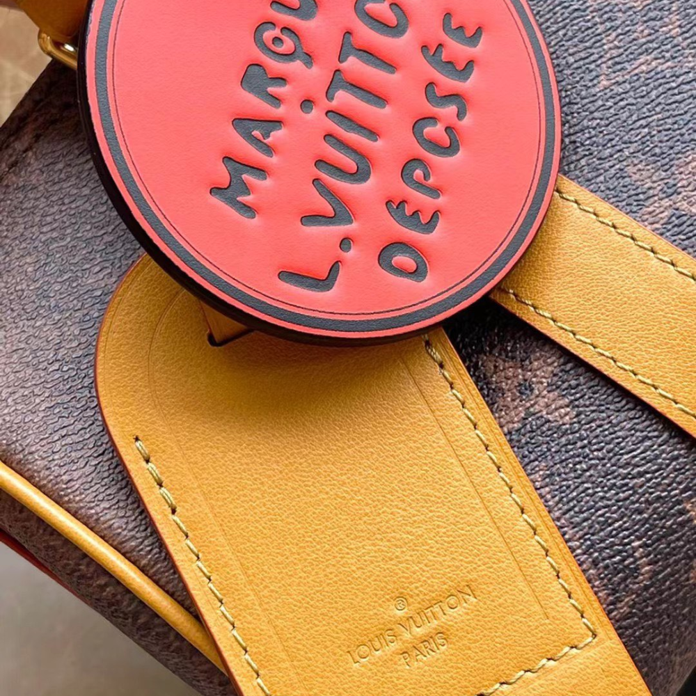 In the Sac Plat carryall, Monogram Craggy canvas adds a whimsical touch with its hand-drawn design by Tyler. This unique variation of the Monogram incorporates playful flowers and dogs into the pattern. Crafted with cowhide leather trims, including a wavy name tag, the bag features two top handles and a removable shoulder strap, providing versatile carry options.