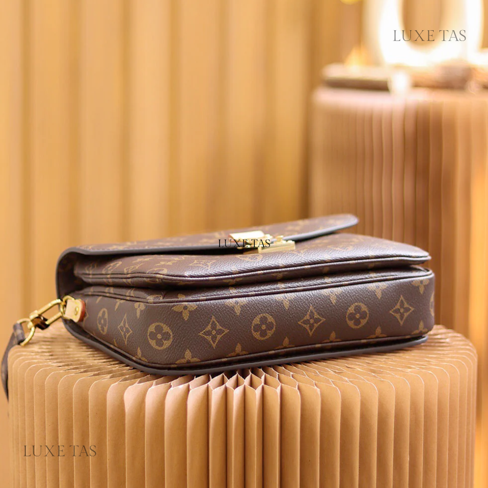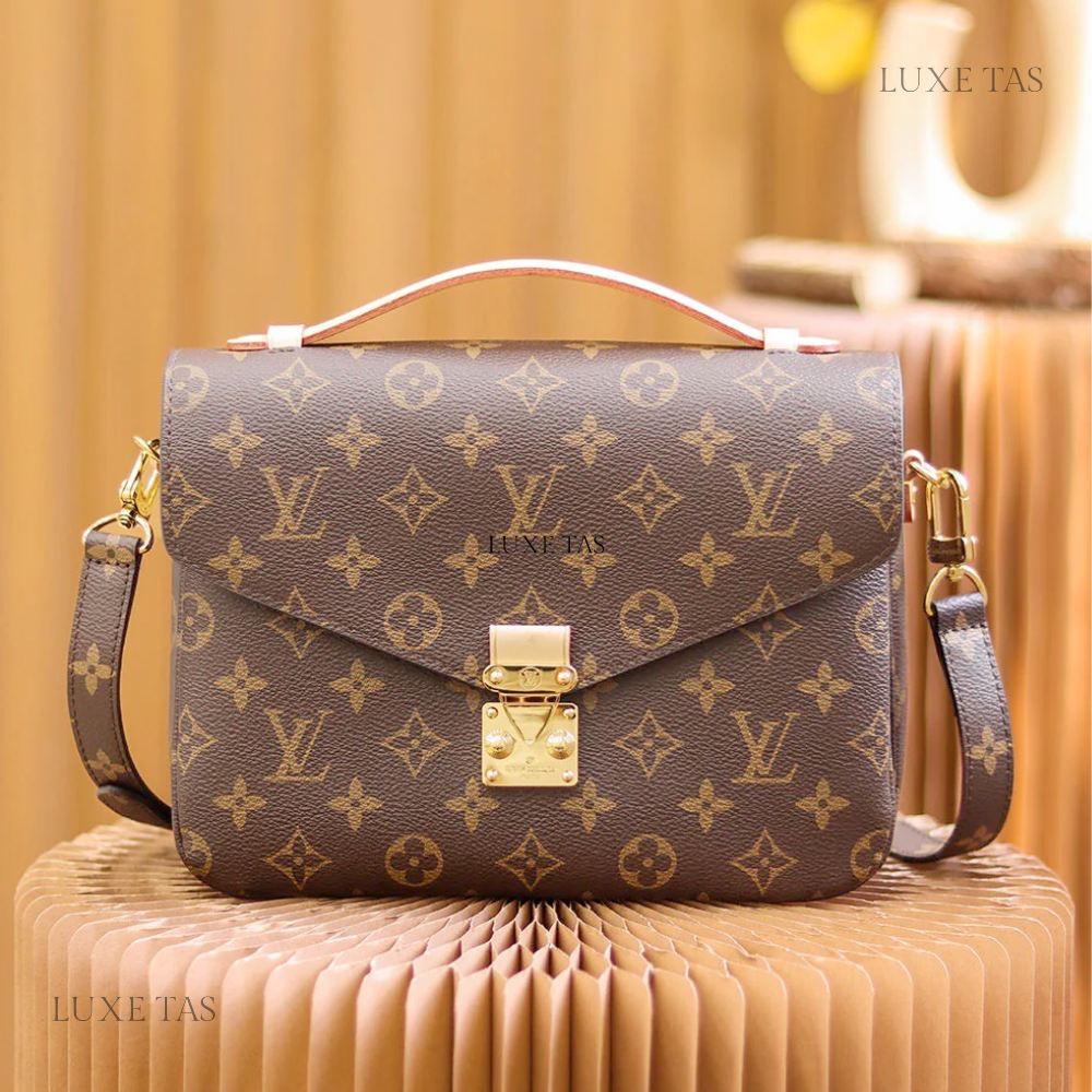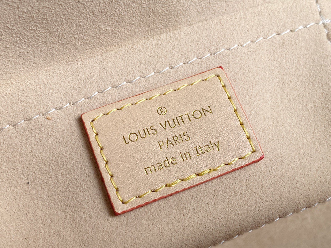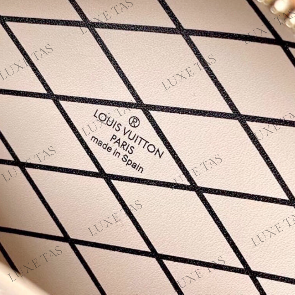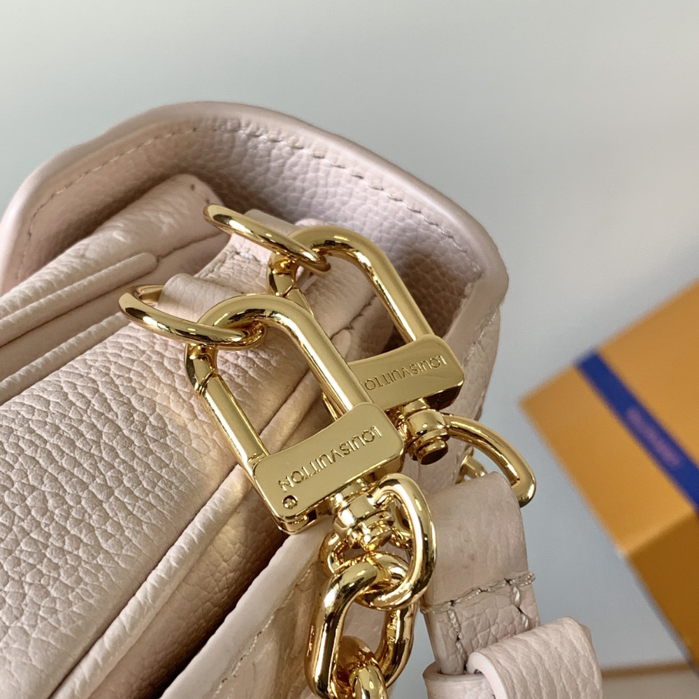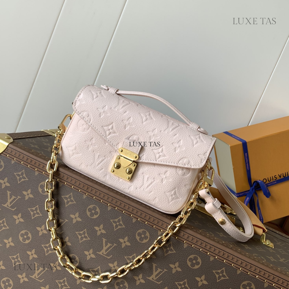 This chic Pochette Métis East-West bag showcases a sleek silhouette in soft pastel Monogram-embossed leather. Accented with pale gold-tone hardware, including a statement lock and detachable short chain, it balances elegance and trend-forward style. The well-structured interior and adjustable strap add everyday functionality to this standout accessory