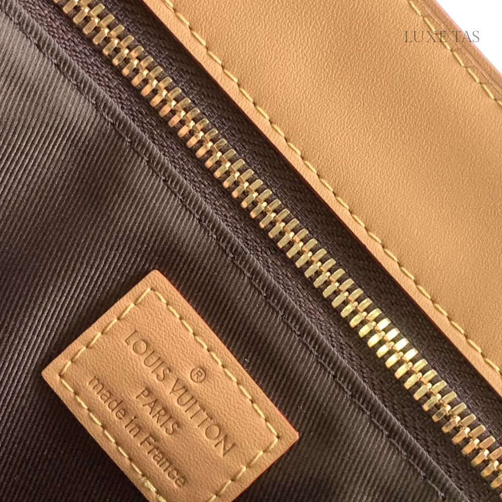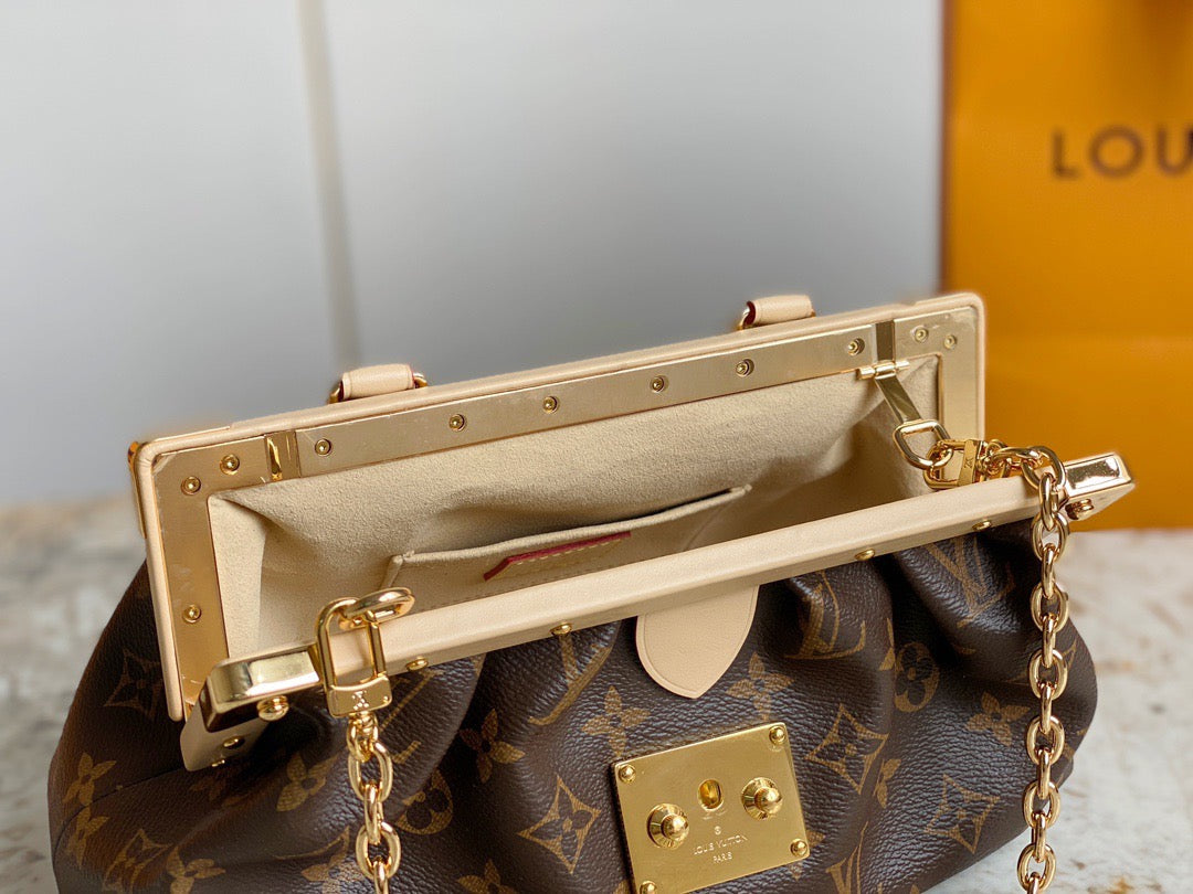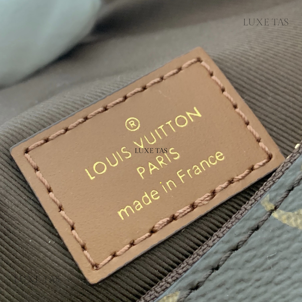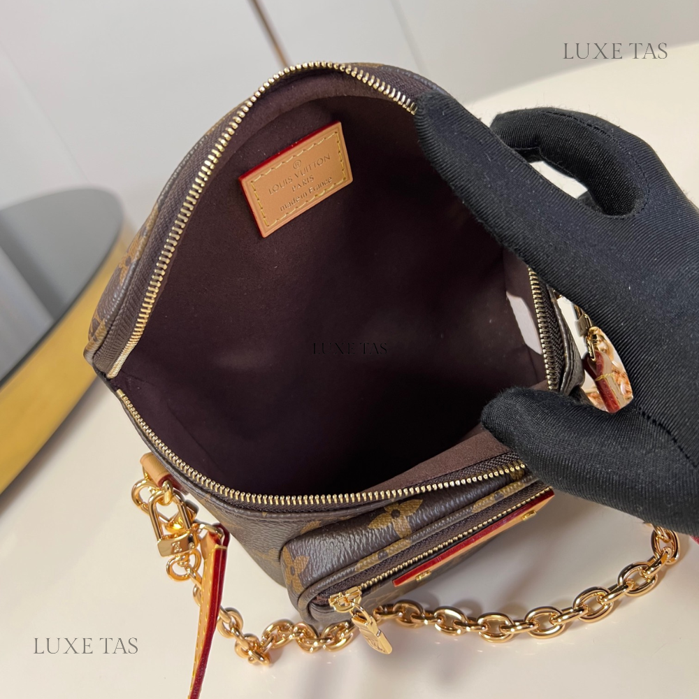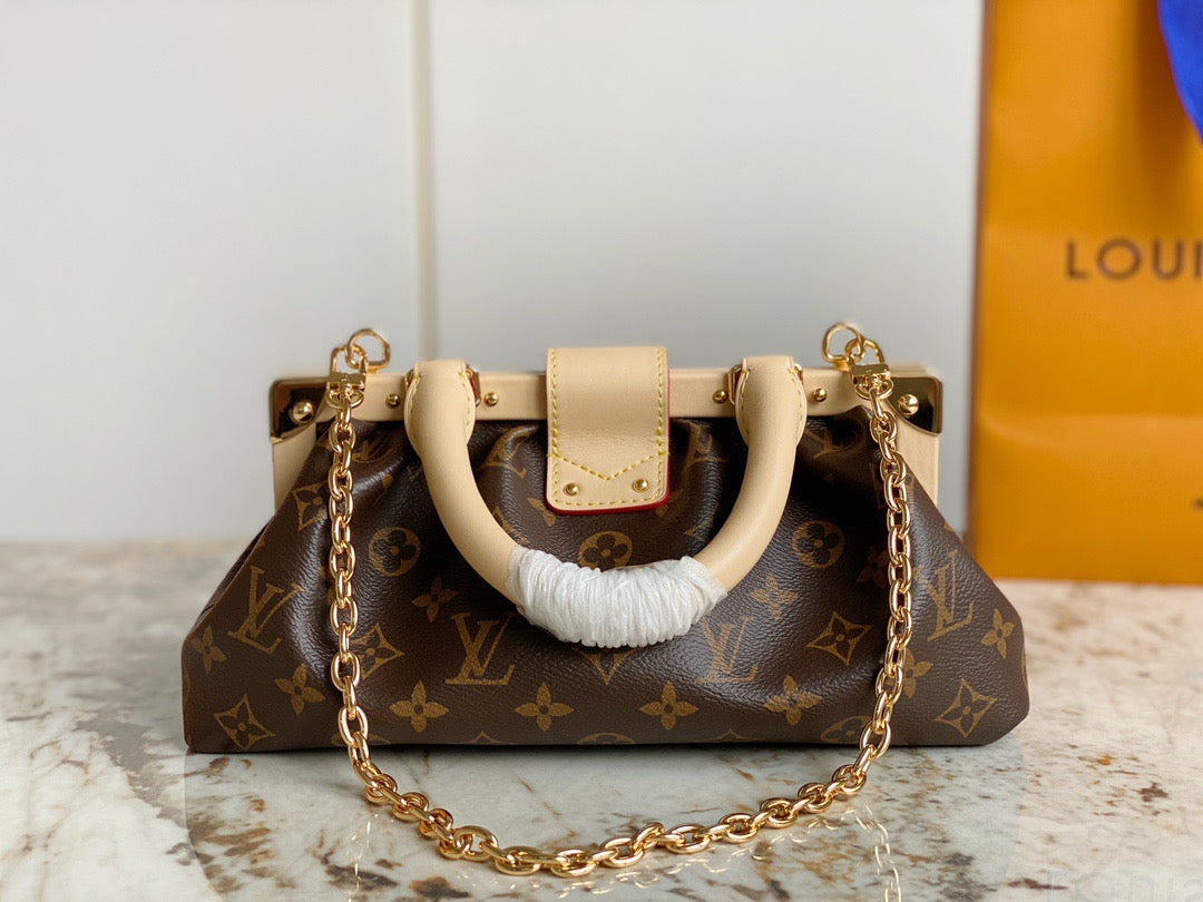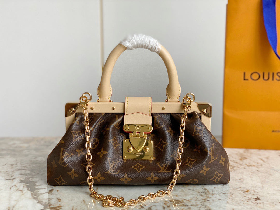 Introducing the Monogram Clutch, spotted at the Spring-Summer 2023 show. This clutch bag is crafted from the iconic Monogram canvas, complemented by natural calfskin trim and finished with luxurious gold-tone hardware, including the signature L*V S-lock and a riveted clasp with metallic corners. Designed with convenience in mind, the clutch comes with a rolled-leather top handle and a removable chain, which is attached to retractable and rotating chain mounts.