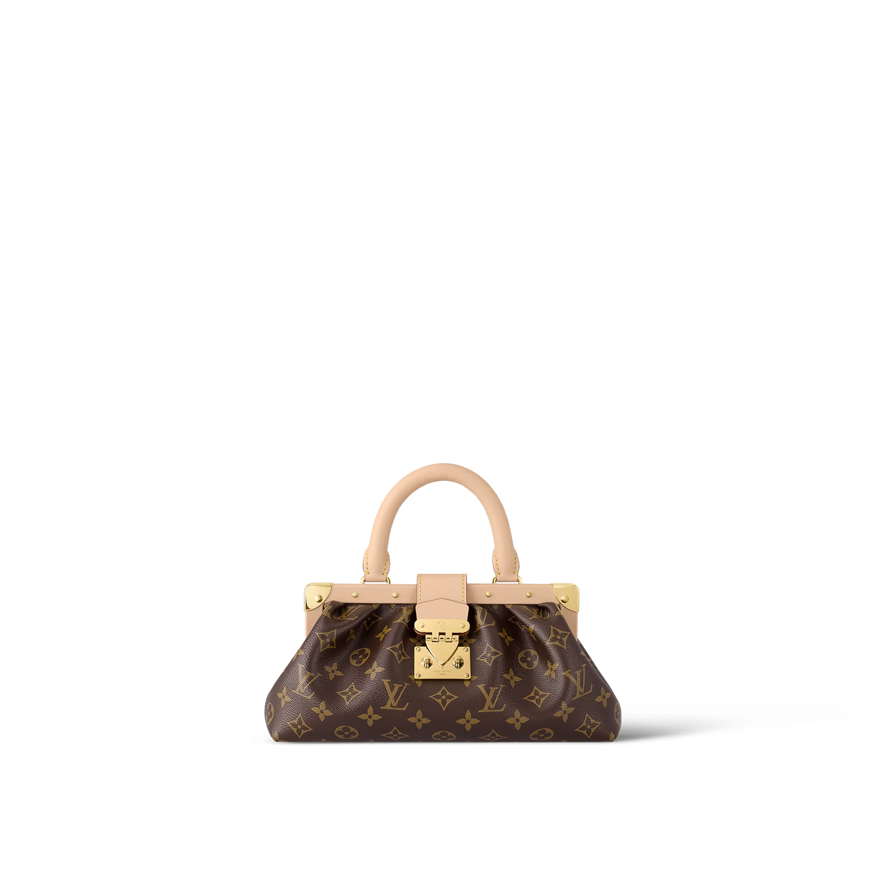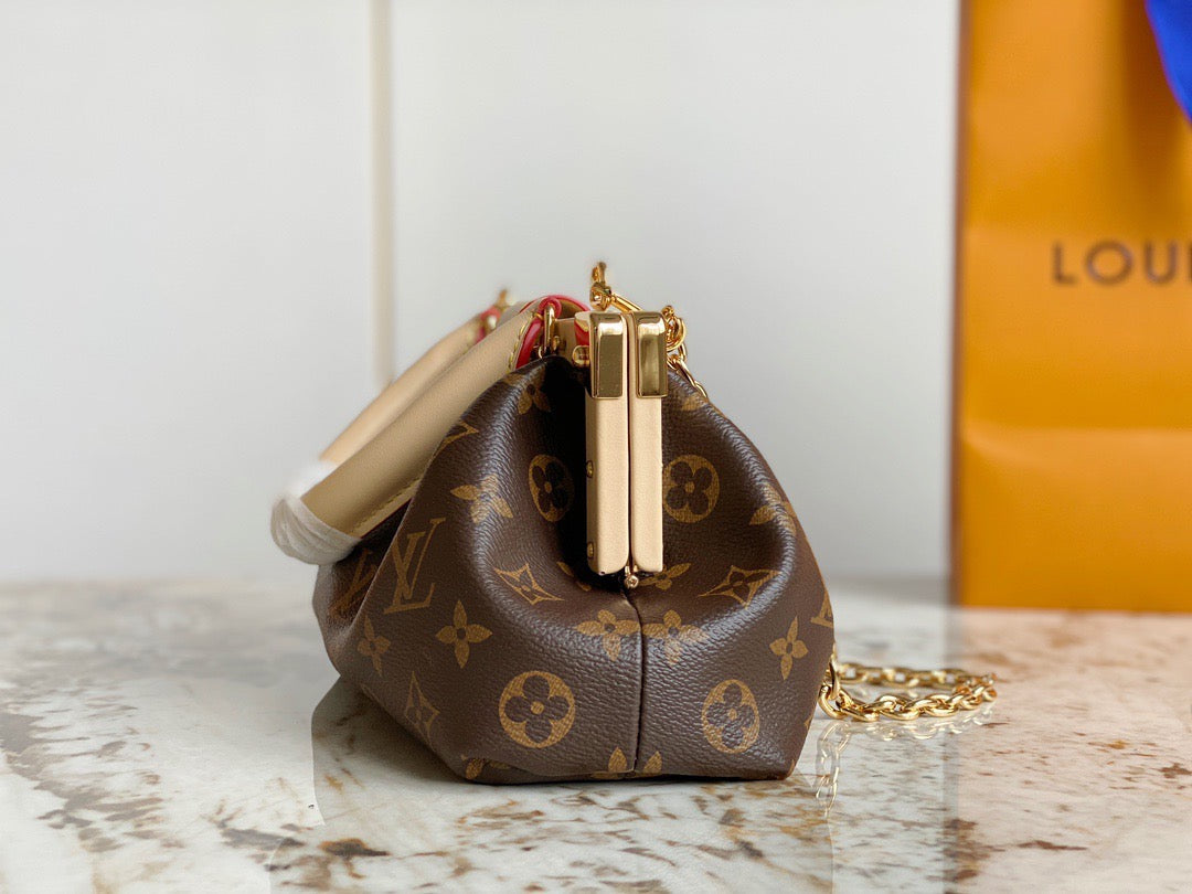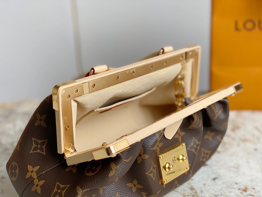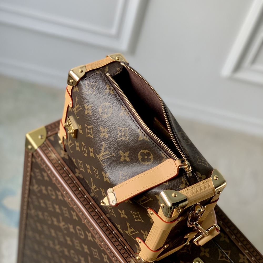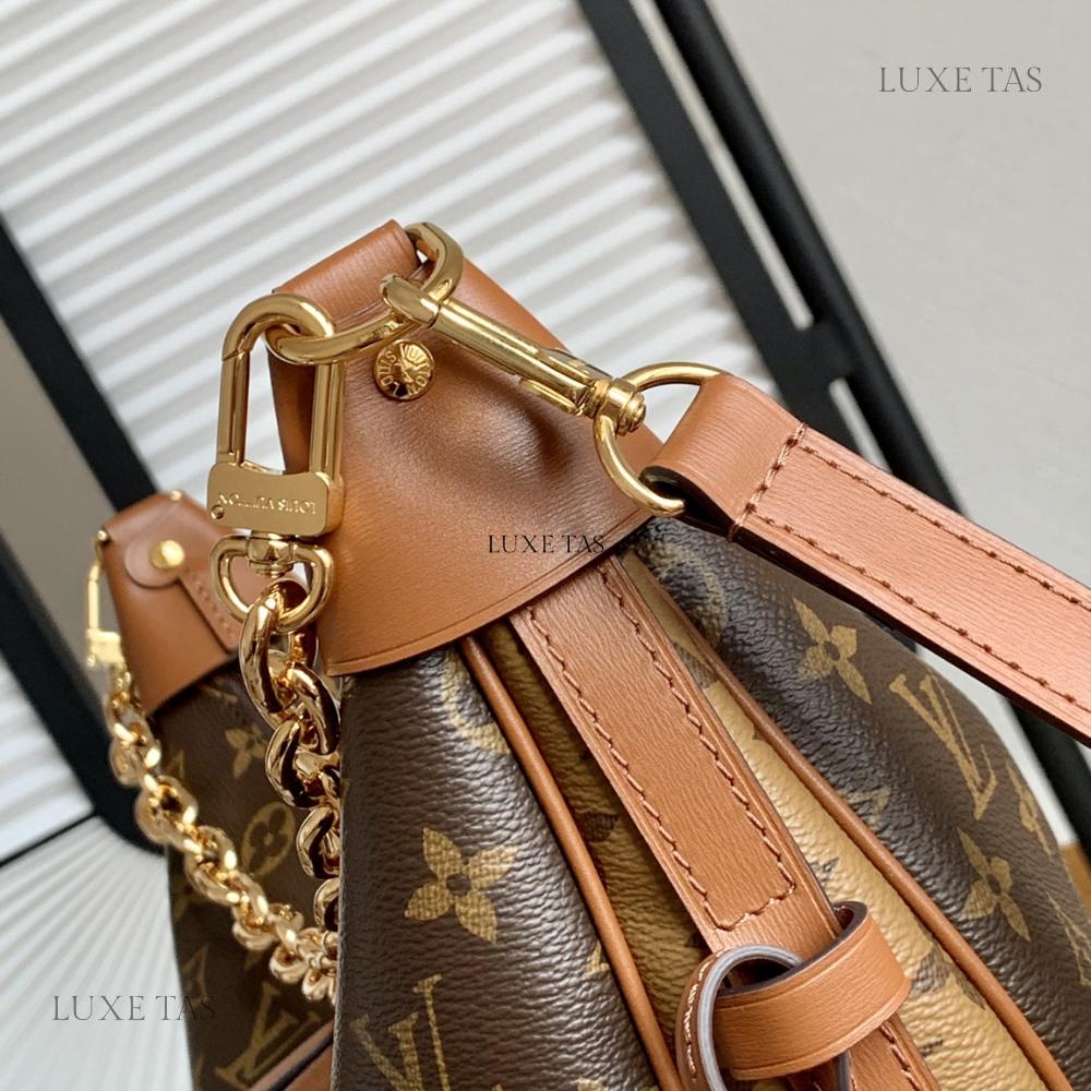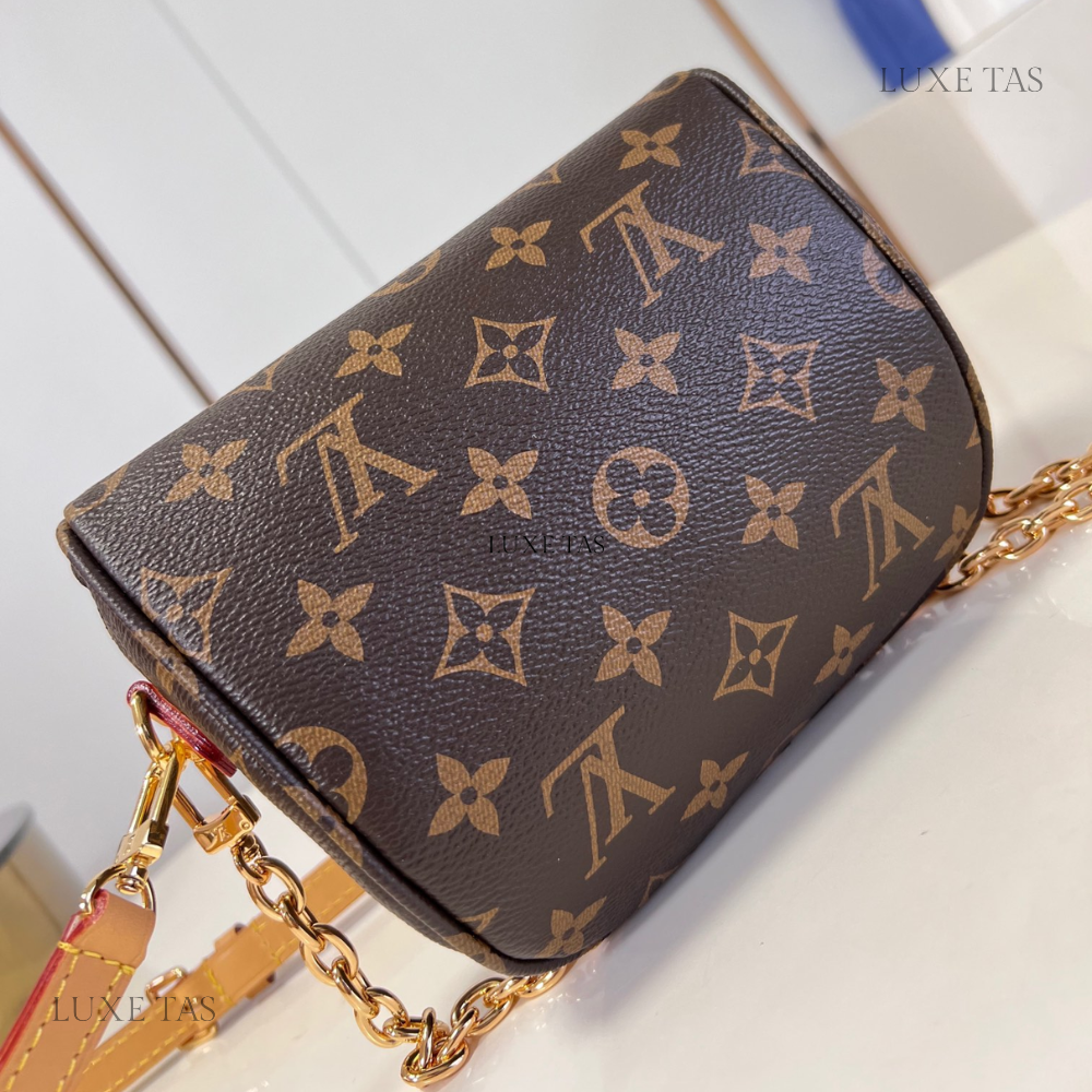 Introducing the Monogram Clutch, spotted at the Spring-Summer 2023 show. This clutch bag is crafted from the iconic Monogram canvas, complemented by natural calfskin trim and finished with luxurious gold-tone hardware, including the signature L*V S-lock and a riveted clasp with metallic corners. Designed with convenience in mind, the clutch comes with a rolled-leather top handle and a removable chain, which is attached to retractable and rotating chain mounts.