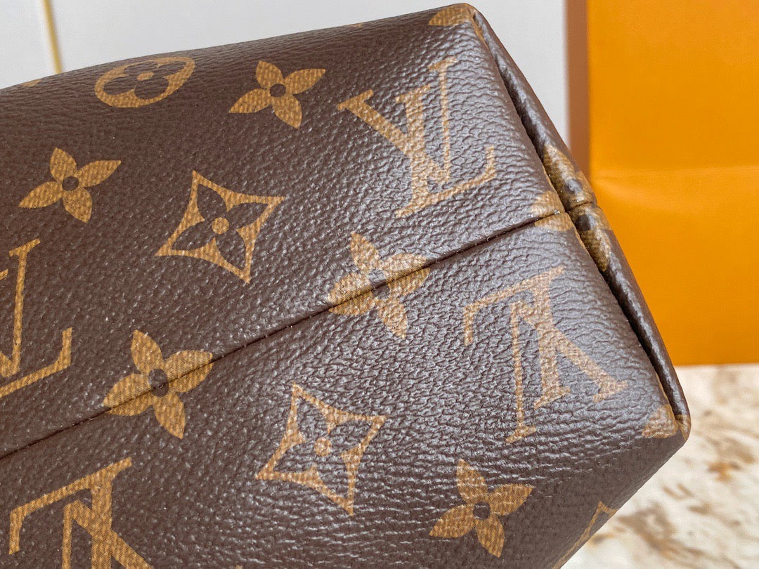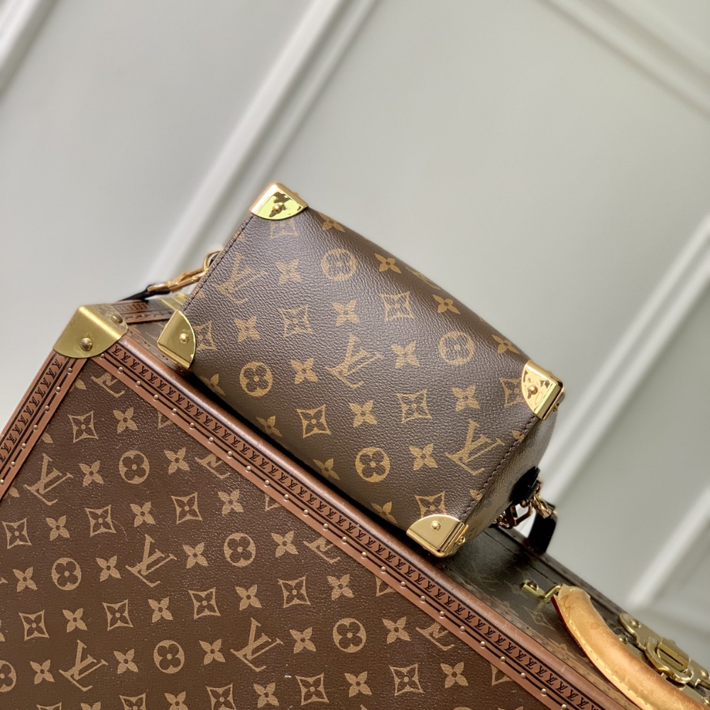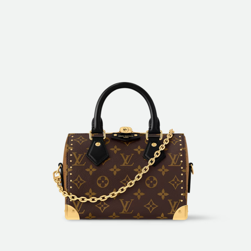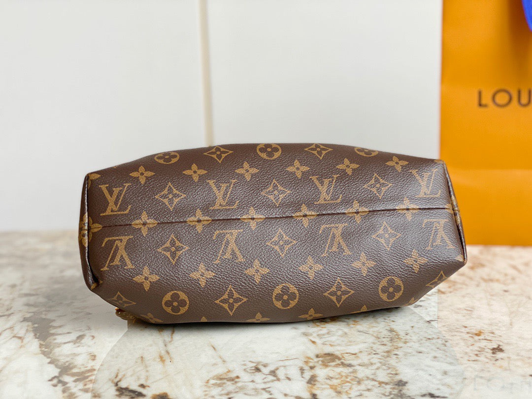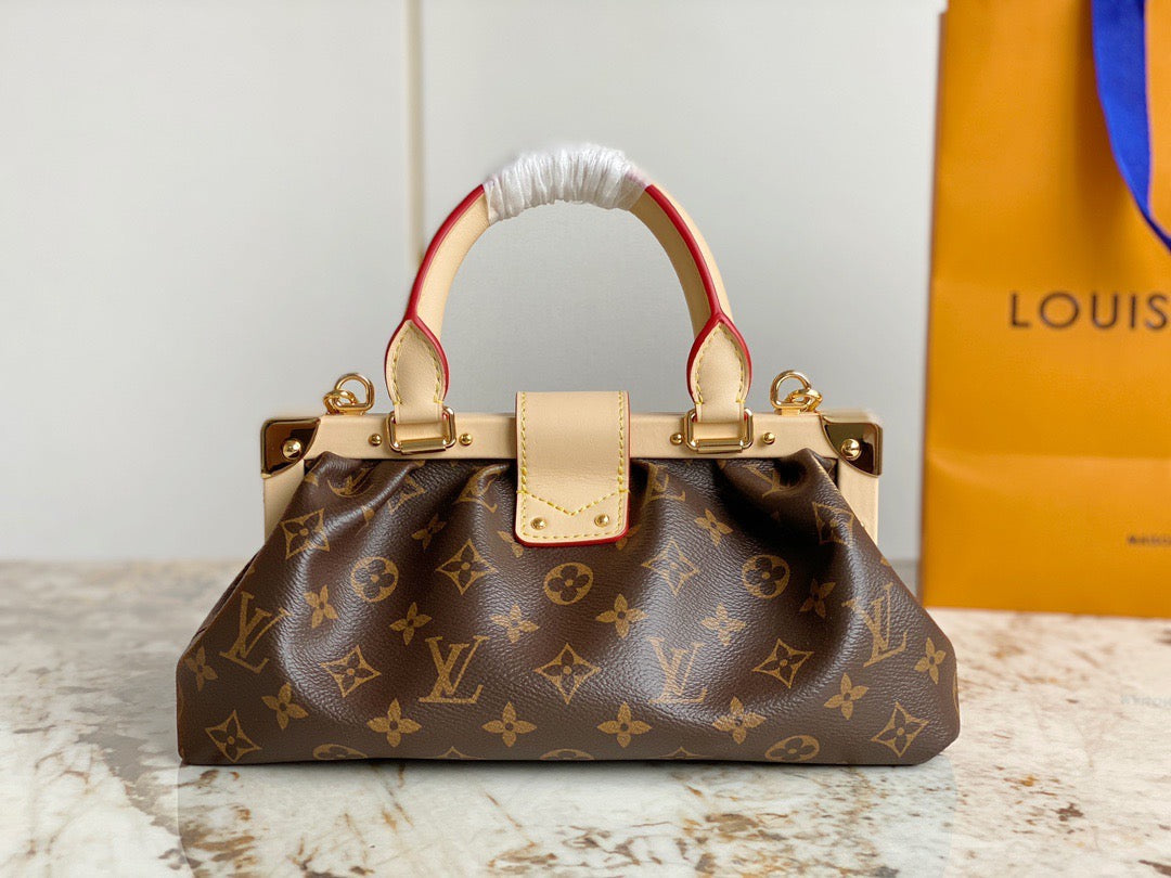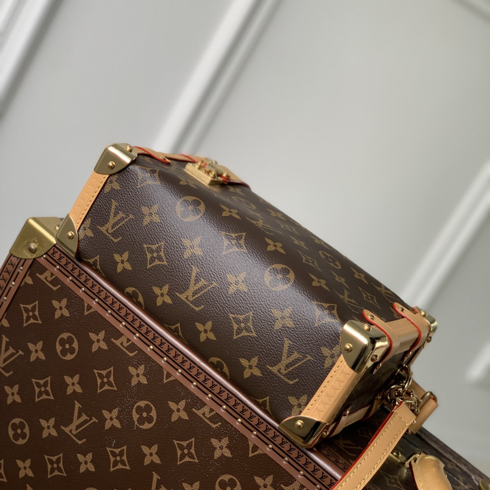 Introducing the Monogram Clutch, spotted at the Spring-Summer 2023 show. This clutch bag is crafted from the iconic Monogram canvas, complemented by natural calfskin trim and finished with luxurious gold-tone hardware, including the signature L*V S-lock and a riveted clasp with metallic corners. Designed with convenience in mind, the clutch comes with a rolled-leather top handle and a removable chain, which is attached to retractable and rotating chain mounts.