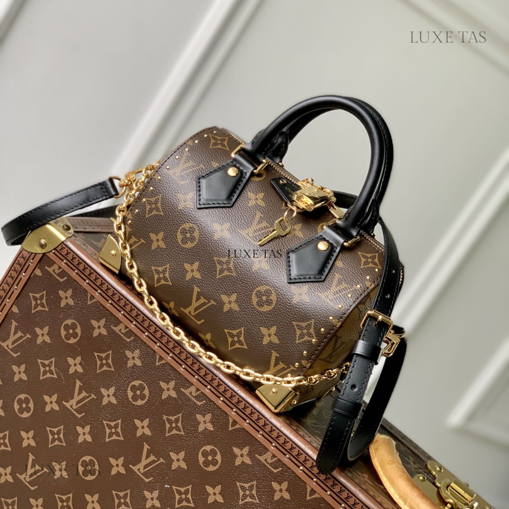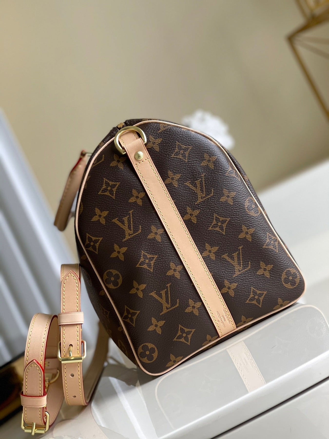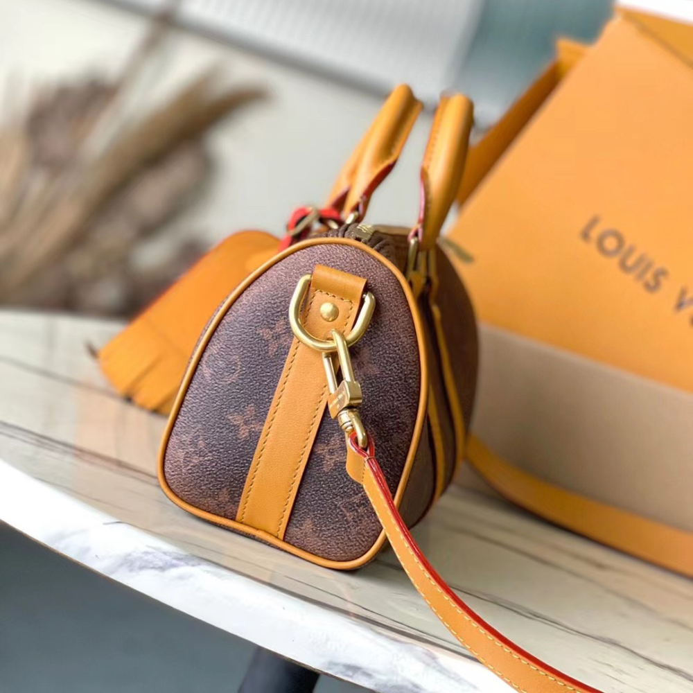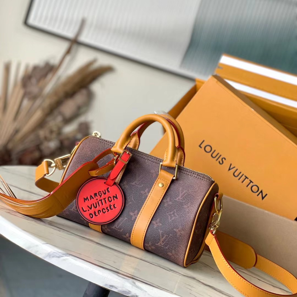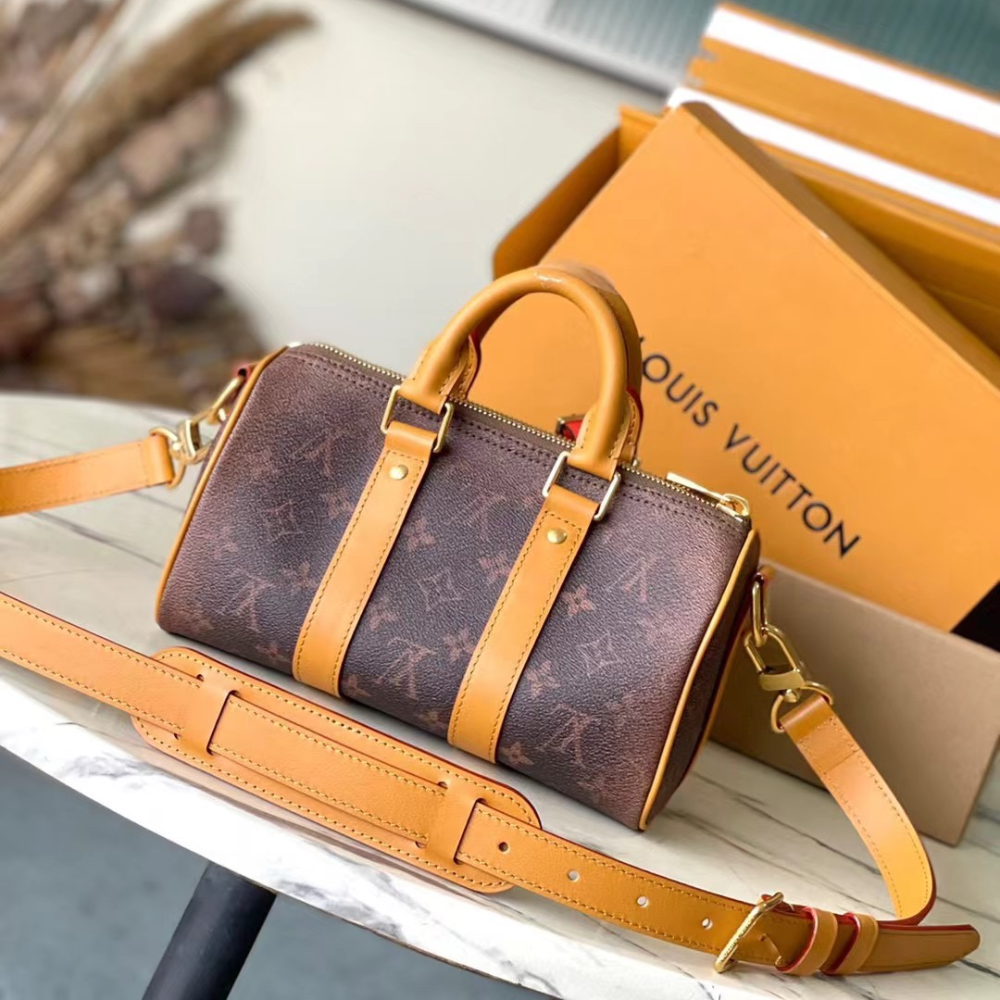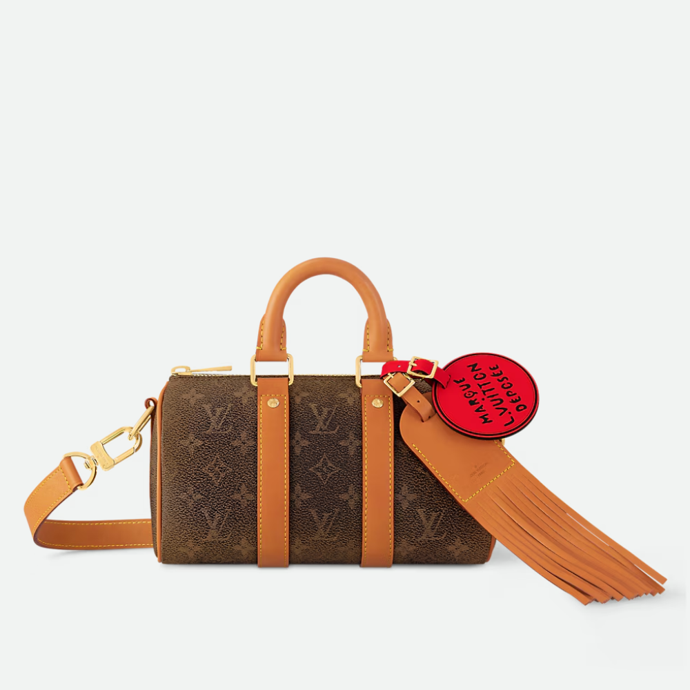 The Keepall Bandoulière 25 embraces a western-inspired aesthetic with Monogram Dust canvas, showcasing a faded rendition of the iconic Monogram pattern. Its aged cowhide leather accents, including top handles, a detachable shoulder strap, and lateral reinforcement bands, add to the vintage appeal. Compact yet functional, this bag is ideal for carrying essentials like a phone, wallet, and more.
