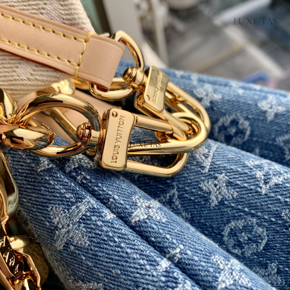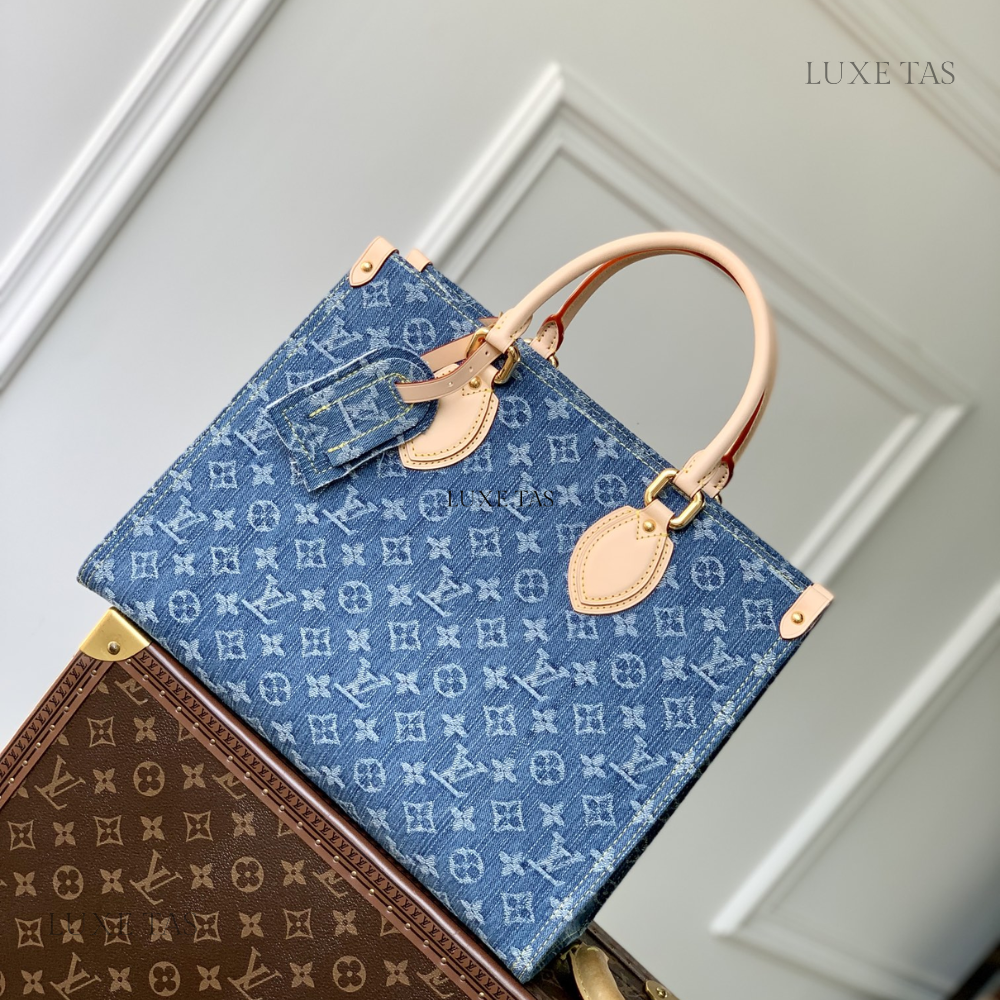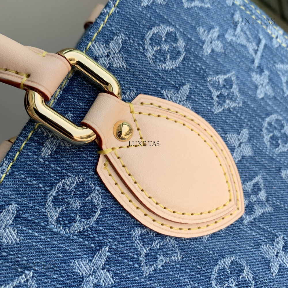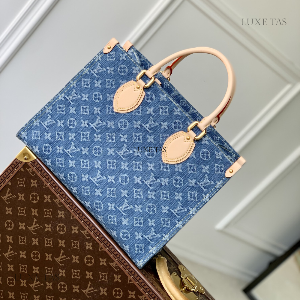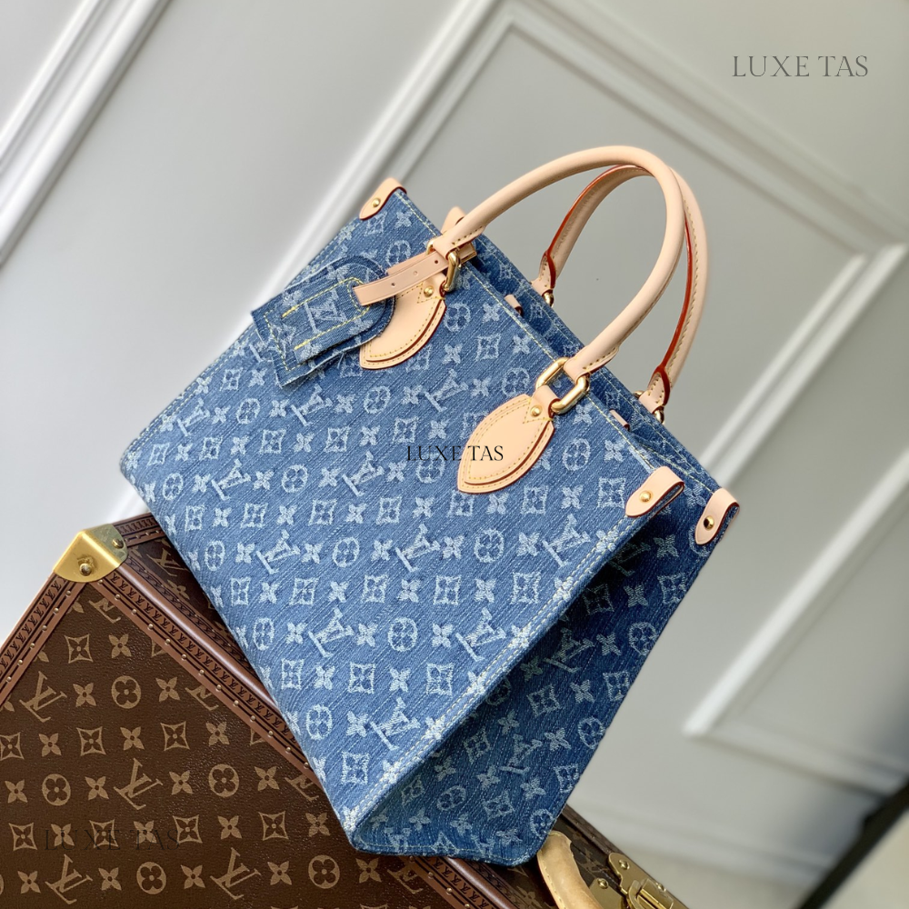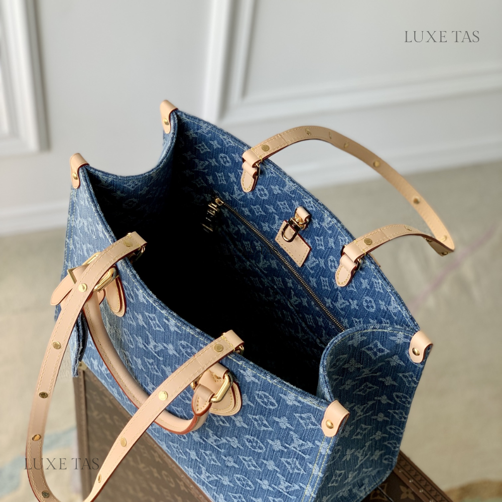 The OnTheGo MM tote bag is now available in the latest Monogram Denim canvas, complemented by natural cowhide leather accents on the top handles and handle mounts. Boasting a square shape, this spacious tote offers ample room, making it suitable for carrying a laptop. Featuring rolled leather top handles and two longer shoulder straps, it provides versatile carrying options for everyday use.