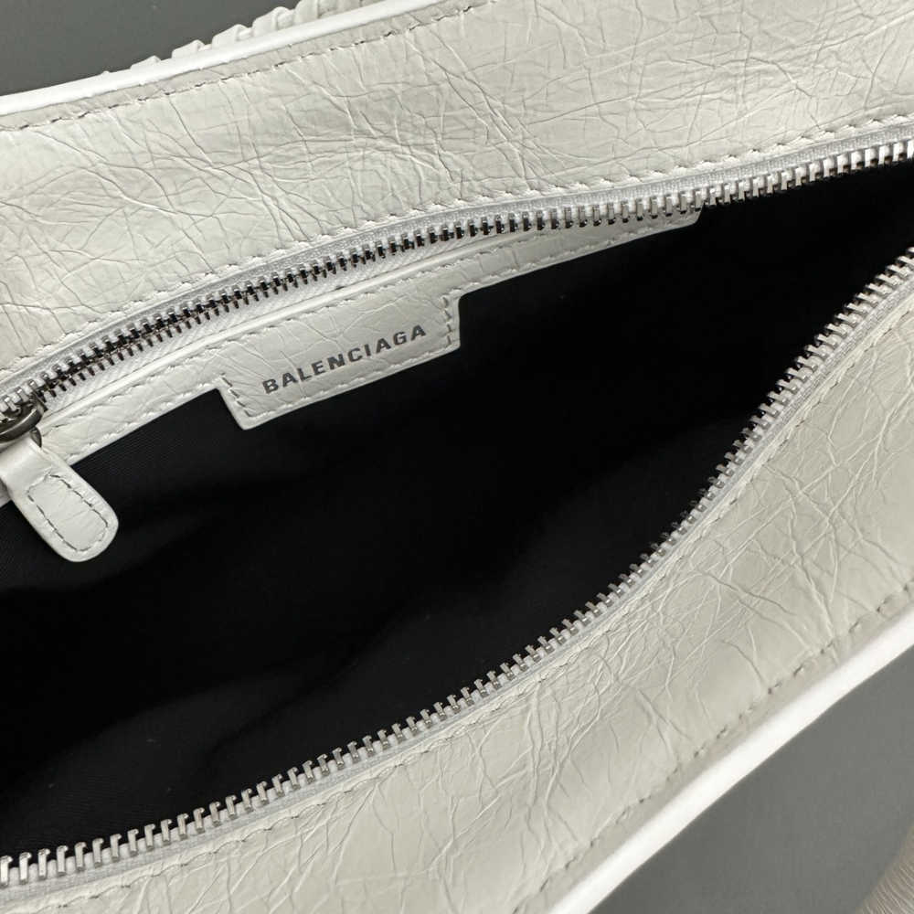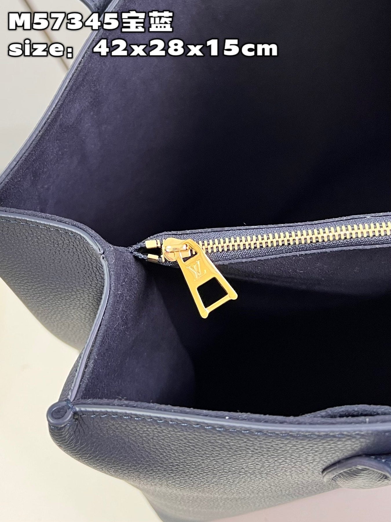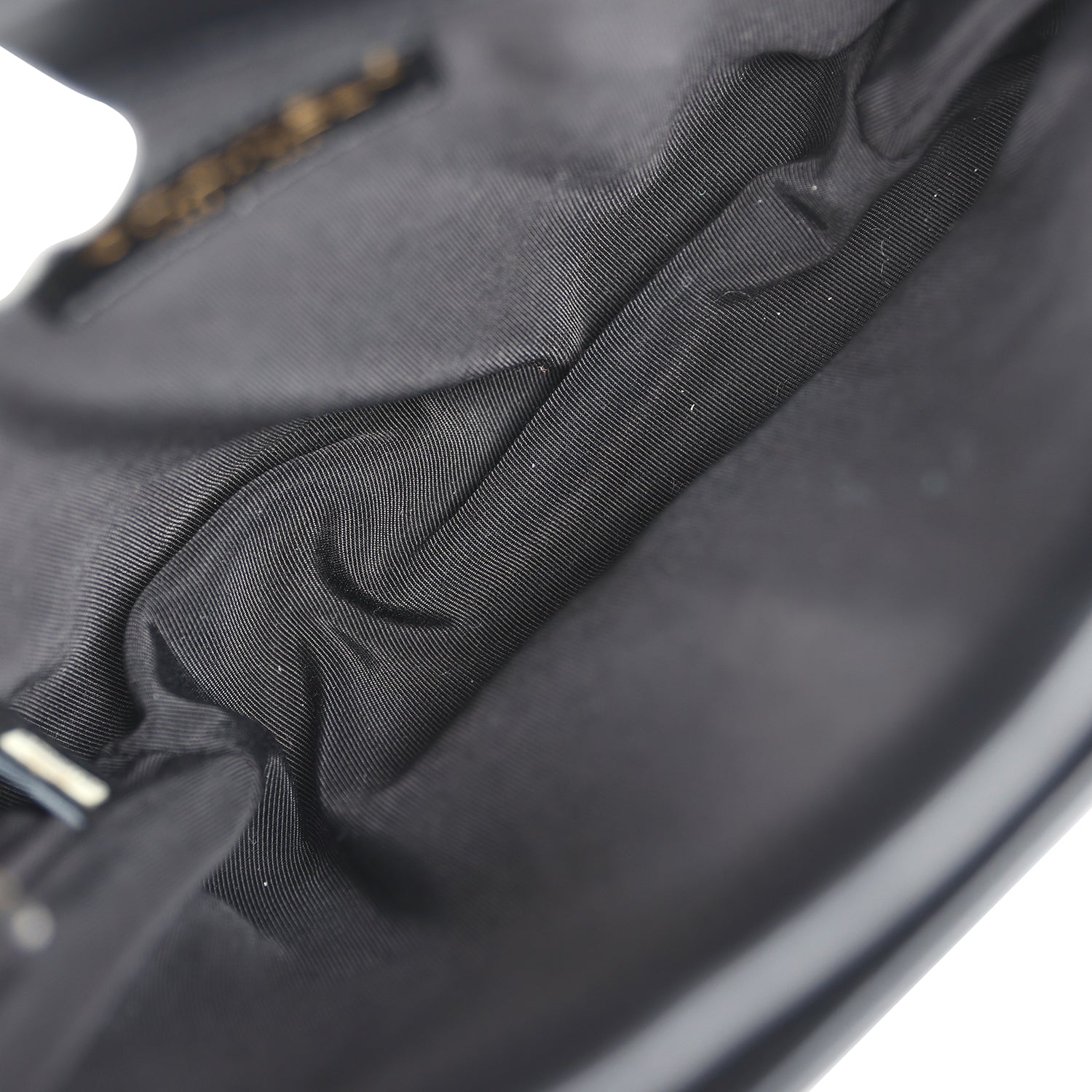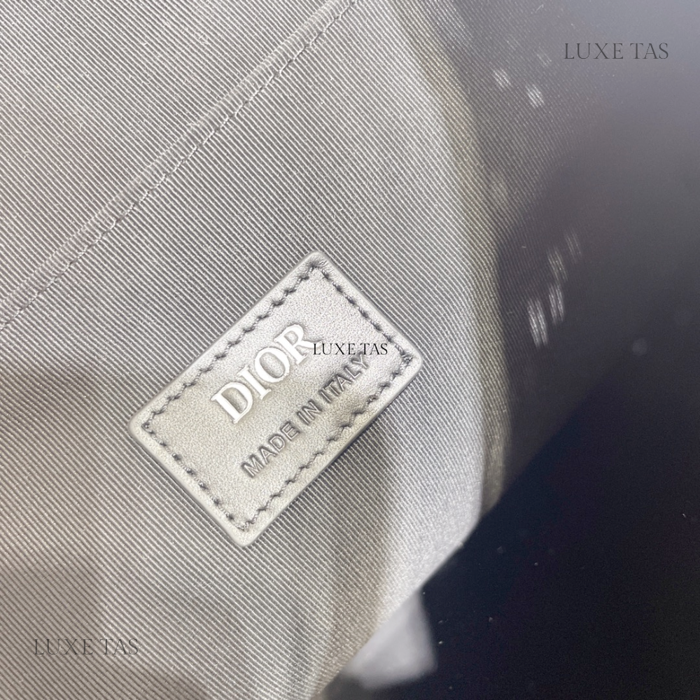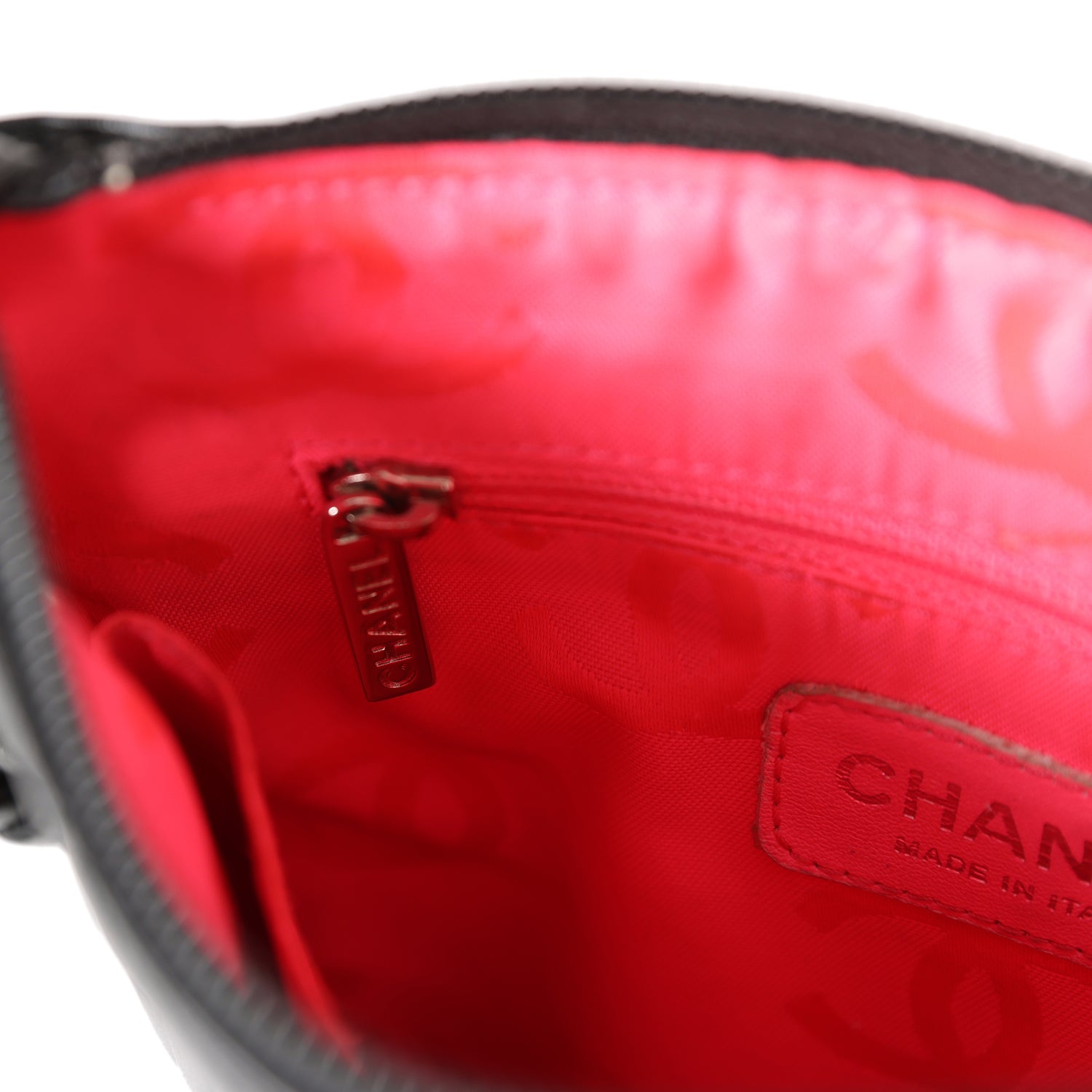 The interior is lined in black leather and has one zip pocket on the rear wall with logo pull and one slit pocket on front wall.