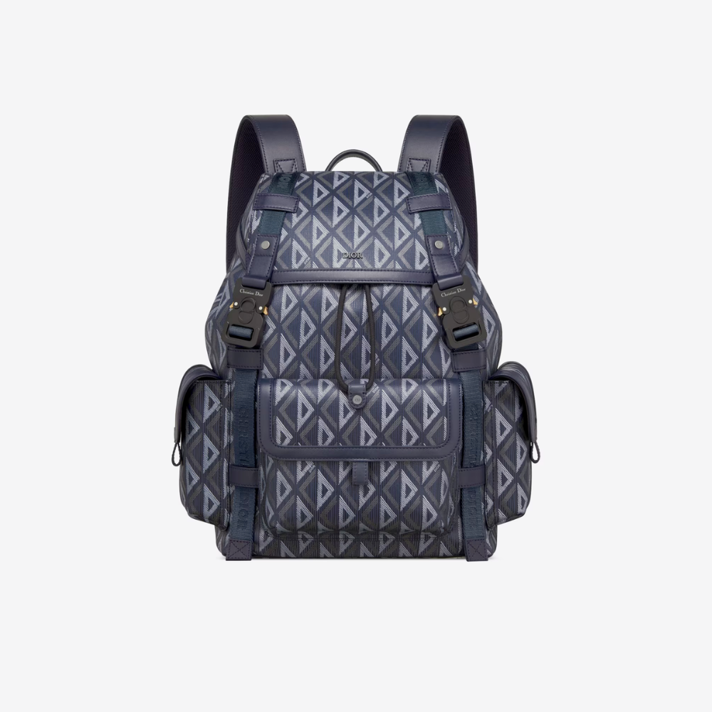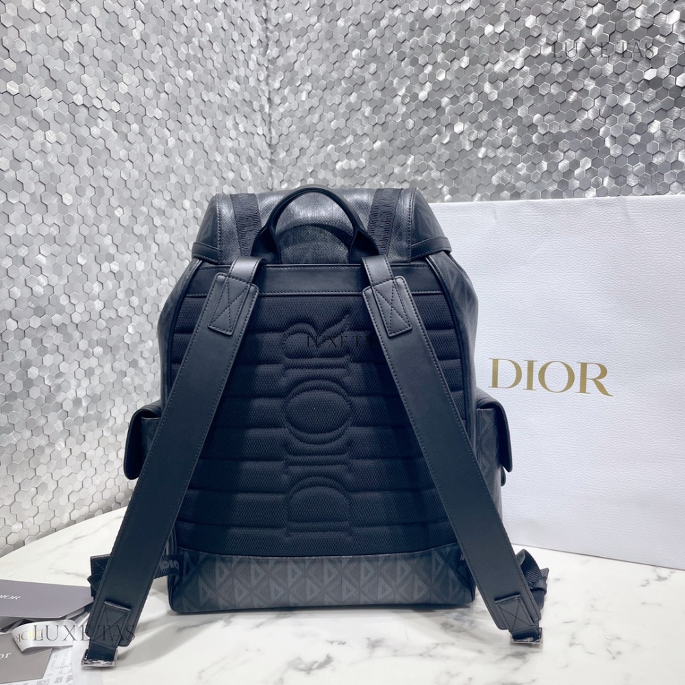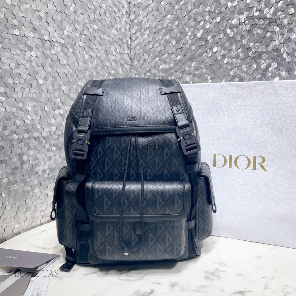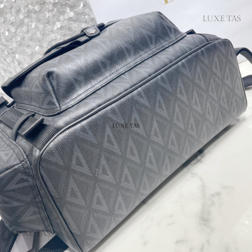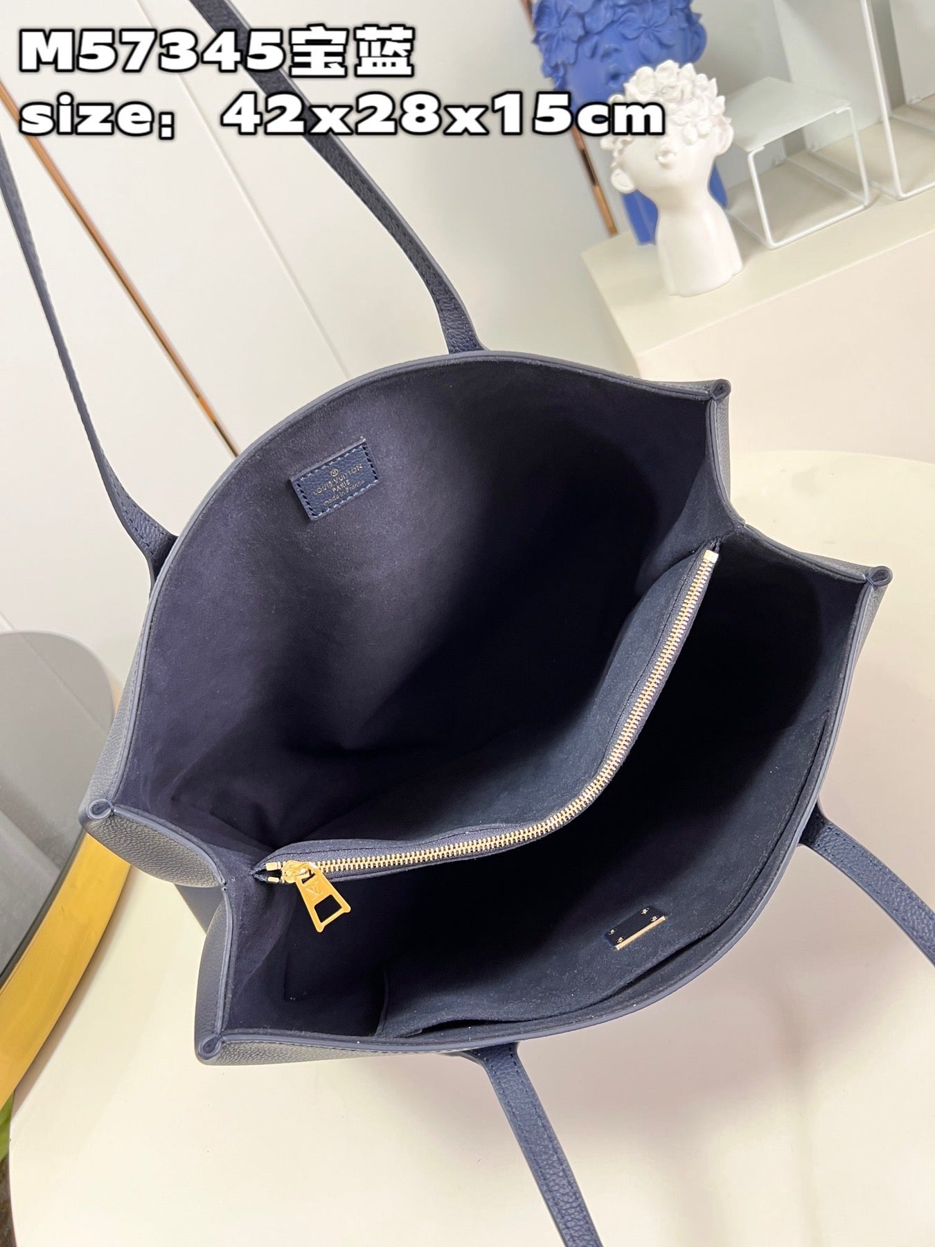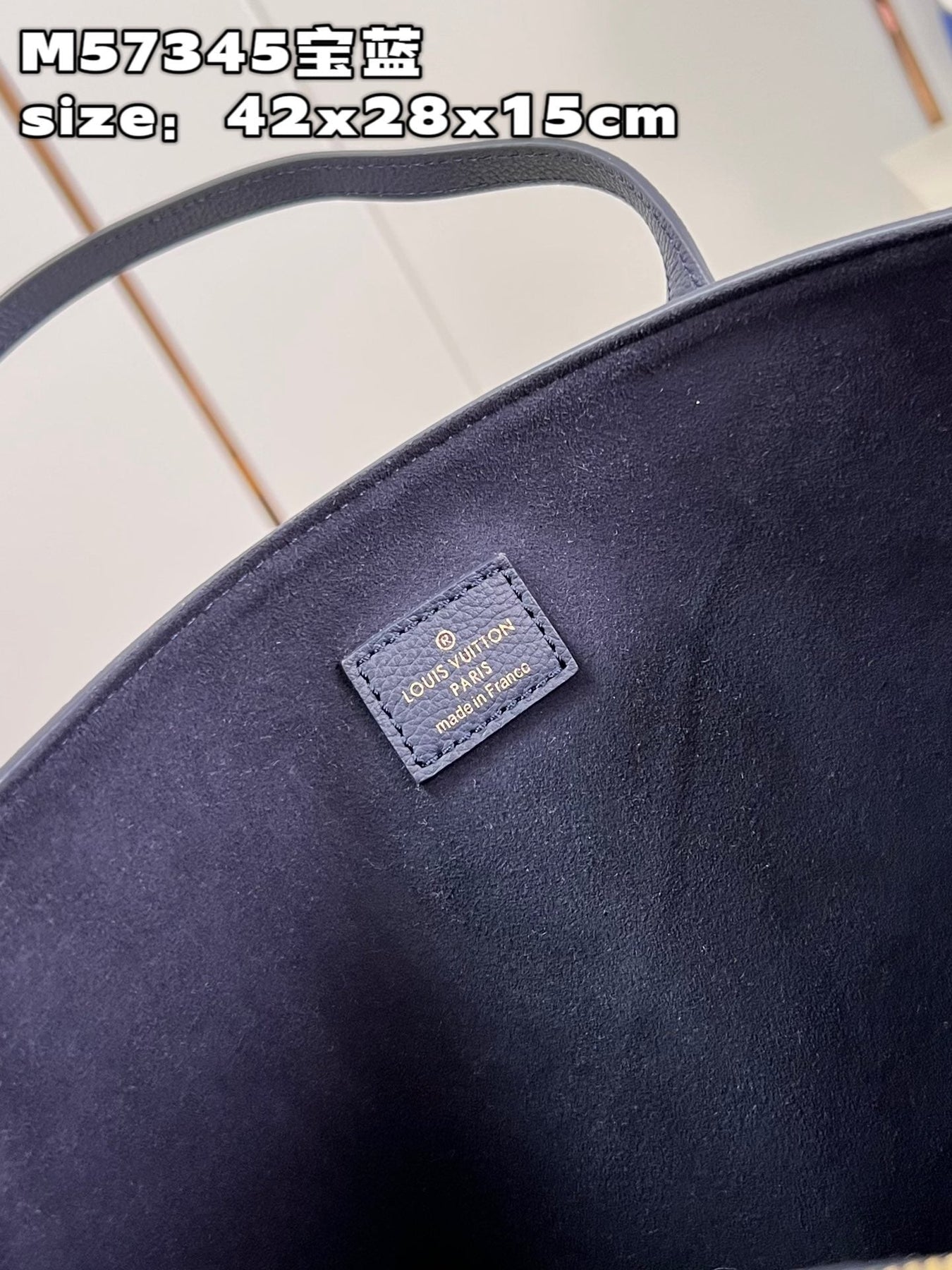 The interior is lined in black leather and has one zip pocket on the rear wall with logo pull and one slit pocket on front wall.