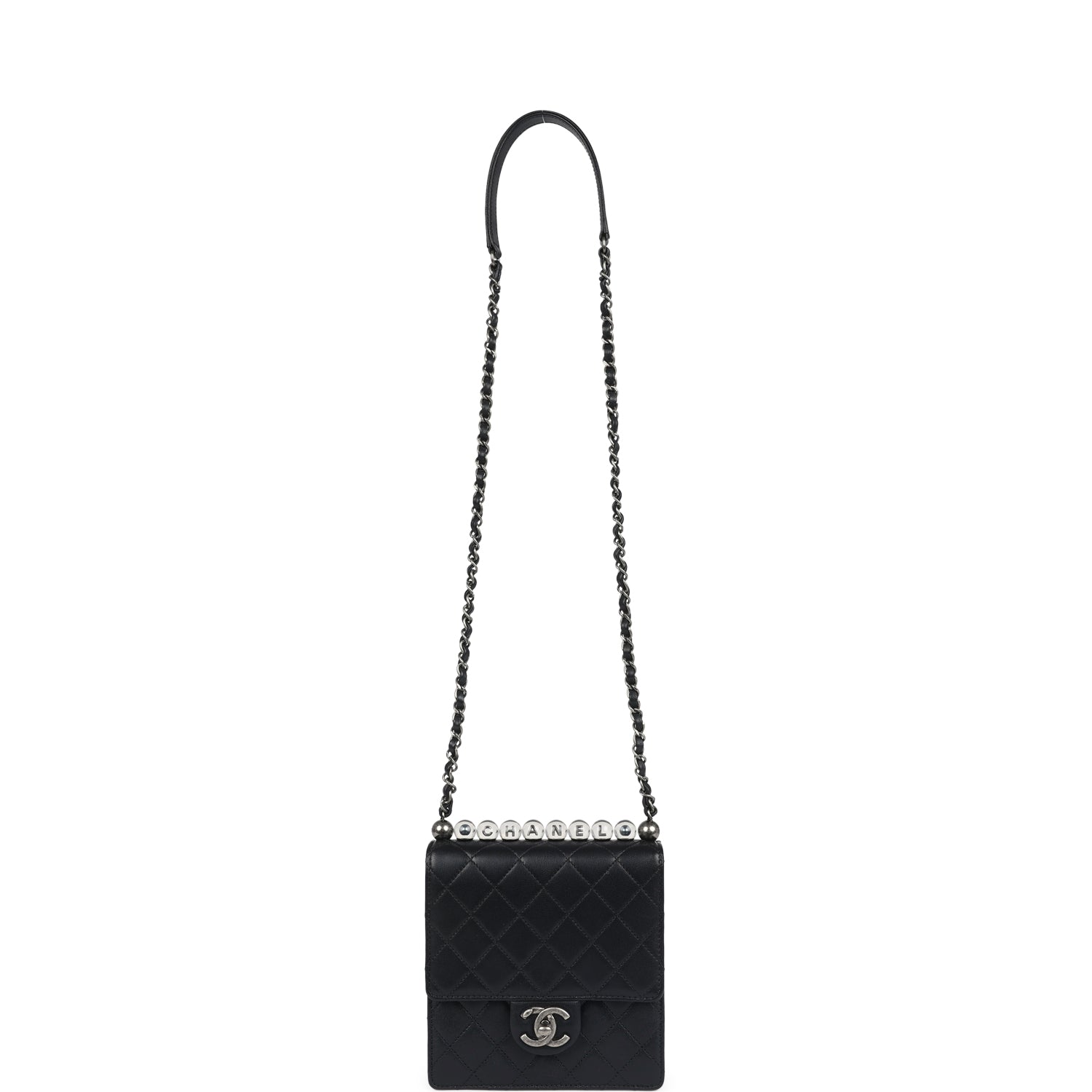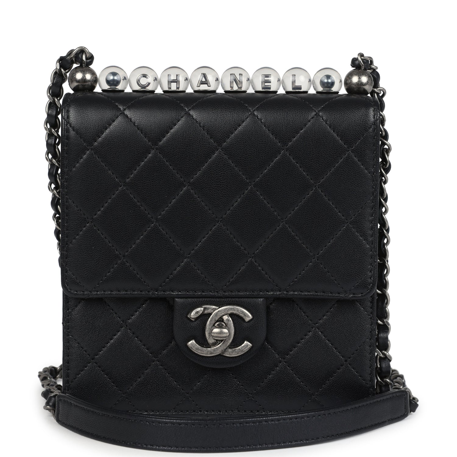 Regular price $1,970.00 Sale price $450.00 Save $1,520.00This Chanel Chic Pearls Flap Bag is of black calfskin leather with aged ruthenium hardware and features Chanel's signature CC turnlock closure, clear acrylic imitation pearls across the top, and an interwoven aged ruthenium chain link with black leather shoulder strap.