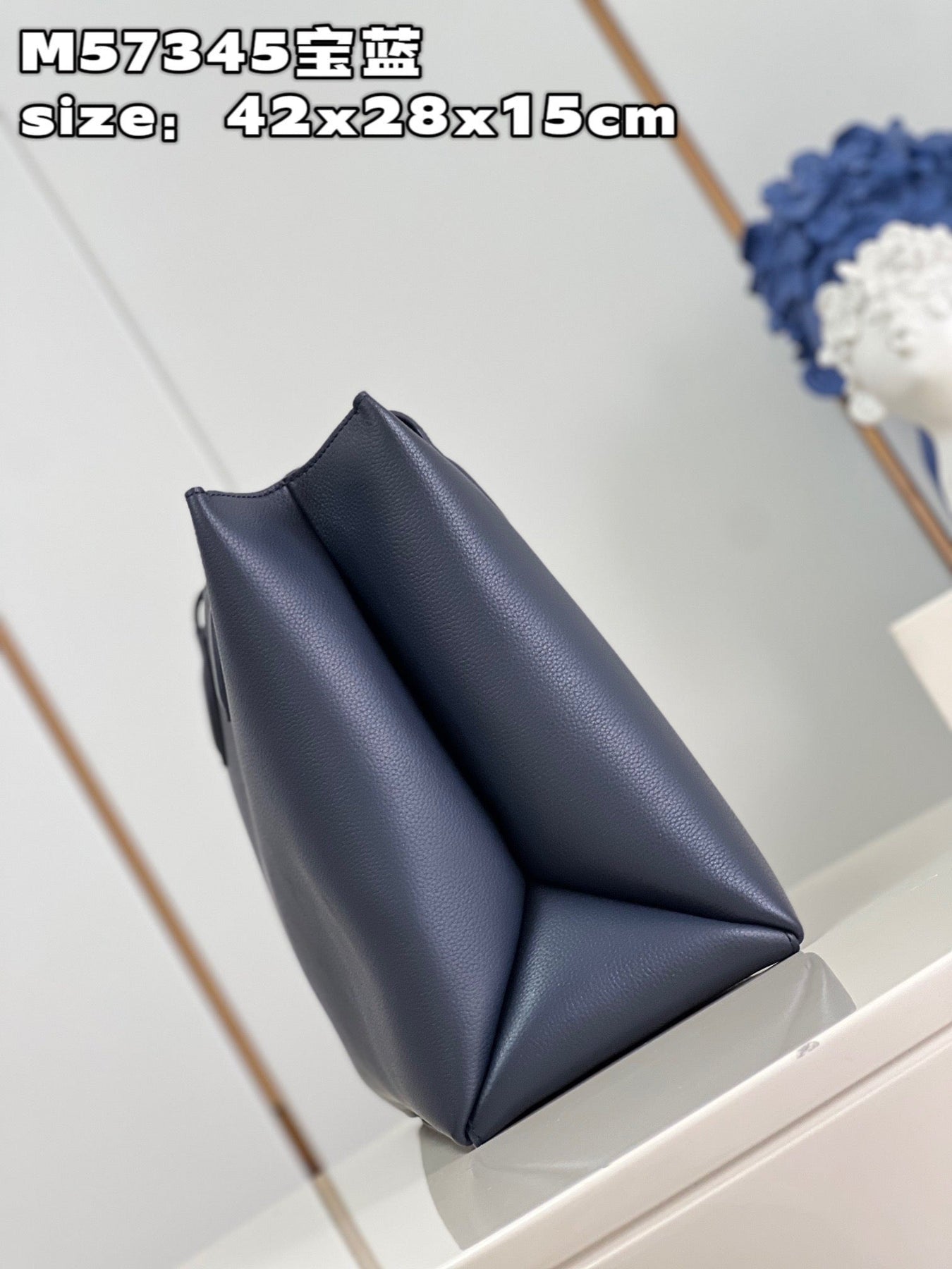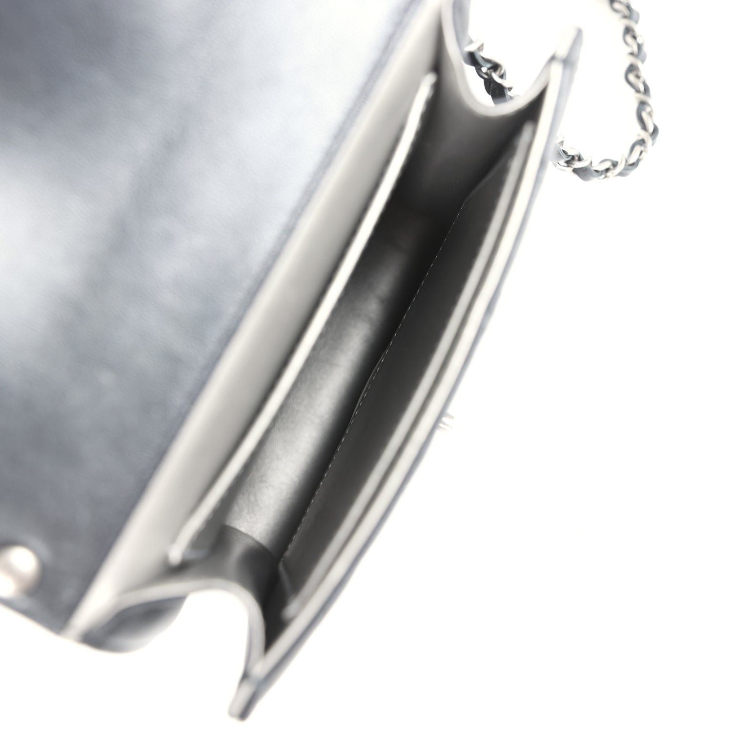 The interior is lined with metallic grey leather with one open pocket on each side wall.