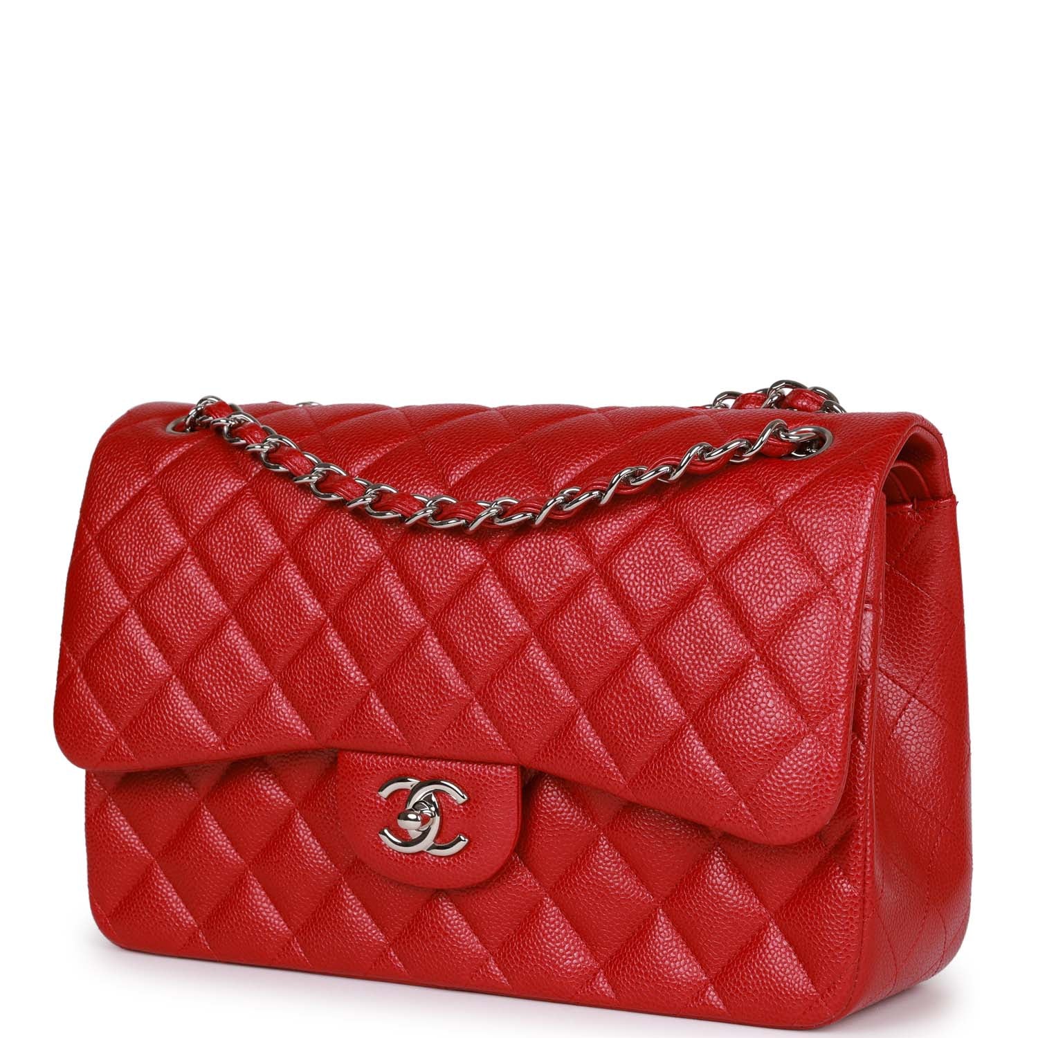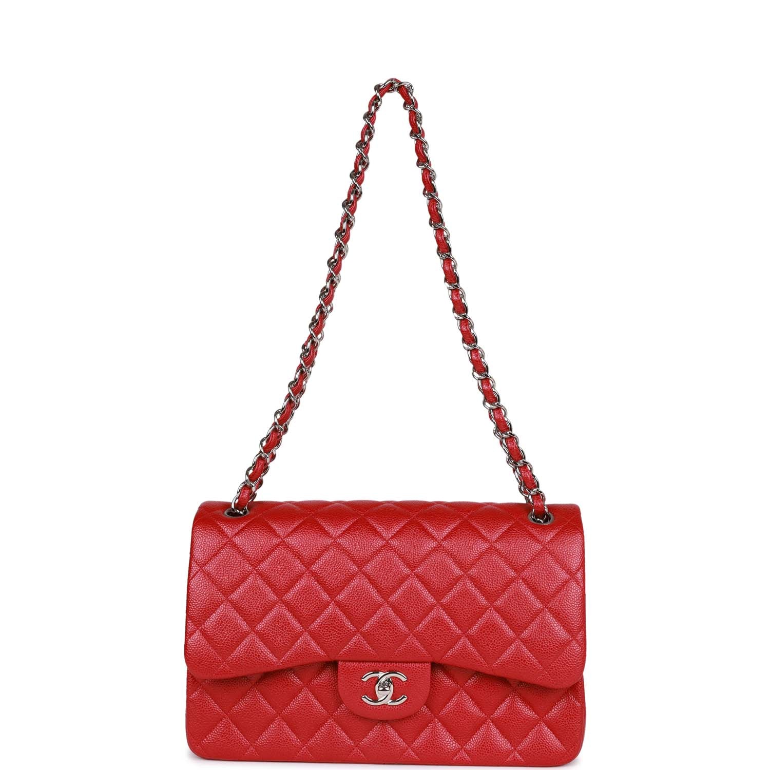 Regular price $2,230.00 Sale price $440.00 Save $1,790.00This Jumbo Classic Double Flap bag is in Red quilted caviar leather with silver tone hardware, front flap with CC turnlock closure, half moon back pocket and adjustable interwoven silver tone chain link and red leather shoulder/crossbody strap.