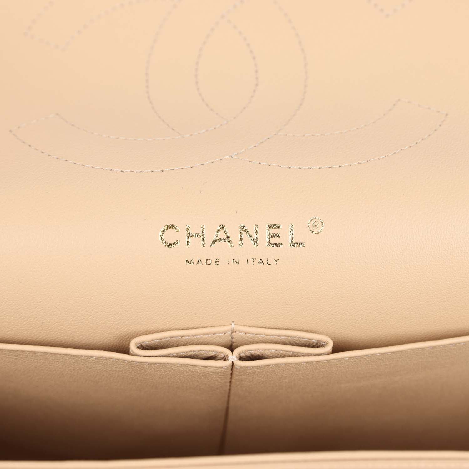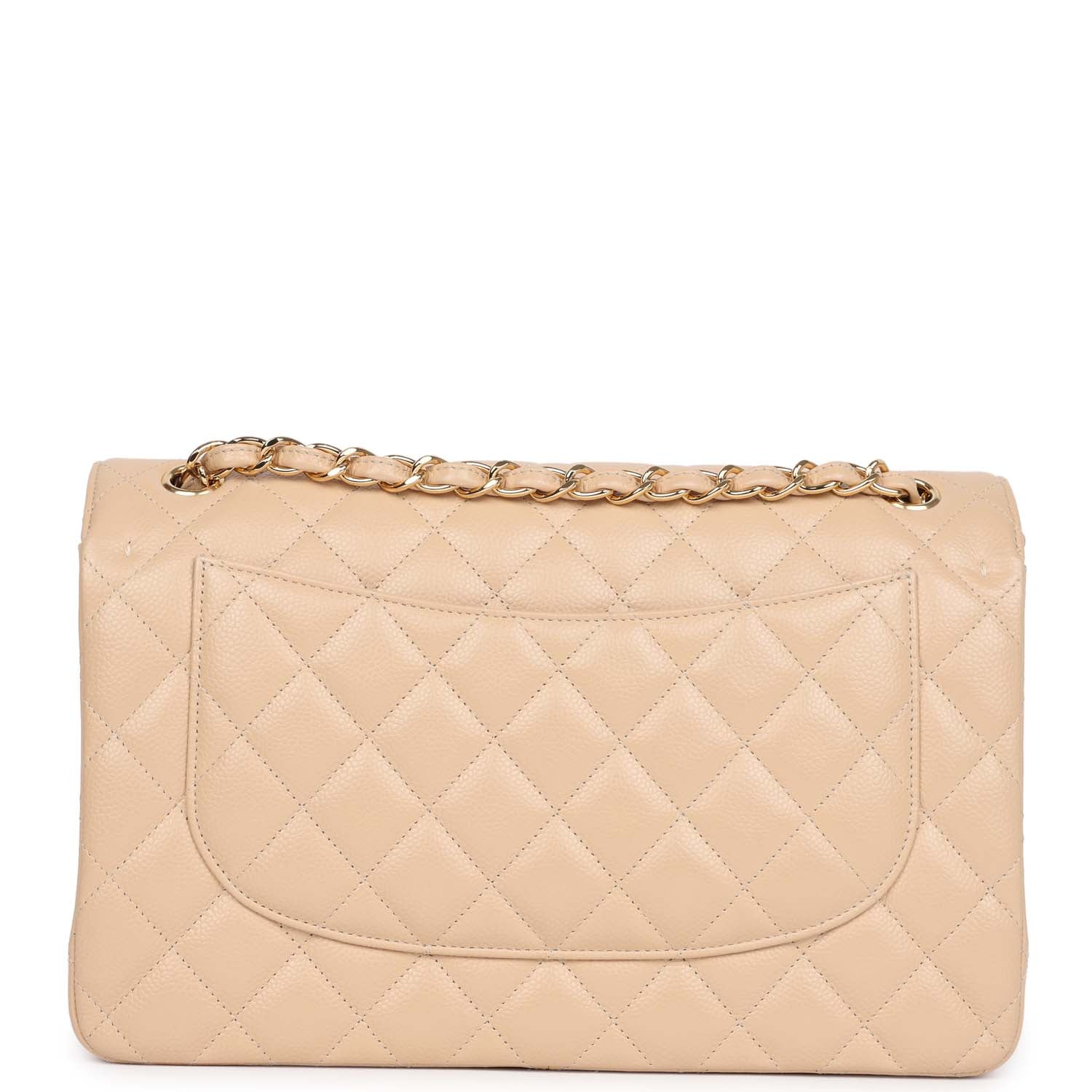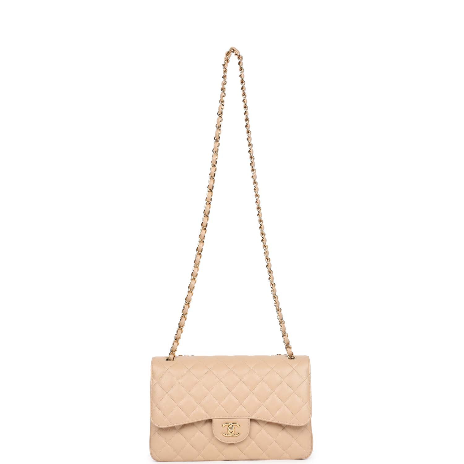 Regular price $1,680.00 Sale price $450.00 Save $1,230.00This Jumbo Classic Double Flap bag is in light beige caviar leather with gold tone hardware and features a front flap with signature CC turnlock closure, half moon back pocket, and adjustable interwoven gold tone chain link and light beige leather shoulder strap.