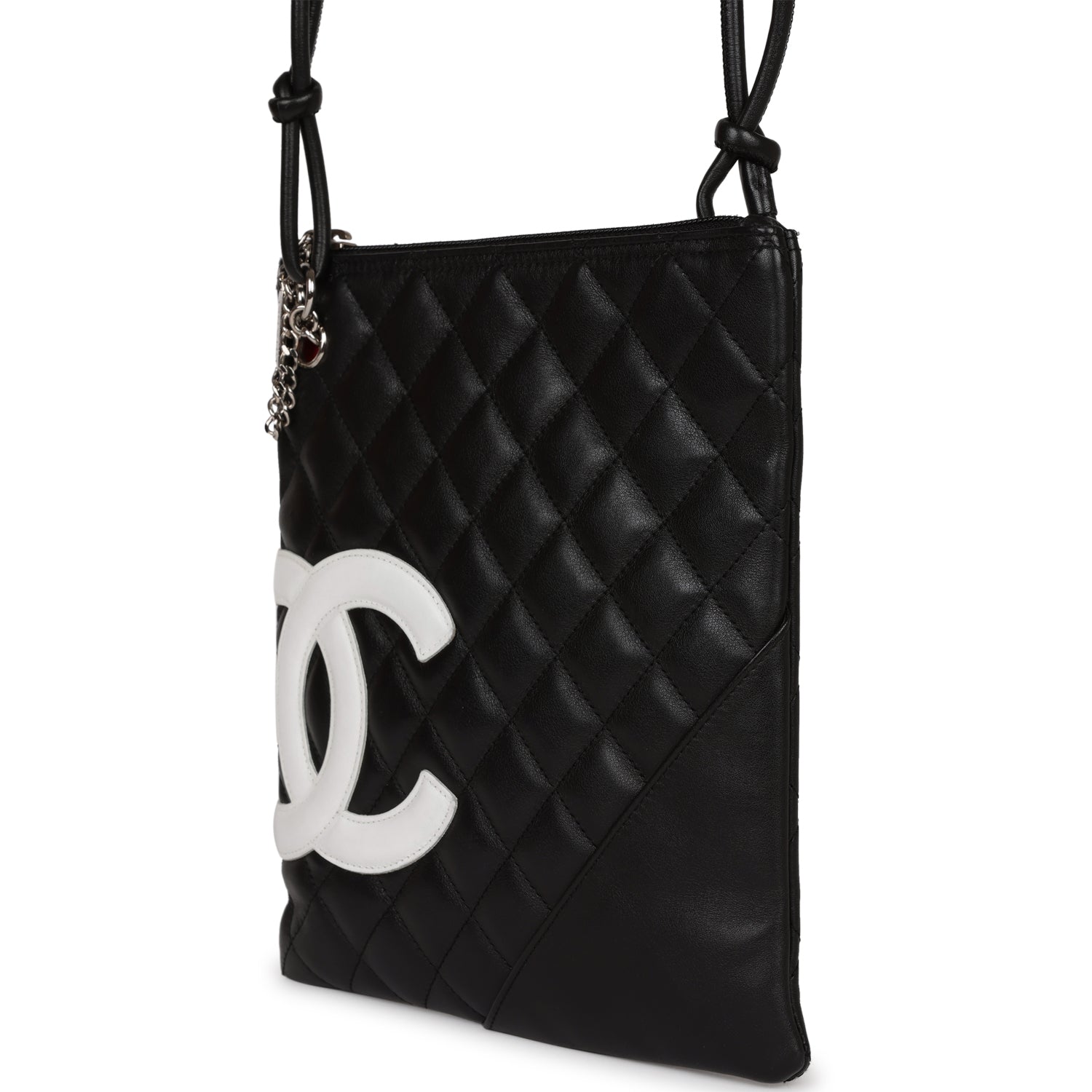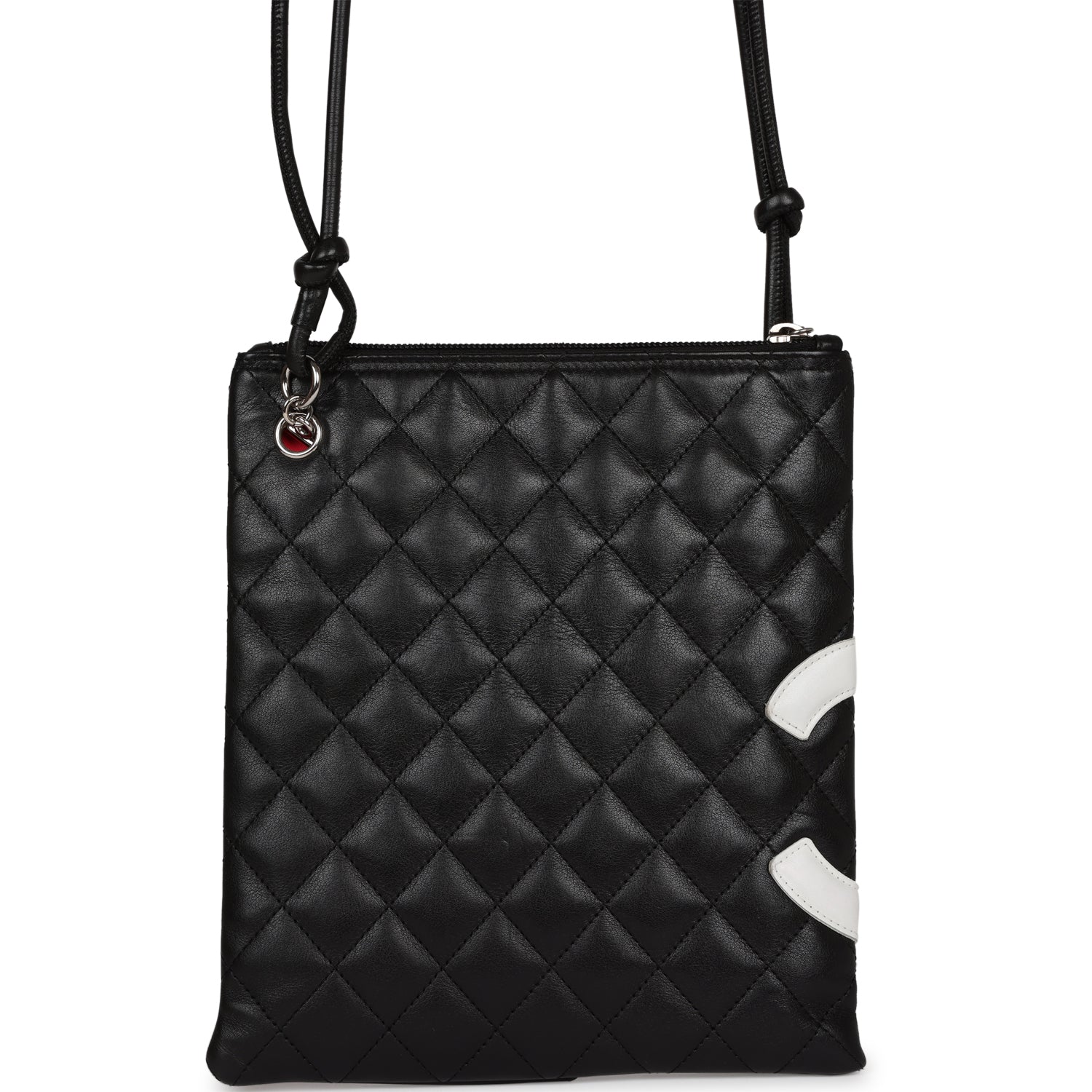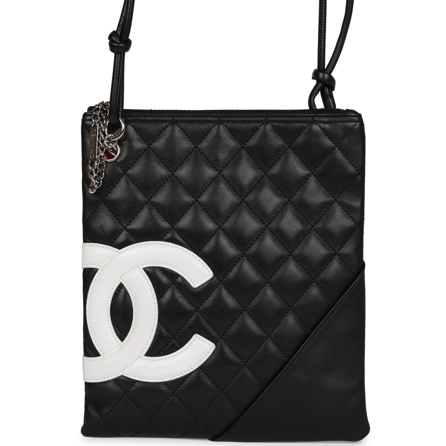 Regular price $1,830.00 Sale price $450.00 Save $1,380.00This New Cambon Flat Messenger is in Black and White calfskin leather with silver hardware, featuring a top zipper closure, tonal stitching, 2 long black leather cord straps, and a mini pocket on the front.