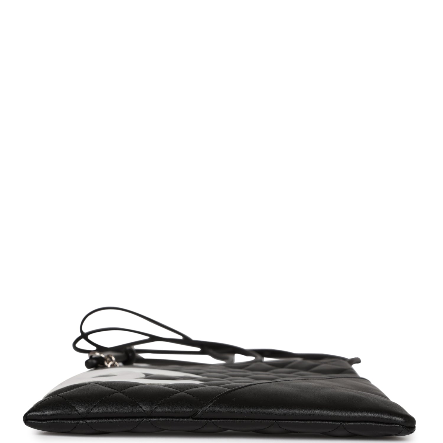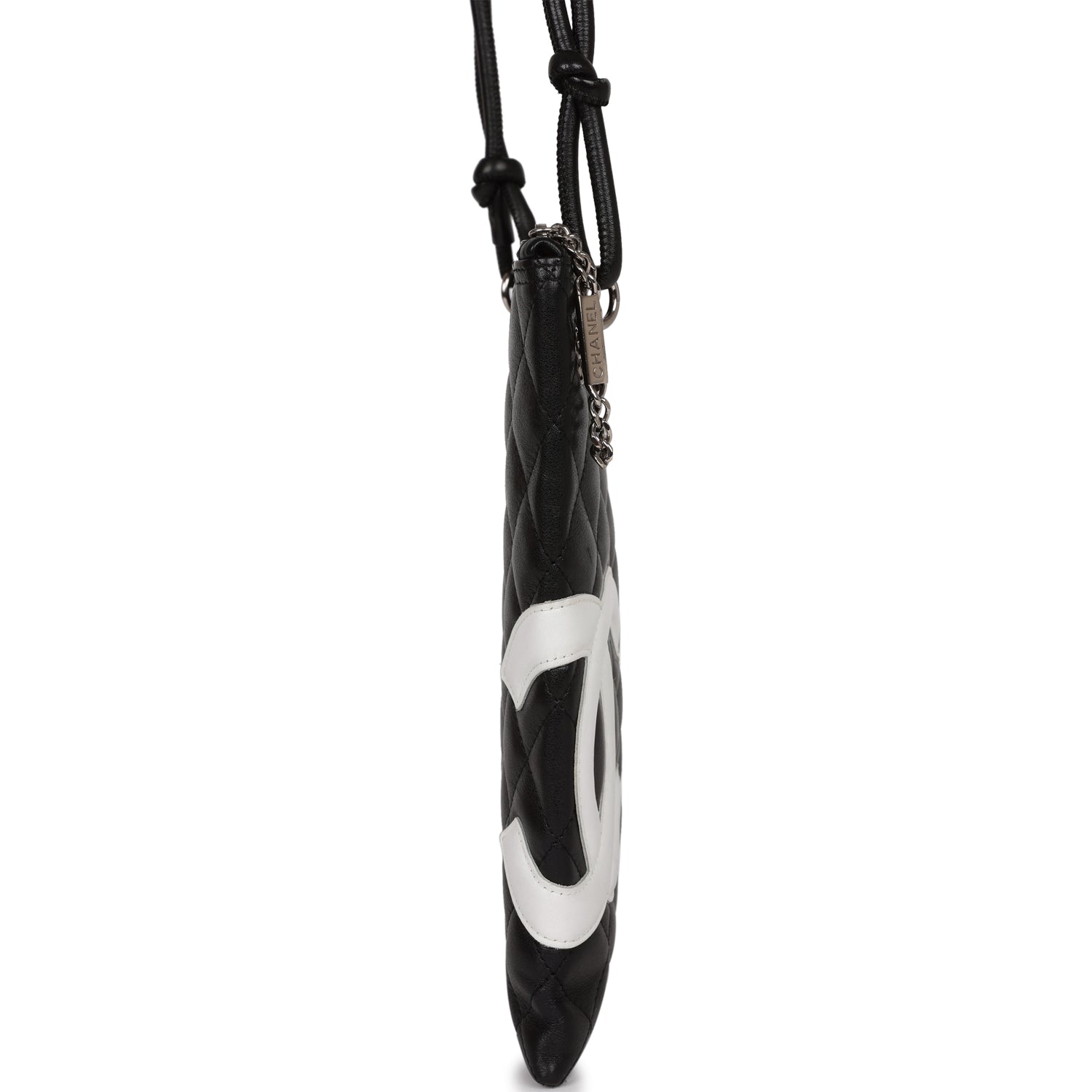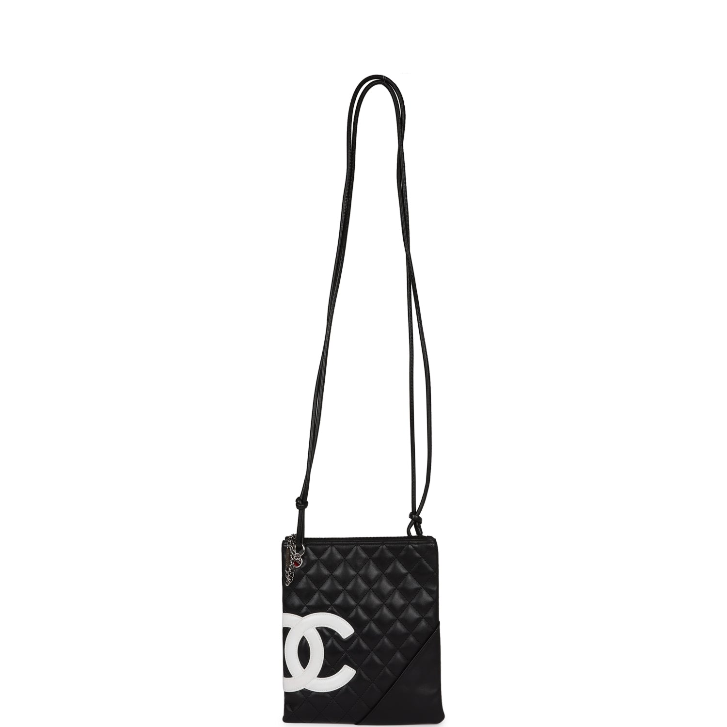 Regular price $1,830.00 Sale price $450.00 Save $1,380.00This New Cambon Flat Messenger is in Black and White calfskin leather with silver hardware, featuring a top zipper closure, tonal stitching, 2 long black leather cord straps, and a mini pocket on the front.