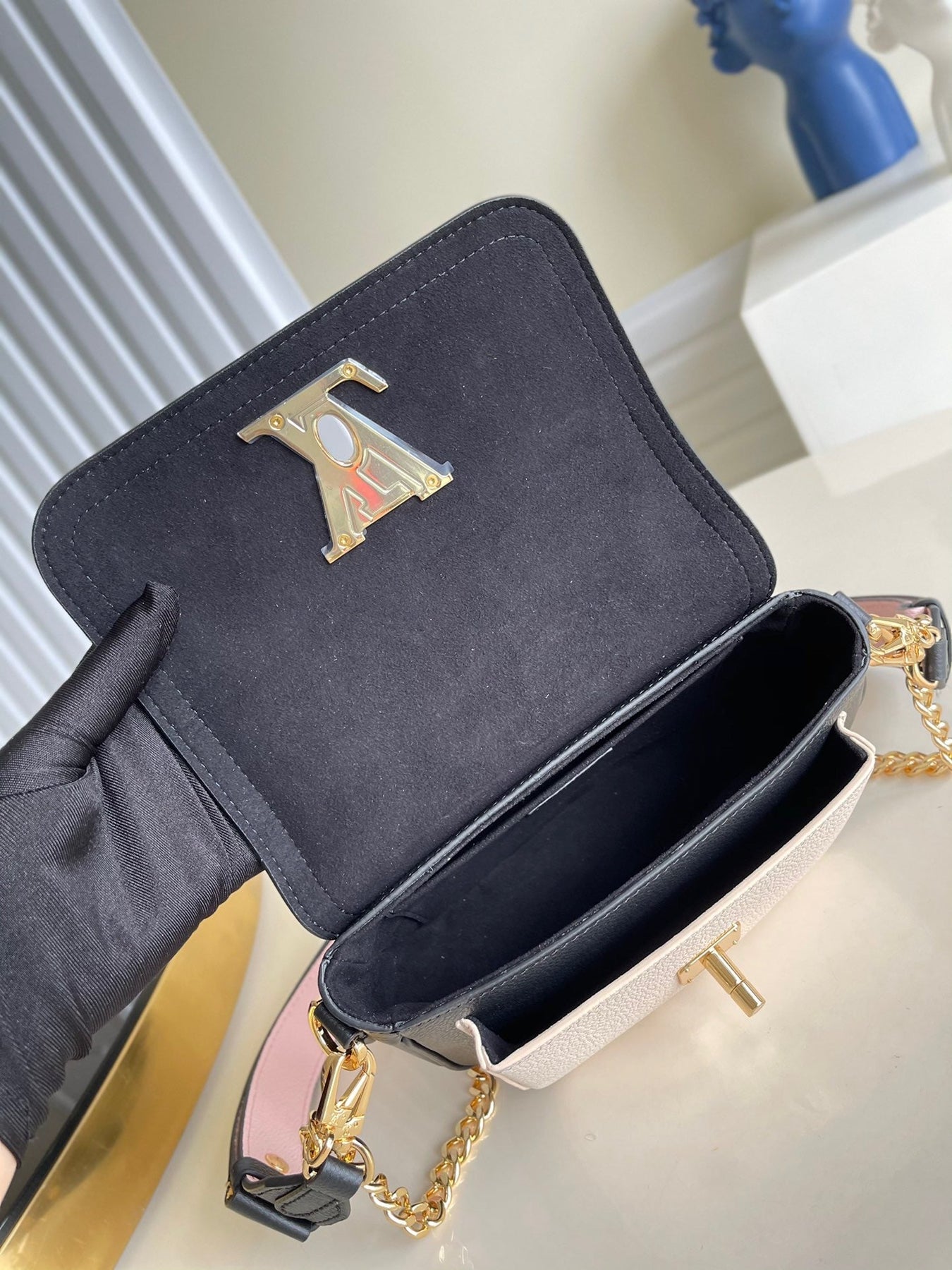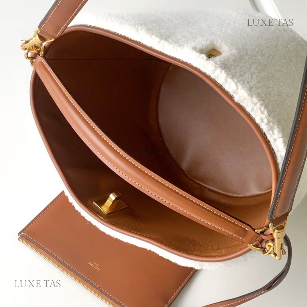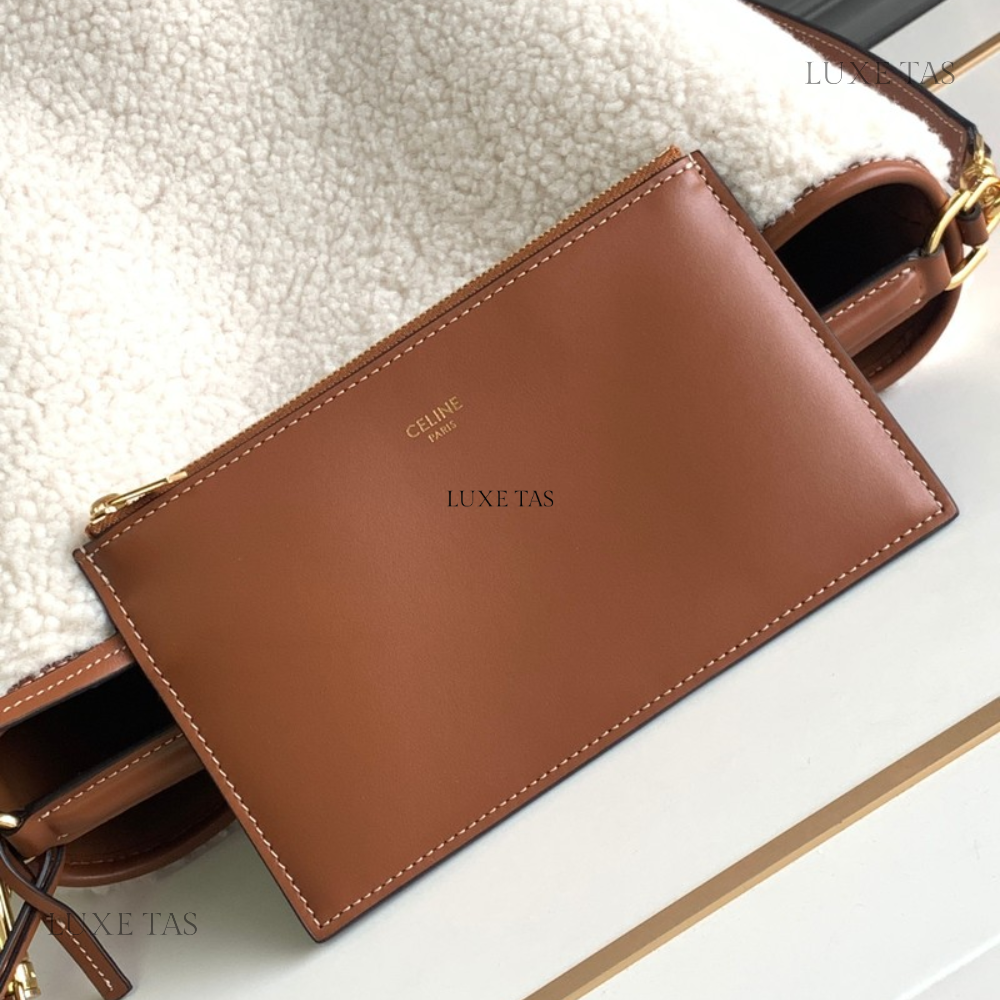 The interior is lined in light beige leather with a "love letter" zipper compartment under the first flap, an "outer" slit pocket under the second flap, and an interior compartment with two open pockets separated by a "lipstick" compartment.