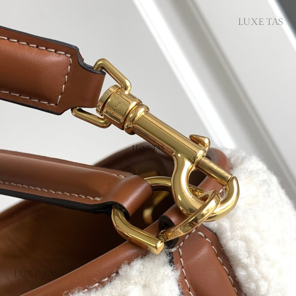 The interior is lined in beige leather with the "love letter" zipper compartment underneath the first flap, an "outer" slit pocket under the second flap, and an interior compartment with two open pockets separated by a "lipstick" compartment.
