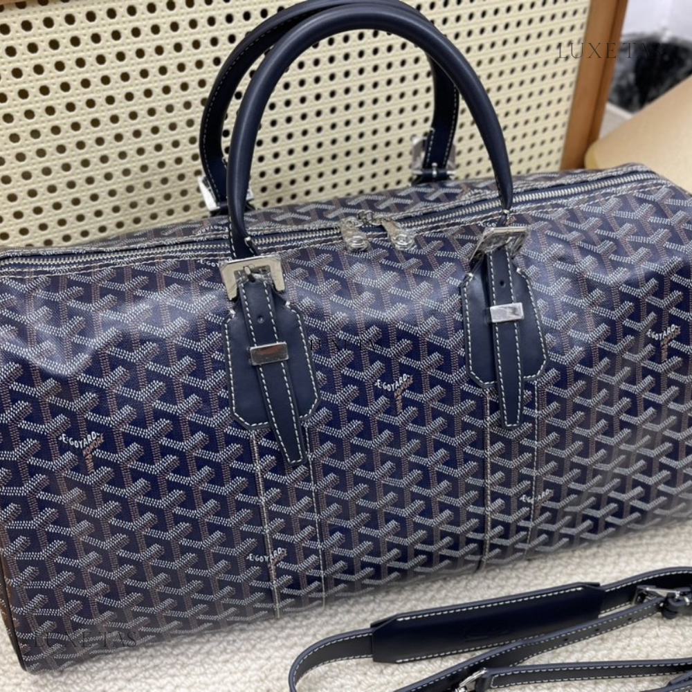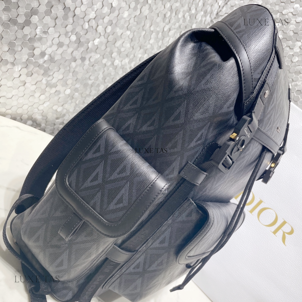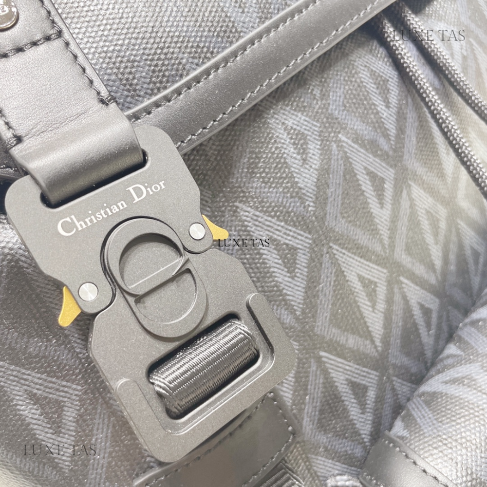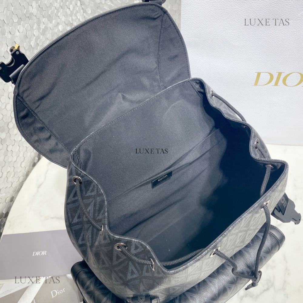 The interior is lined in black grossgrain fabric and has three interior main pockets; one zippered pocket in the middle compartment.