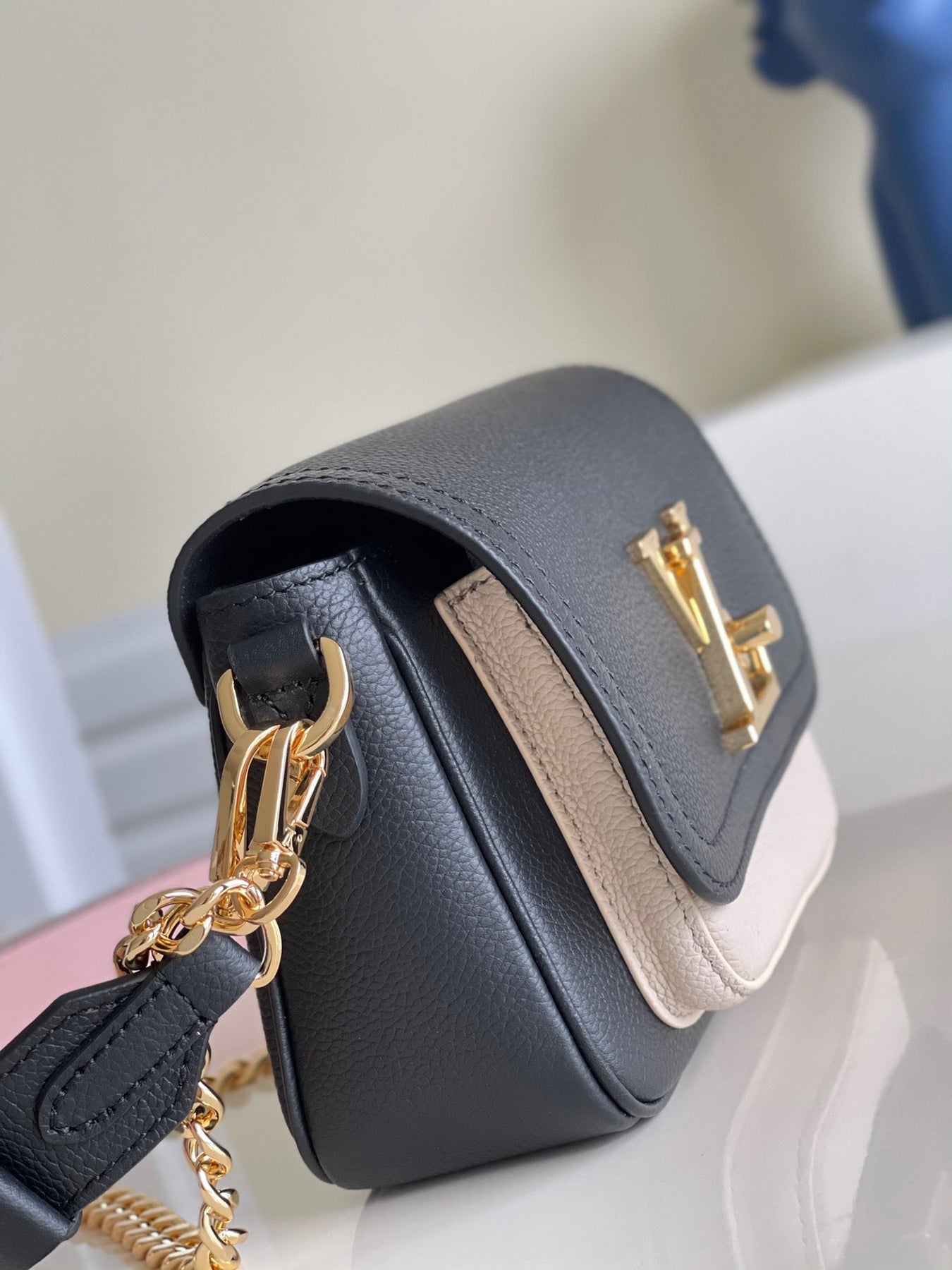 The interior is lined in beige leather and has one interior slip pocket.
