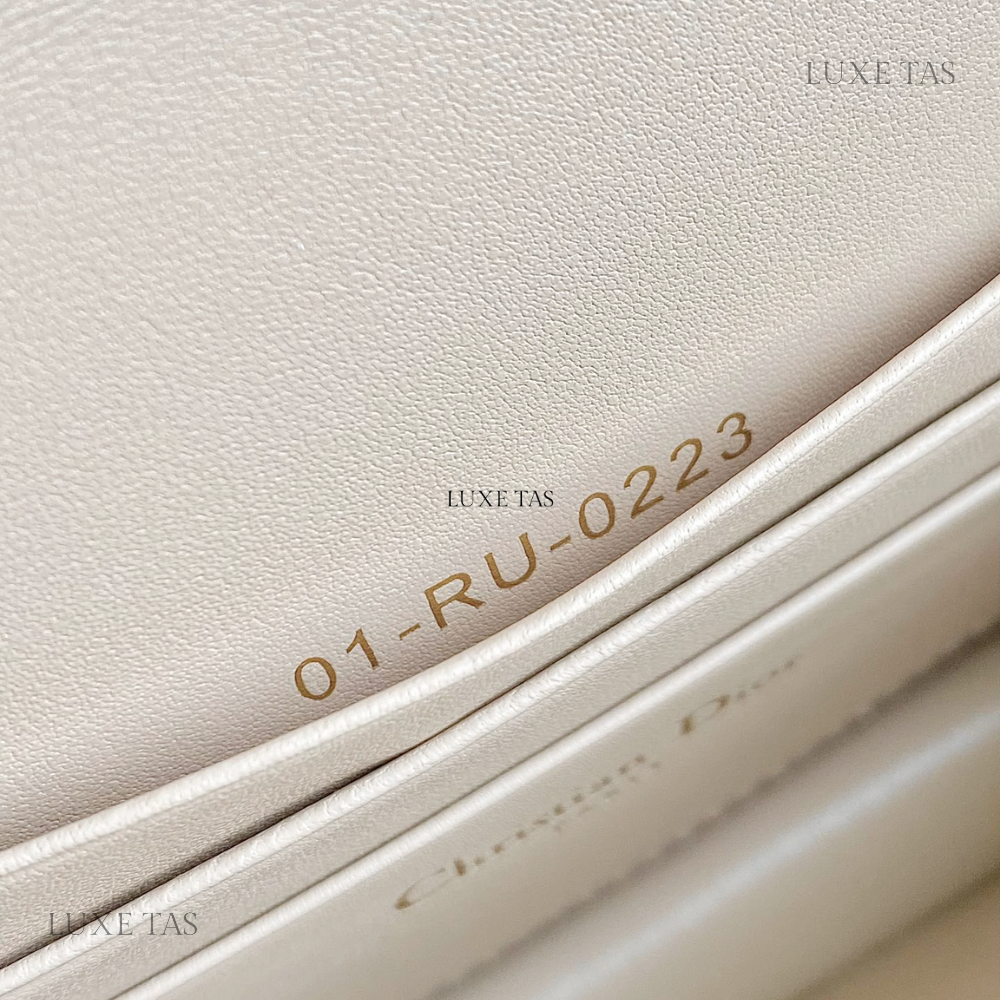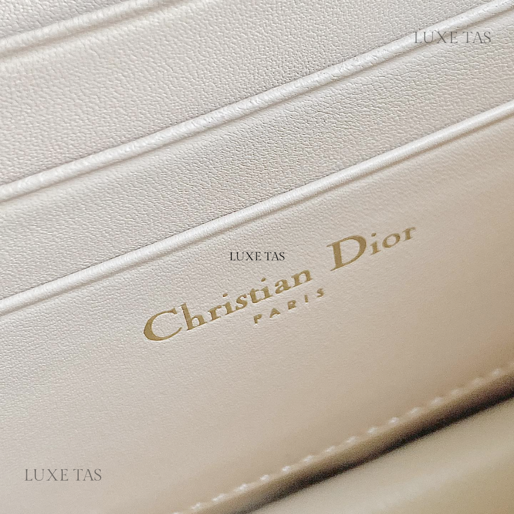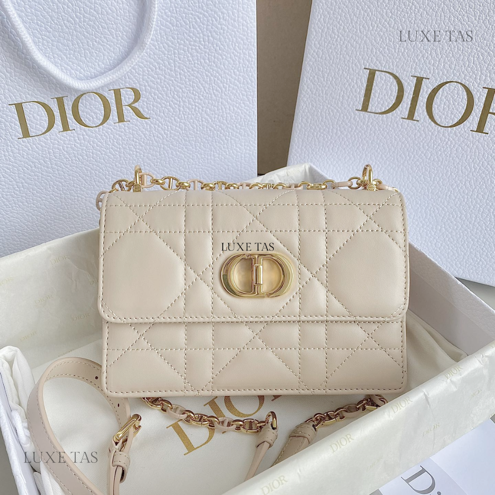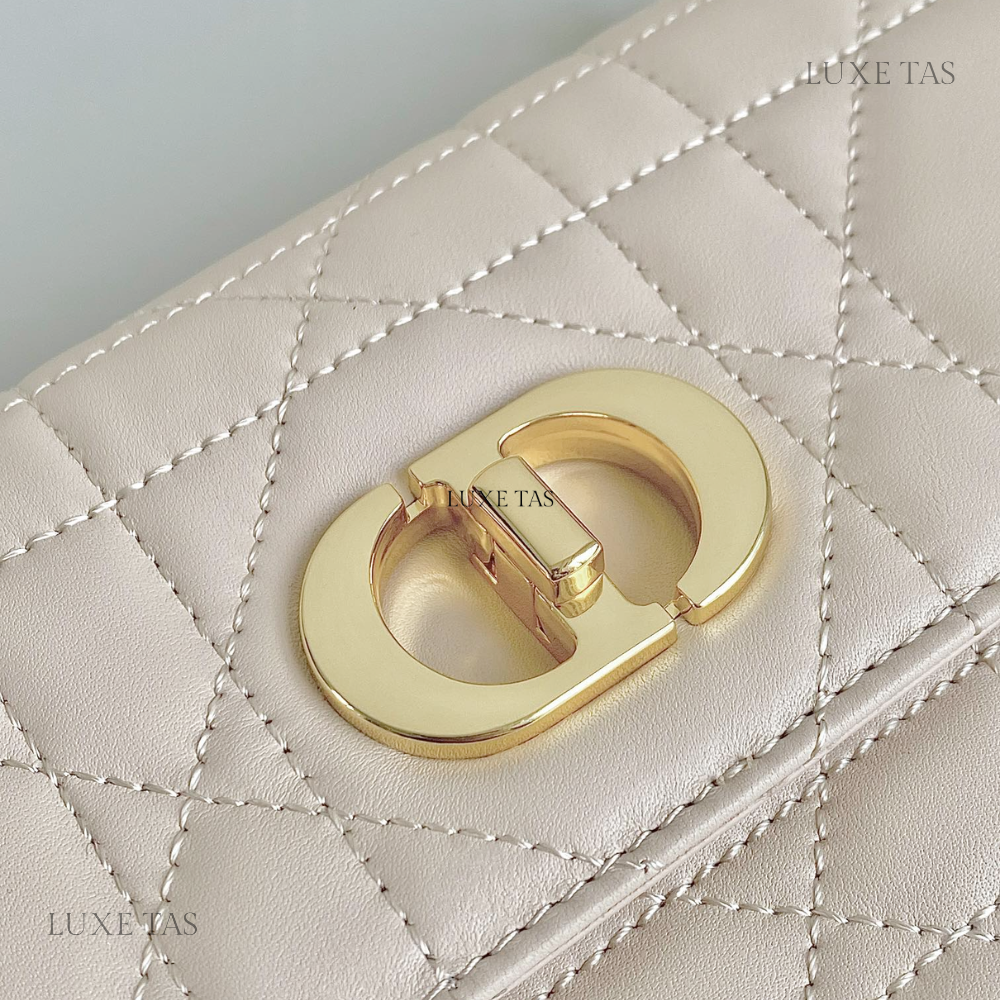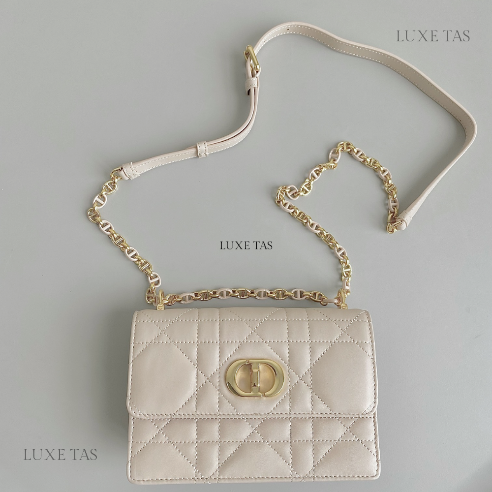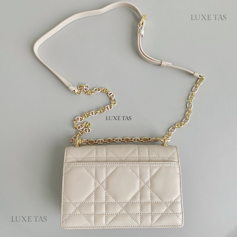 Elevating the Caro line, the Miss Caro mini bag embodies a blend of modernity and timeless charm. Crafted in luxurious powder beige lambskin, it showcases the distinctive Macrocannage stitching for a unique quilted effect. The flap features a captivating gold-finish metal C*D twist clasp, reminiscent of a C*D perfume bottle seal. The adjustable chain shoulder strap, adorned with alternating gold-finish metal and tonal enamel links, ensures comfort whether worn by hand or crossbody.