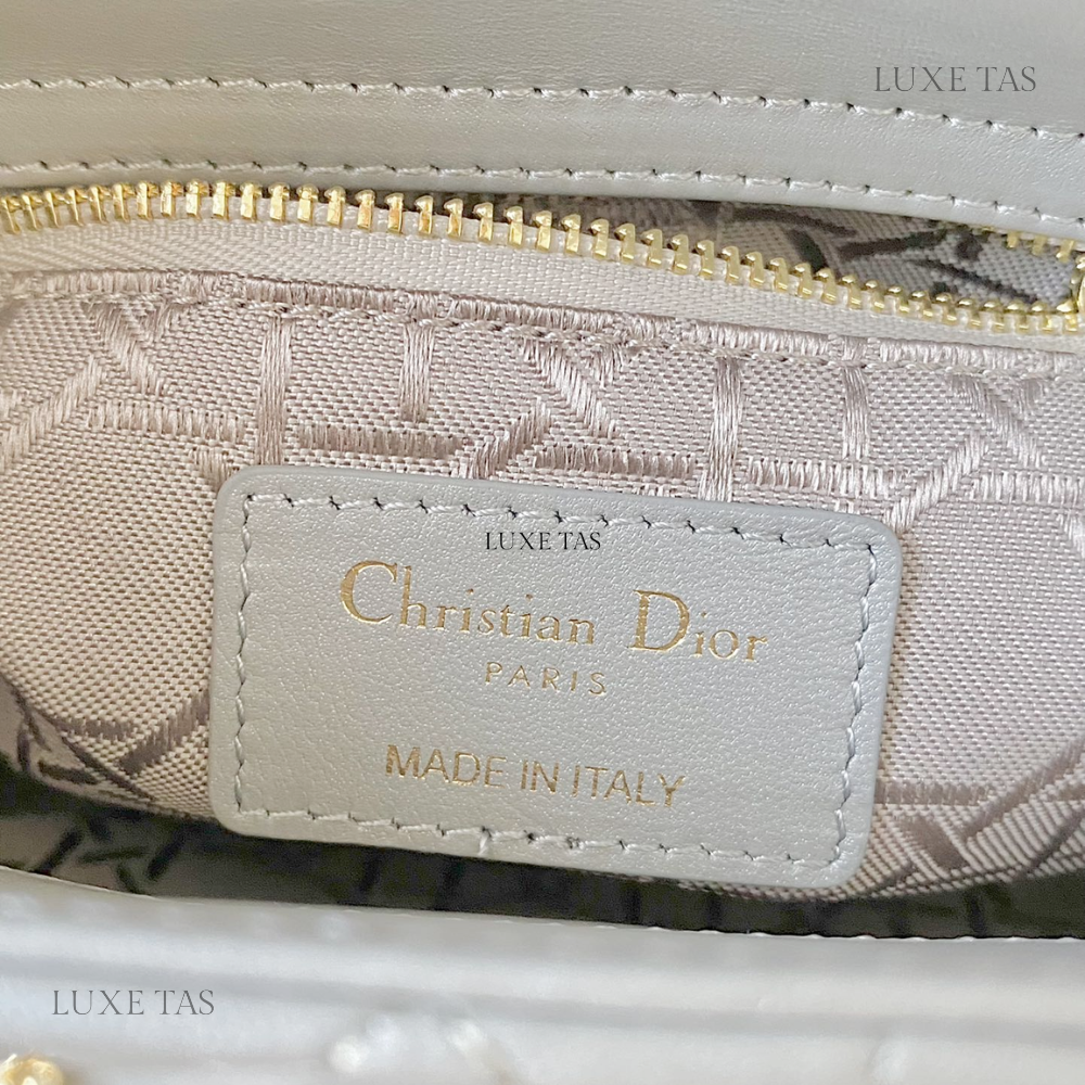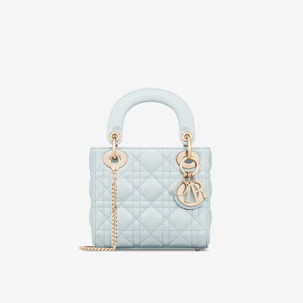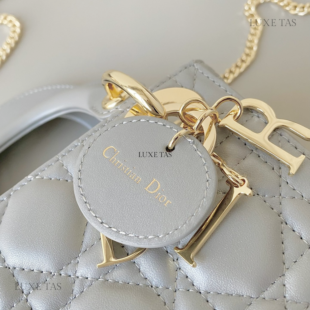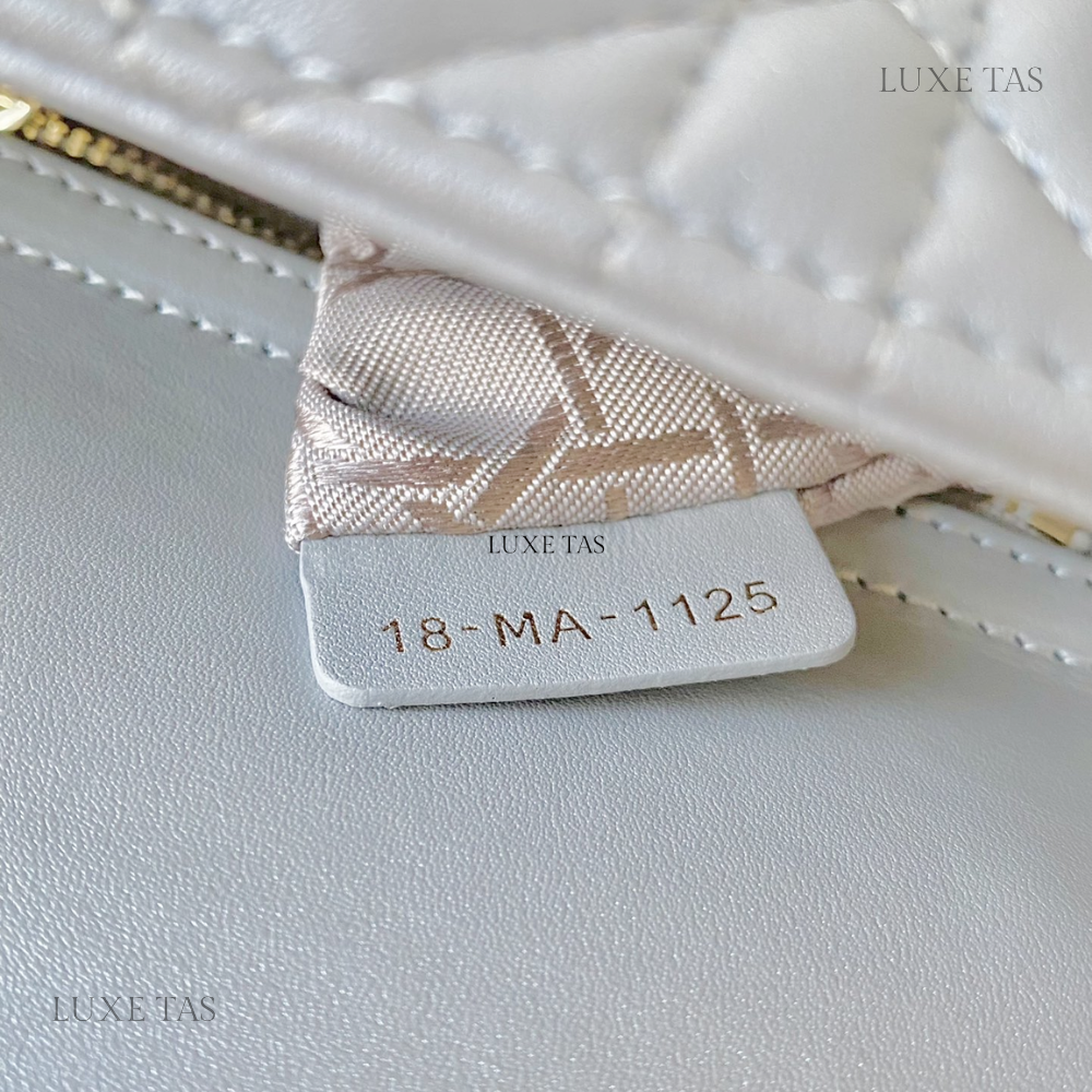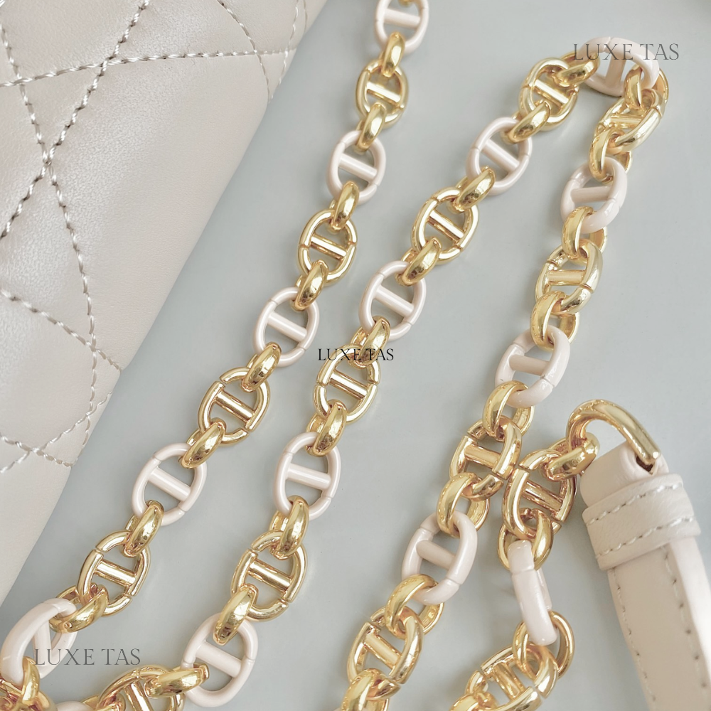 Elevating the Caro line, the Miss Caro mini bag embodies a blend of modernity and timeless charm. Crafted in luxurious powder beige lambskin, it showcases the distinctive Macrocannage stitching for a unique quilted effect. The flap features a captivating gold-finish metal C*D twist clasp, reminiscent of a C*D perfume bottle seal. The adjustable chain shoulder strap, adorned with alternating gold-finish metal and tonal enamel links, ensures comfort whether worn by hand or crossbody.