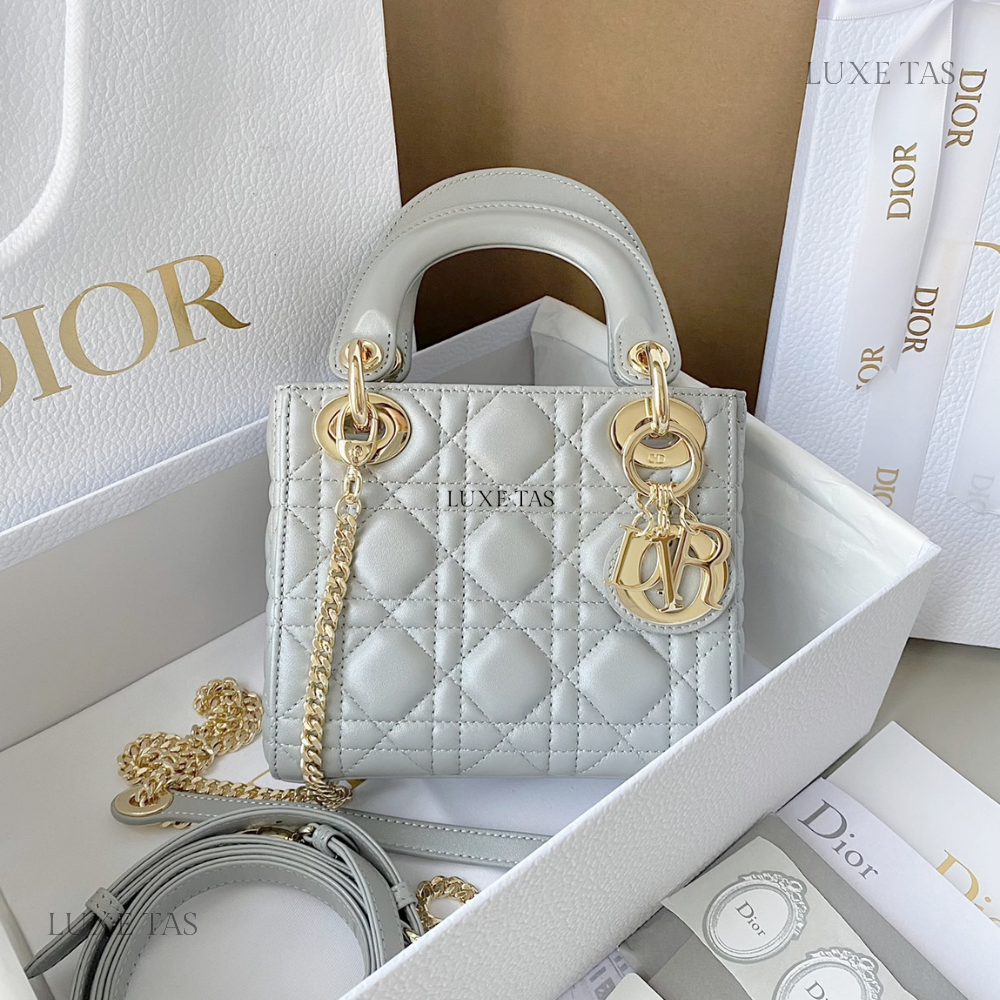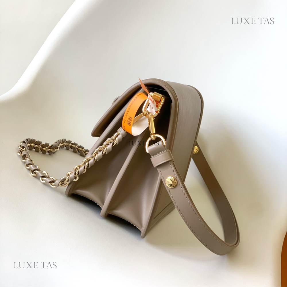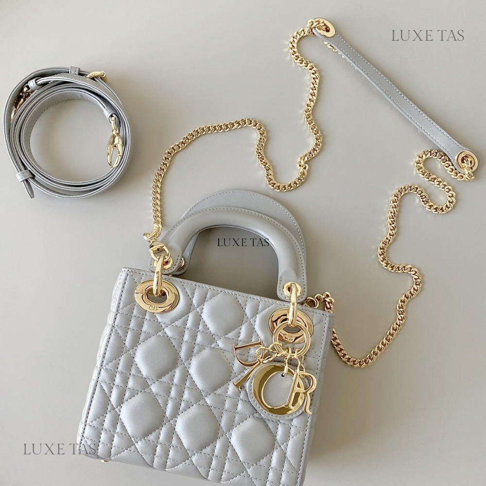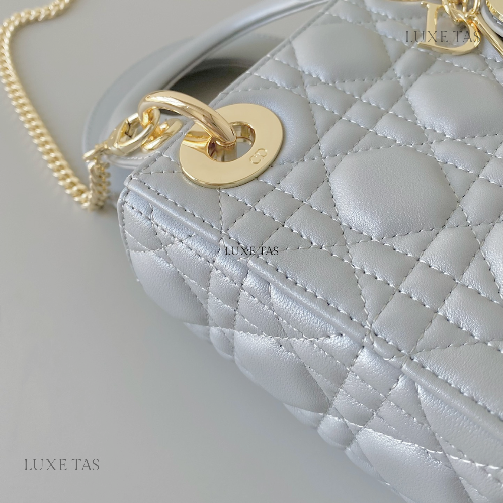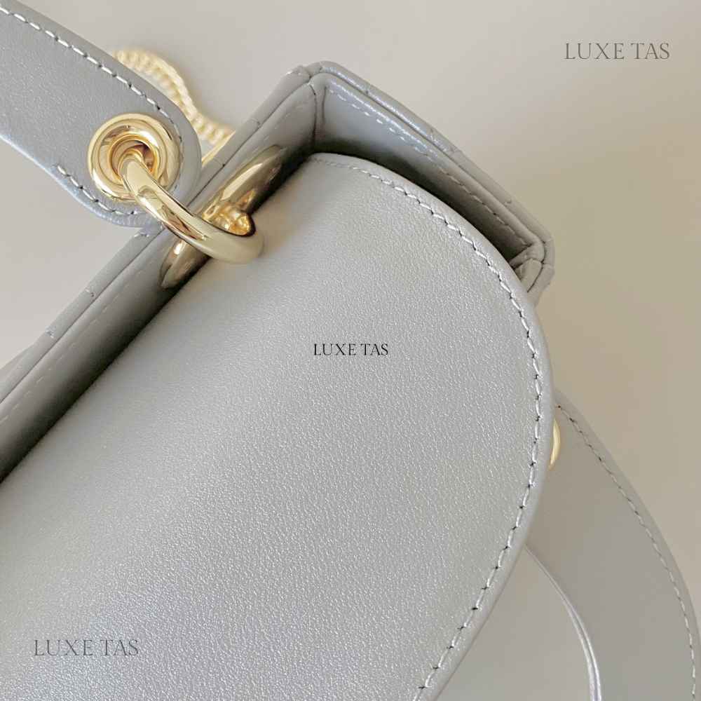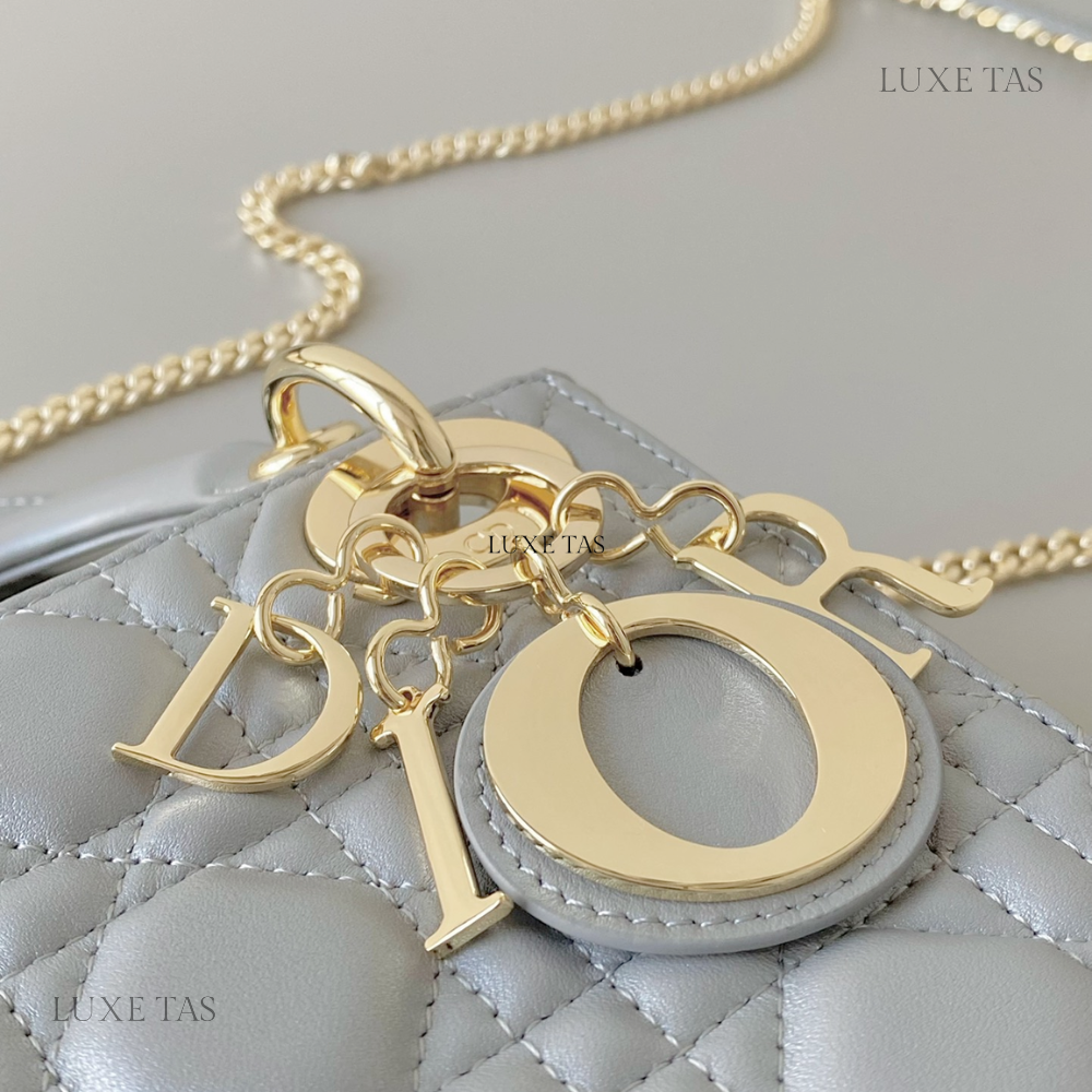 Elevating the Caro line, the Miss Caro mini bag embodies a blend of modernity and timeless charm. Crafted in luxurious powder beige lambskin, it showcases the distinctive Macrocannage stitching for a unique quilted effect. The flap features a captivating gold-finish metal C*D twist clasp, reminiscent of a C*D perfume bottle seal. The adjustable chain shoulder strap, adorned with alternating gold-finish metal and tonal enamel links, ensures comfort whether worn by hand or crossbody.