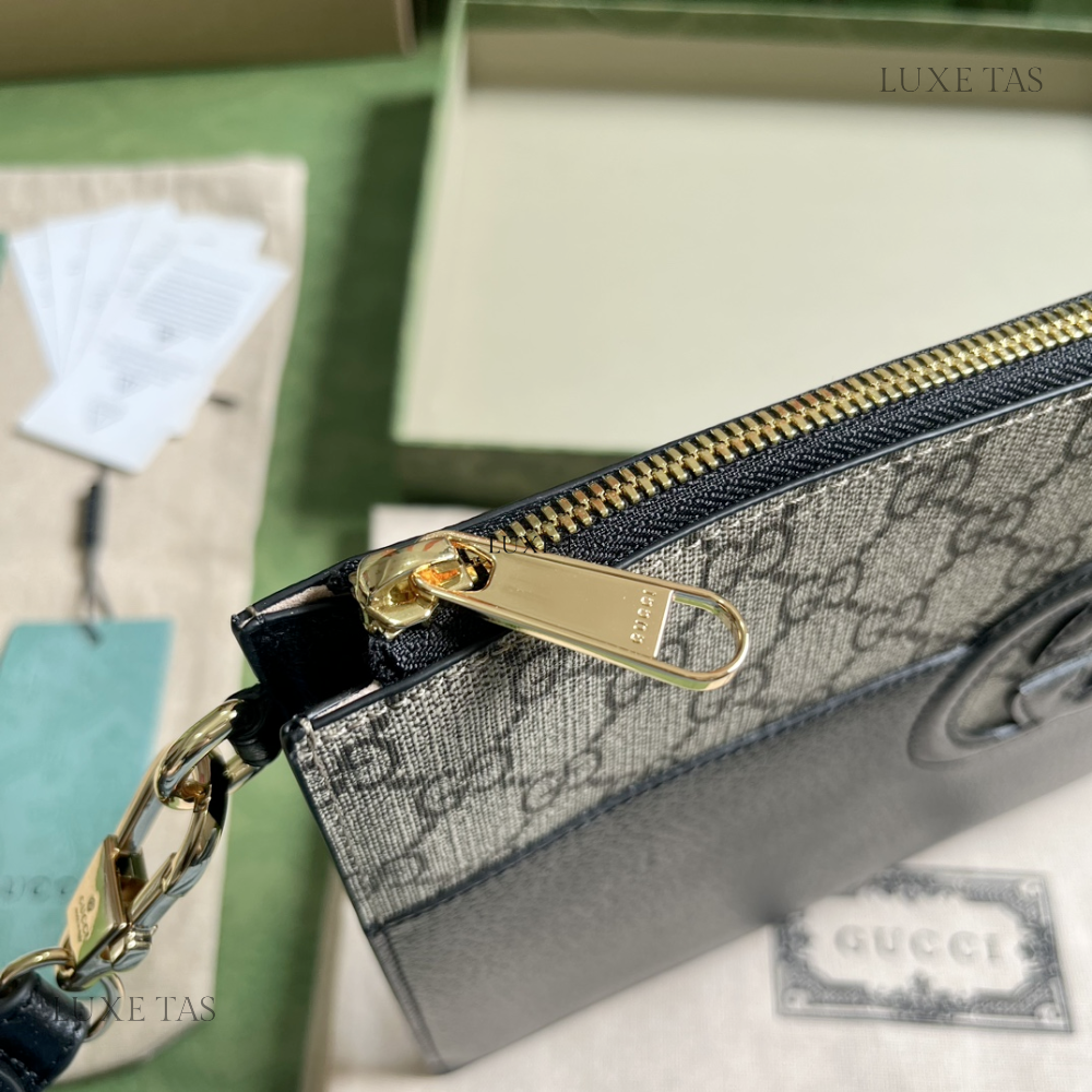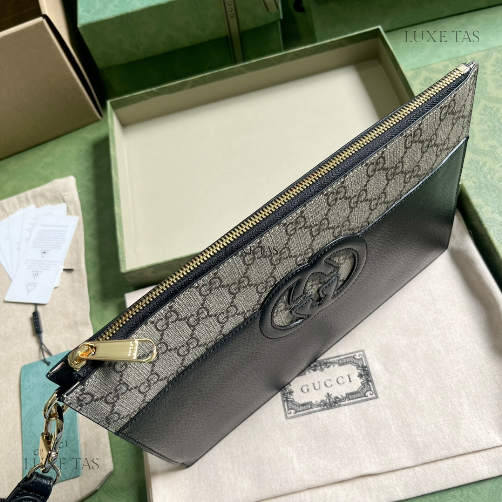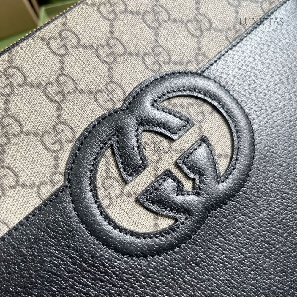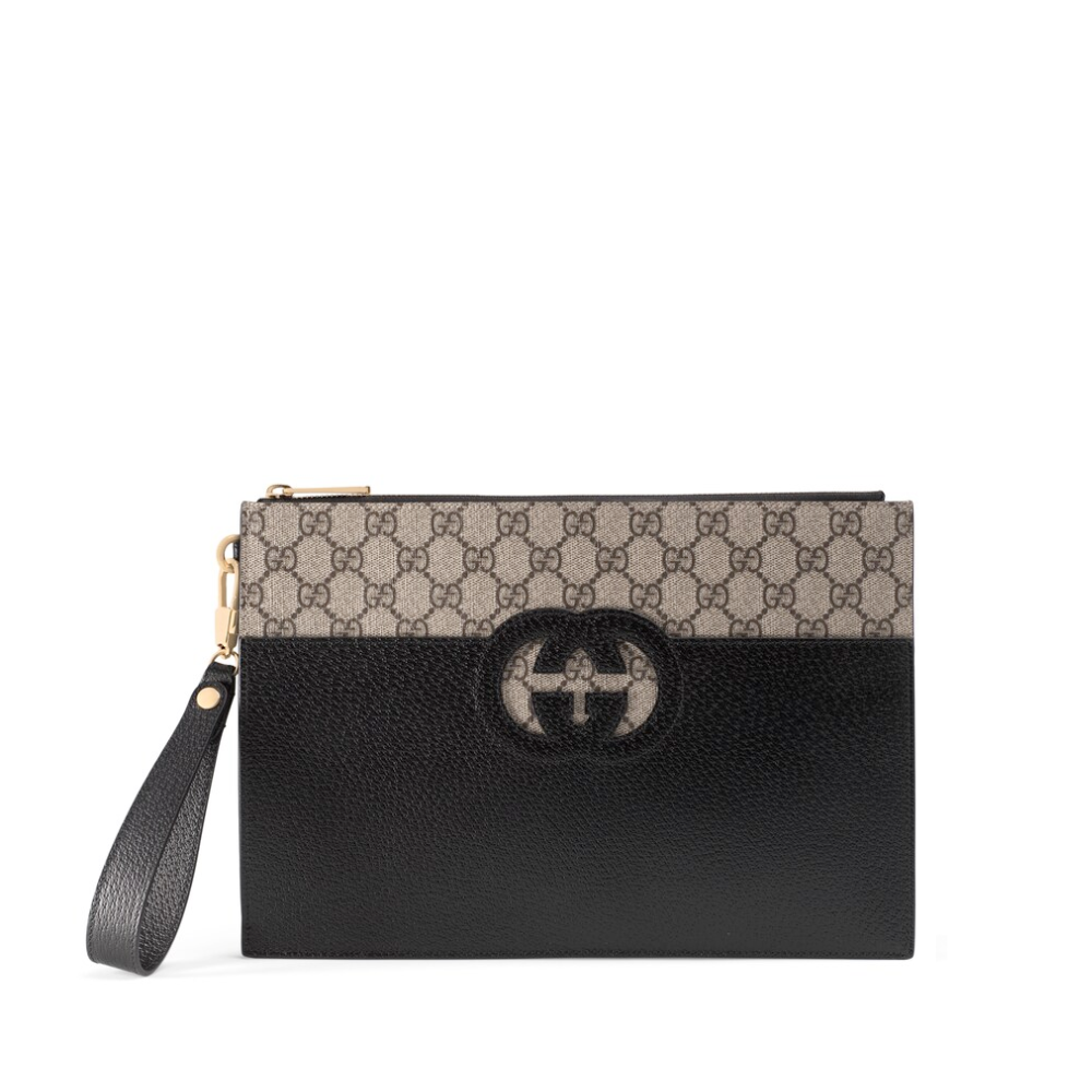 Discover the modern elegance of this exquisite pouch, where a striking cut-out leather Interlocking G detail in black harmoniously merges with the iconic GG Supreme canvas. A contemporary take on a timeless classic, this accessory showcases the enduring charm of Gucci's signature Interlocking G emblem. Symbolic of Founder Guccio Gucci's initials, the iconic Interlocking G has graced Gucci collections since the 1960s, continuously evolving in various captivating forms and interpretations. Embrace the heritage and sophistication of Gucci with this artful combination of luxurious materials and timeless design.