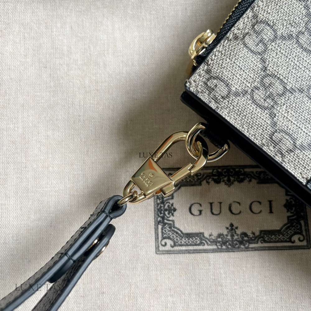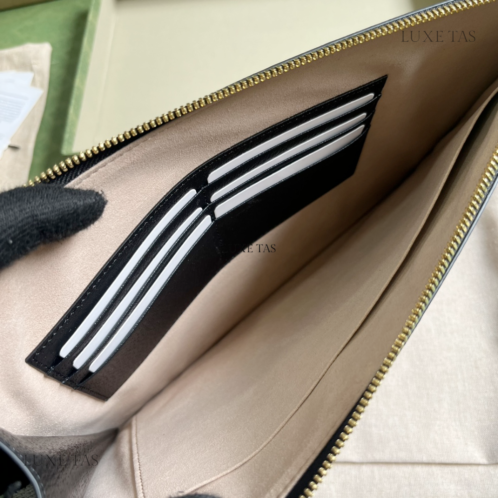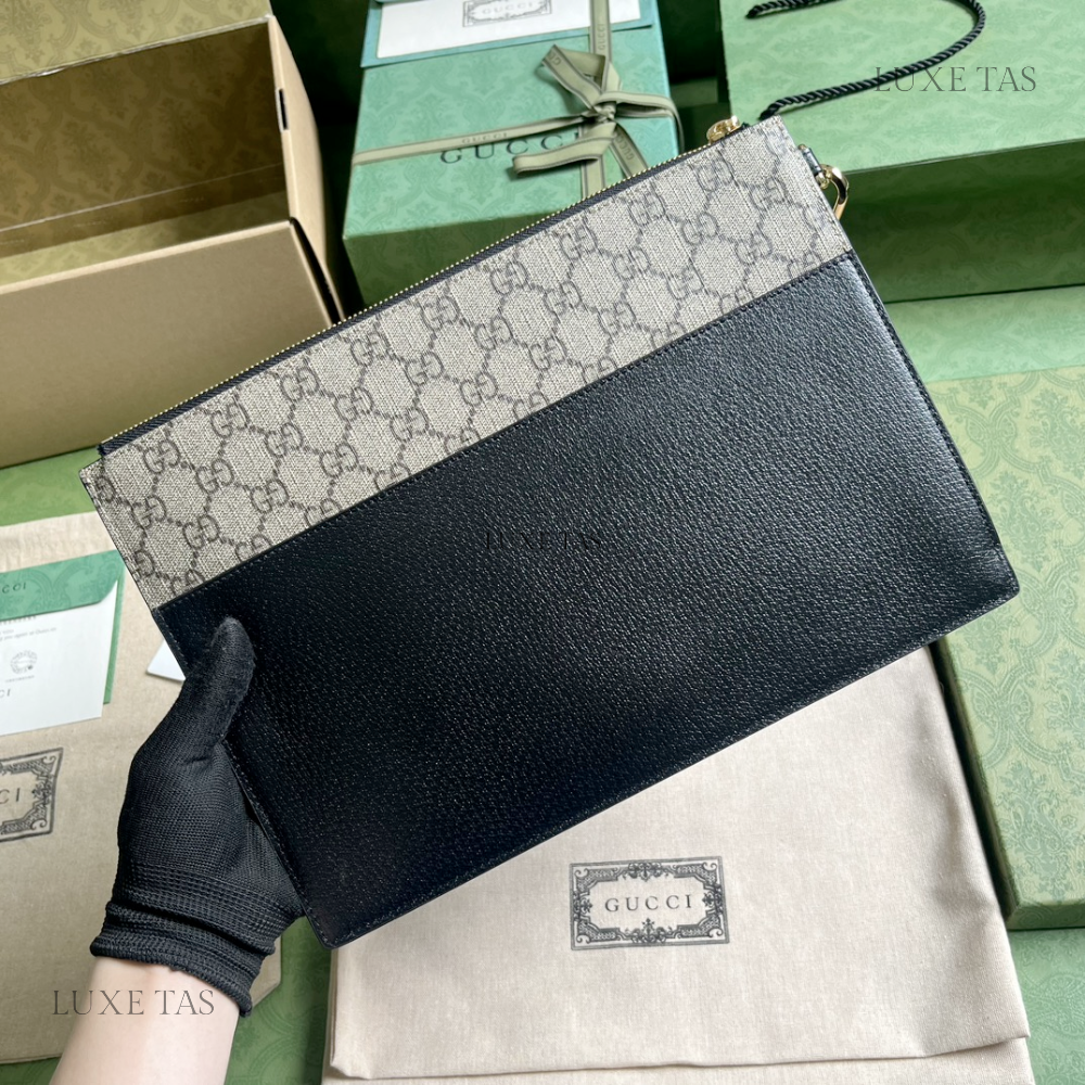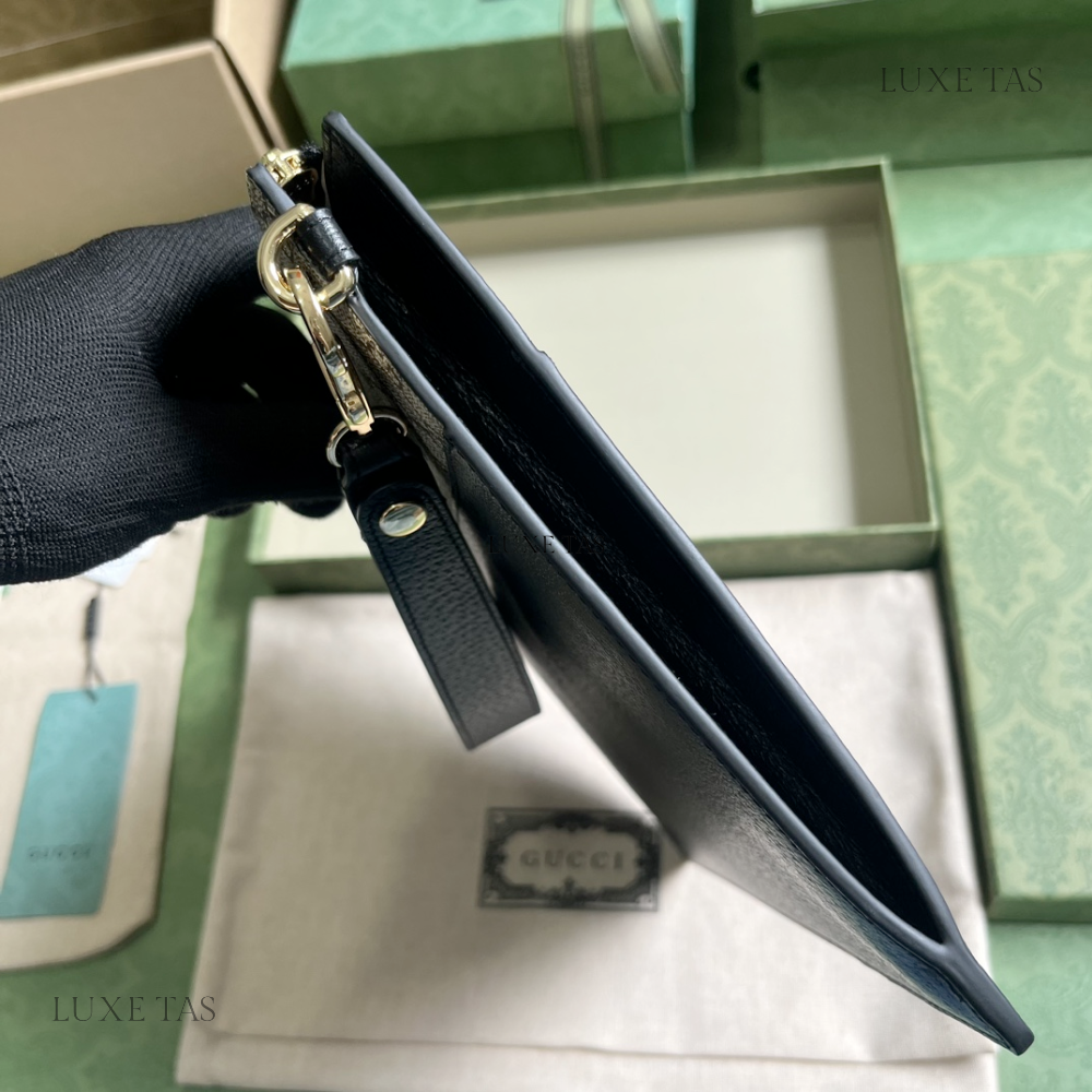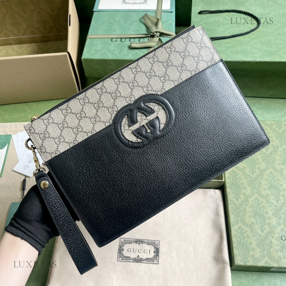 Discover the modern elegance of this exquisite pouch, where a striking cut-out leather Interlocking G detail in black harmoniously merges with the iconic GG Supreme canvas. A contemporary take on a timeless classic, this accessory showcases the enduring charm of Gucci's signature Interlocking G emblem. Symbolic of Founder Guccio Gucci's initials, the iconic Interlocking G has graced Gucci collections since the 1960s, continuously evolving in various captivating forms and interpretations. Embrace the heritage and sophistication of Gucci with this artful combination of luxurious materials and timeless design.