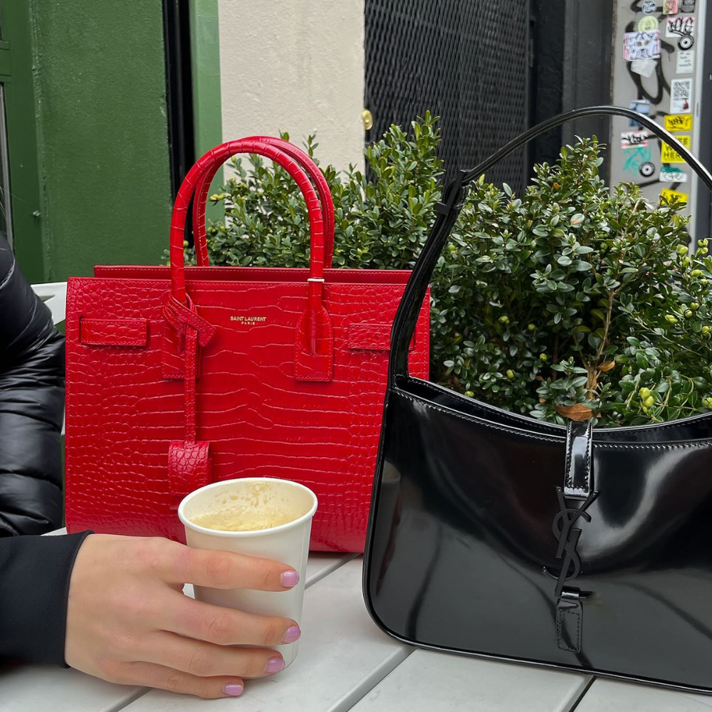 Details - Tote Shoulder Bag by Saint Laurent, double flat top handles, leather keychain detail applied at the base of the handle, iconic brand signature press-stamped on the front, interior magnetic closure, removable pouch inside the bag with zip closure.